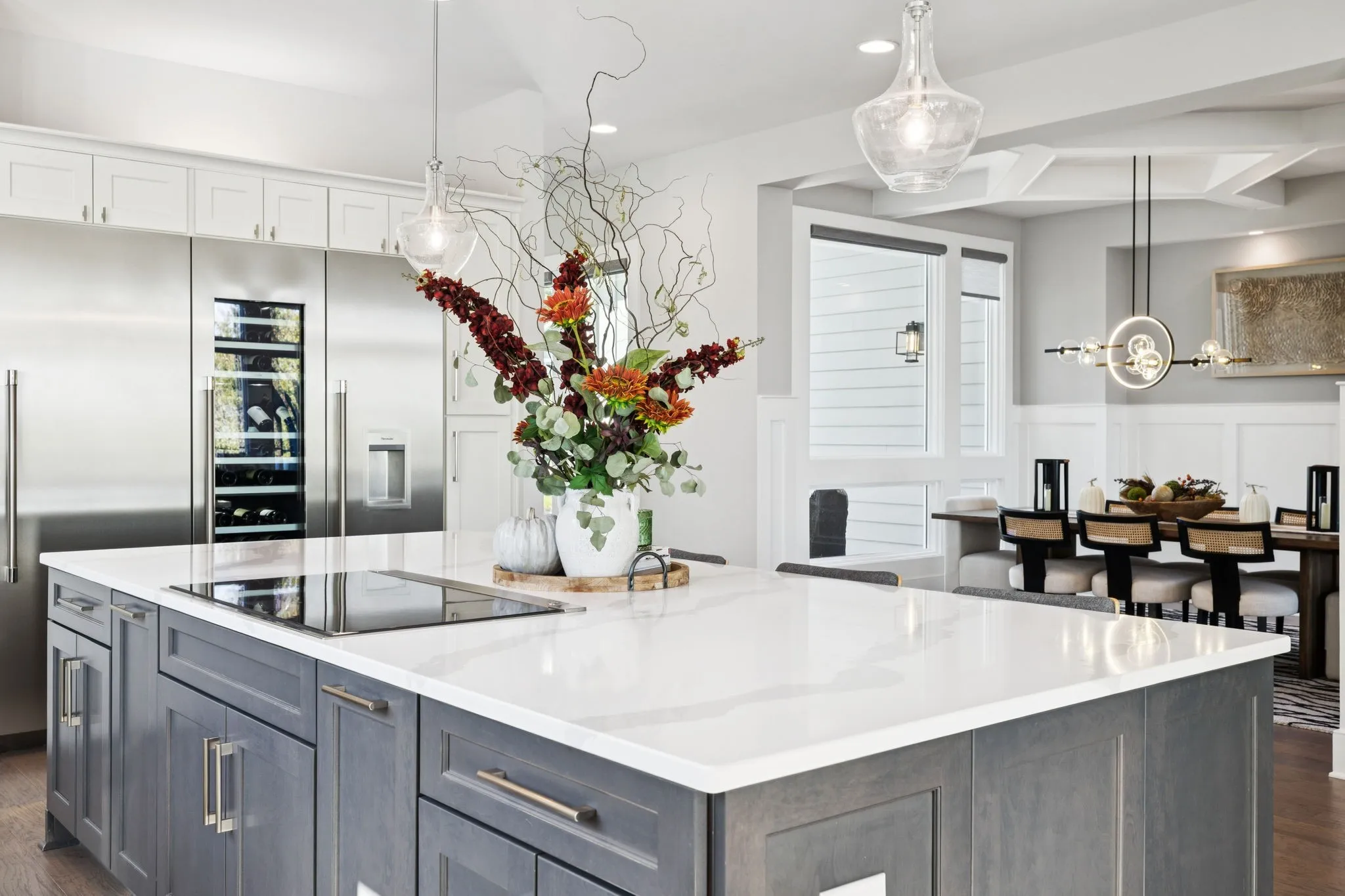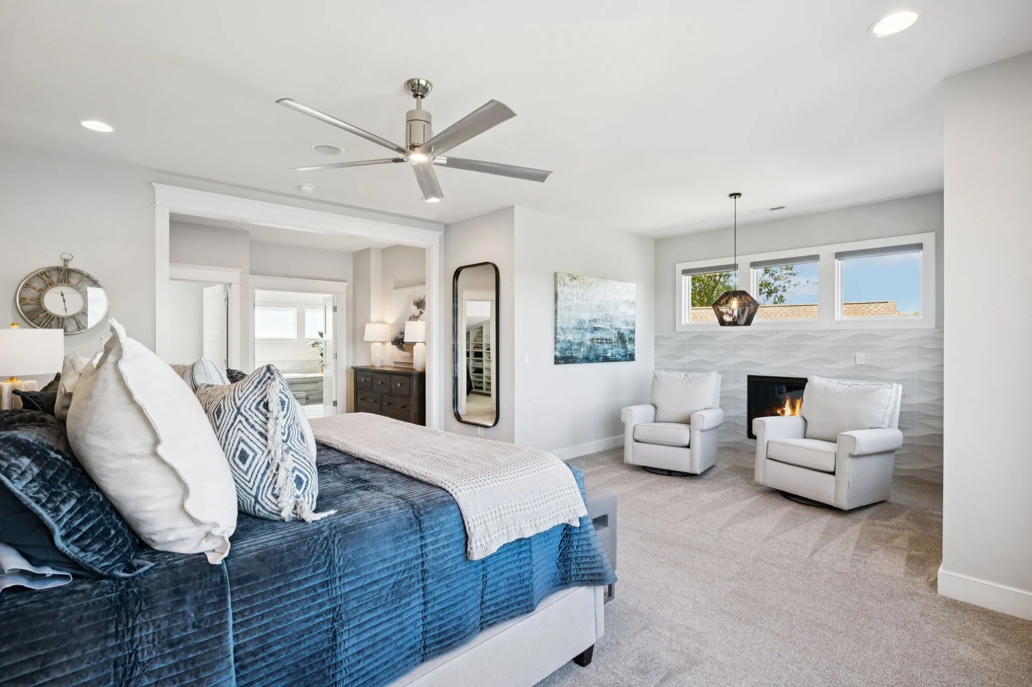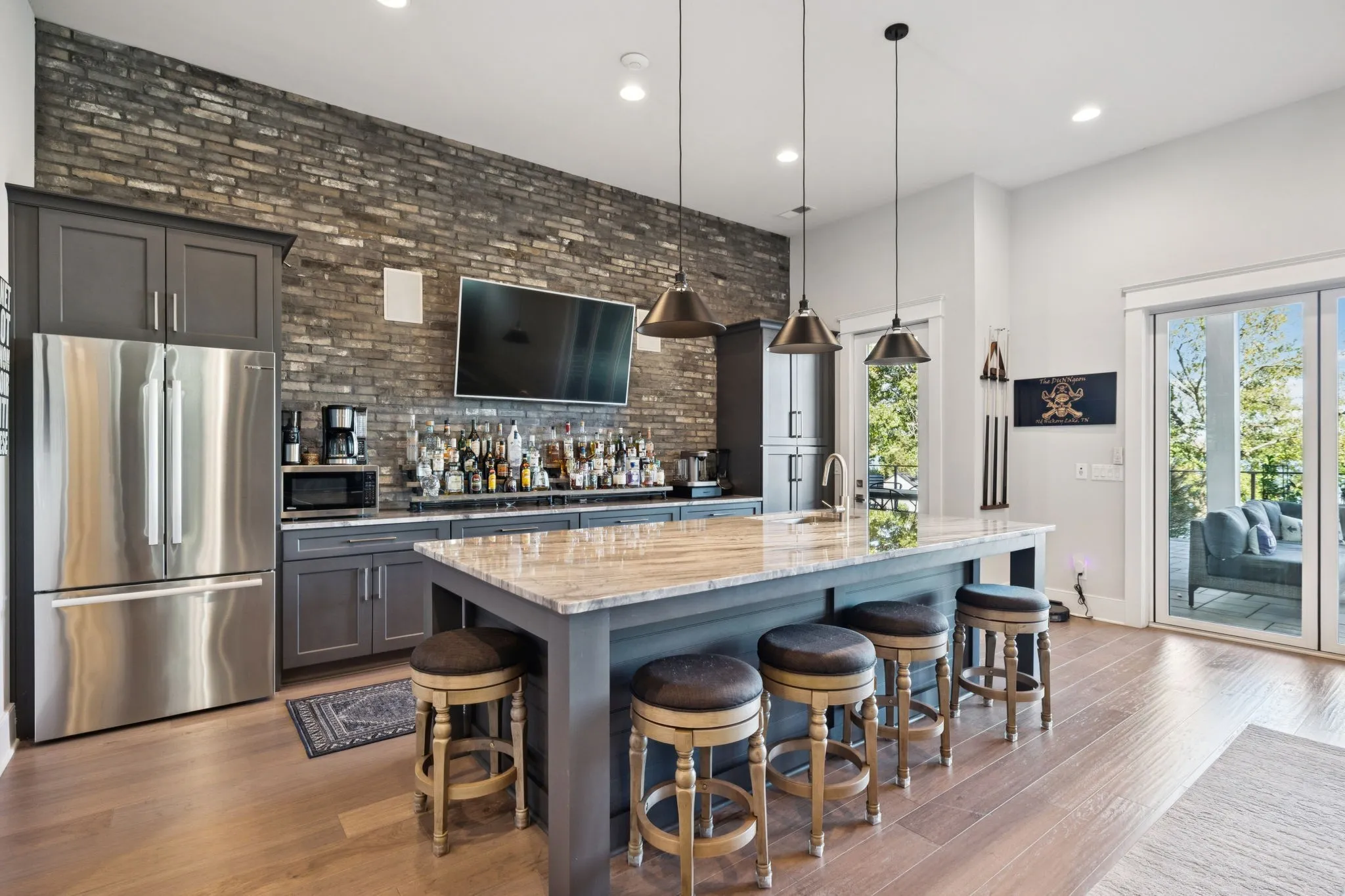 Inside, designer finishes elevate every space. The show-stopping kitchen features quartz countertops, premium Thermador appliances, and double ovens, seamlessly connecting to the main living area where a marble fireplace and panoramic lake views create a stunning focal point. The primary suite is a private retreat with a spa-inspired bath complete with a soaking tub, glass-enclosed shower, and dual vanities.