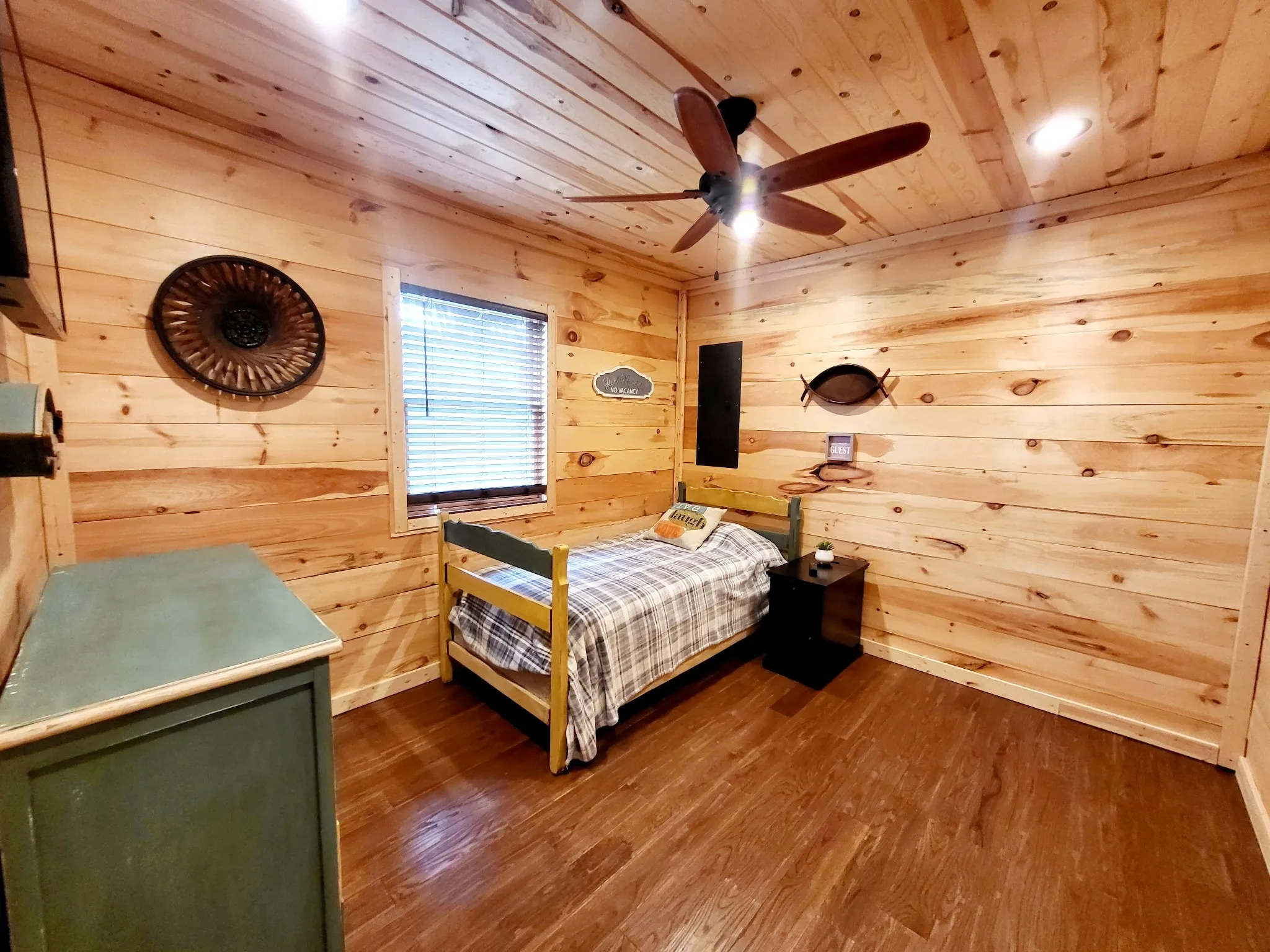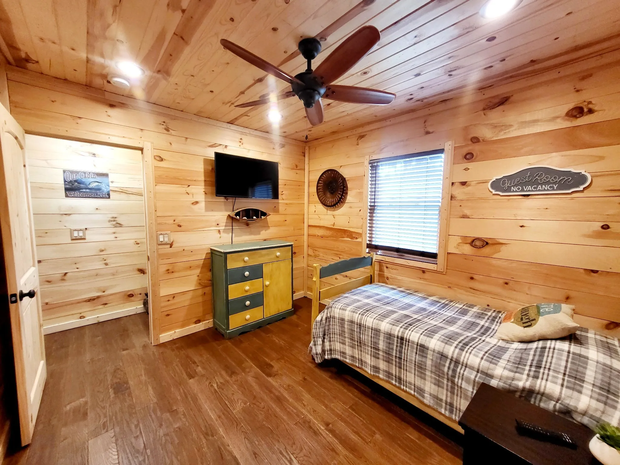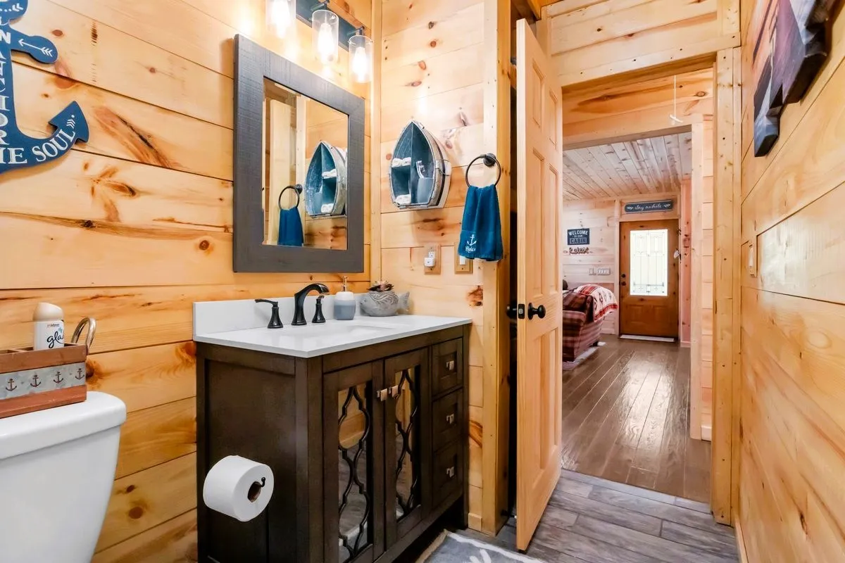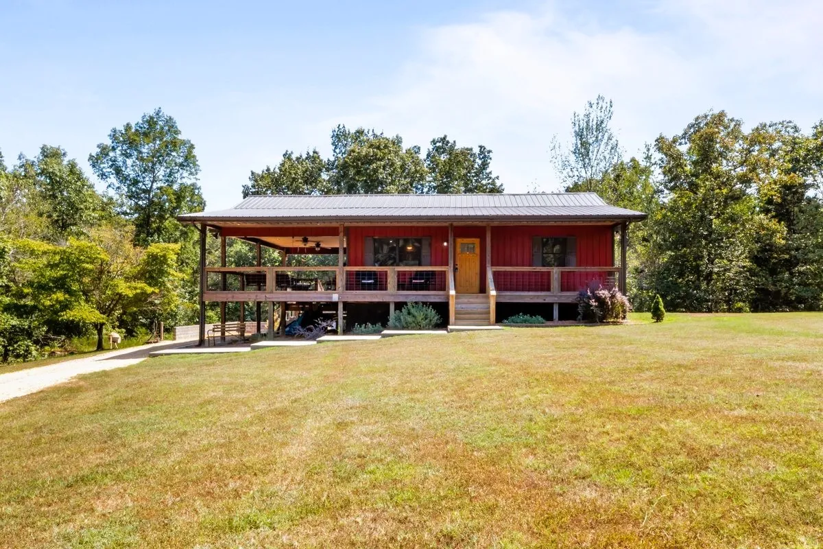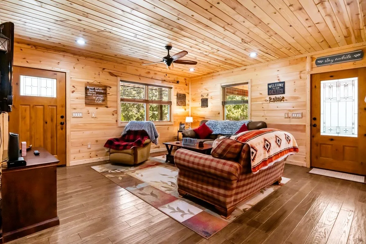 This custom-built cabin, ideally situated near the lake at the end of a quiet cul-de-sac, embodies rustic elegance with a contemporary twist. The design thoughtfully integrates the indoors and outdoors, offering nearly equal living space in both areas, perfect for enjoying the serene natural surroundings. Step inside to discover a warm, inviting interior characterized by rich, natural wood finishes that flow throughout the open-concept floor plan, creating a seamless and cozy atmosphere. The design emphasizes spaciousness and natural light, while the extensive outdoor living areas provide the perfect sanctuary for relaxation or entertainment, offering plentiful space for al fresco dining, lounging, and soaking in the peaceful lake proximity.