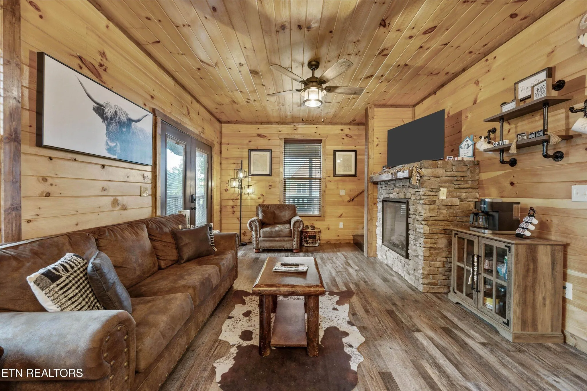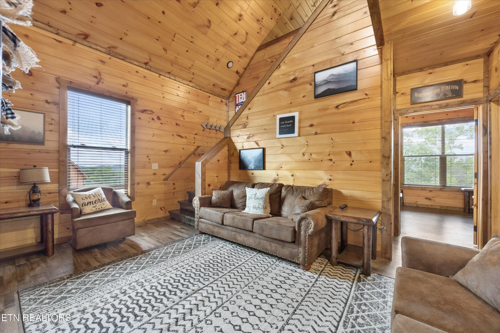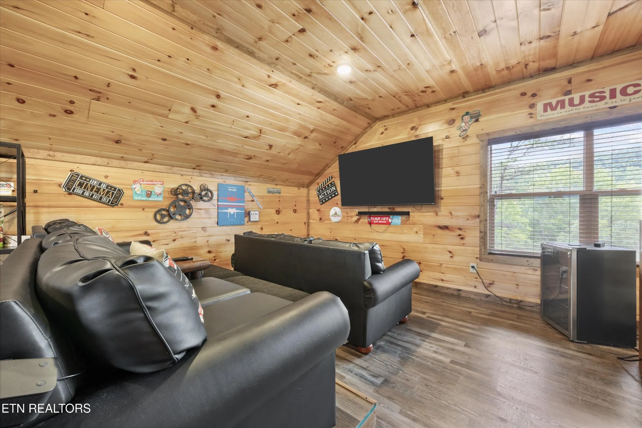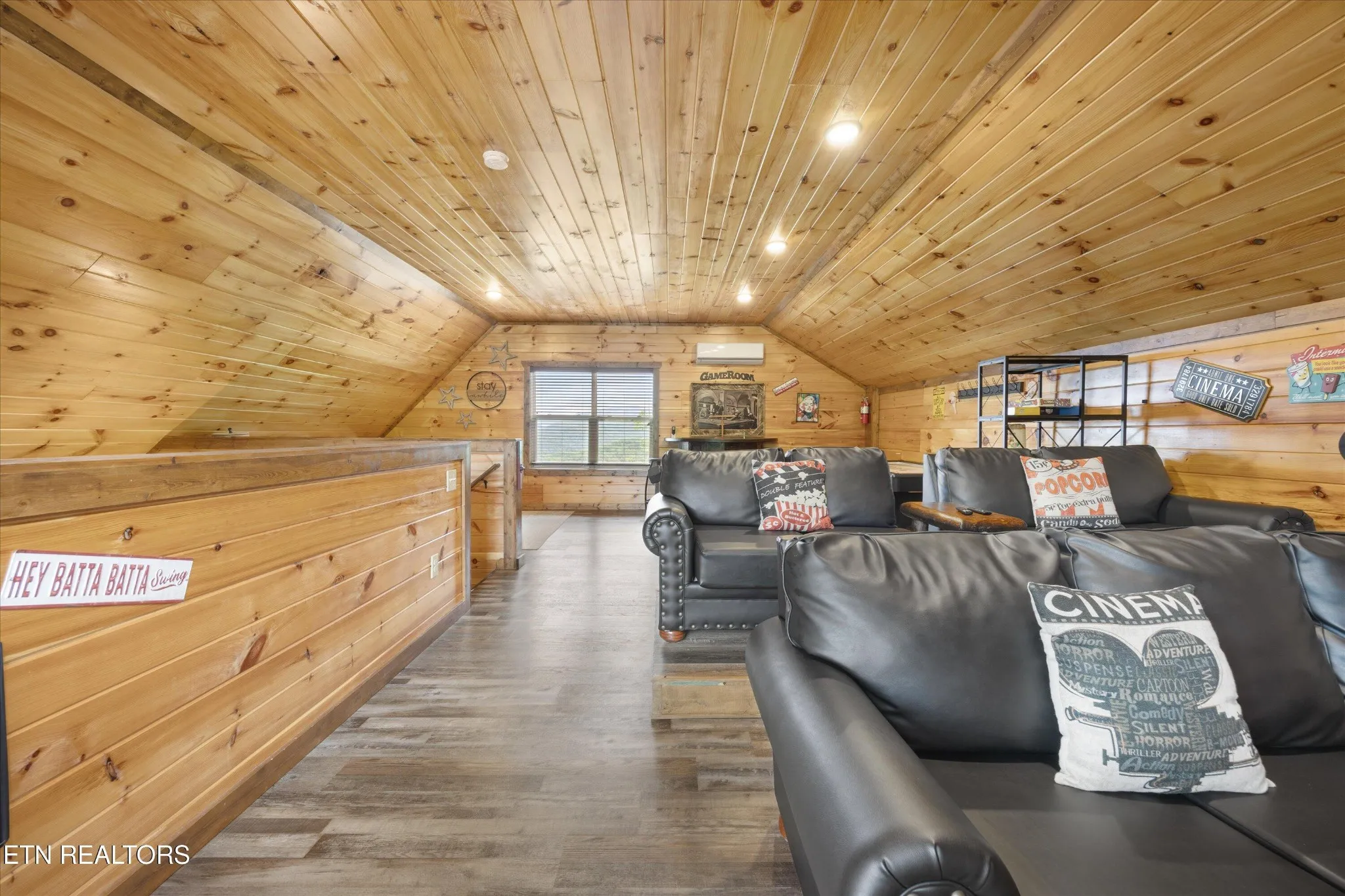 The third-floor loft is an entertainer’s dream — complete with a movie and game room that provides the ultimate space for family fun and memory-making. Whether you’re hosting game nights or relaxing with a film, this space is the heart of the cabin.