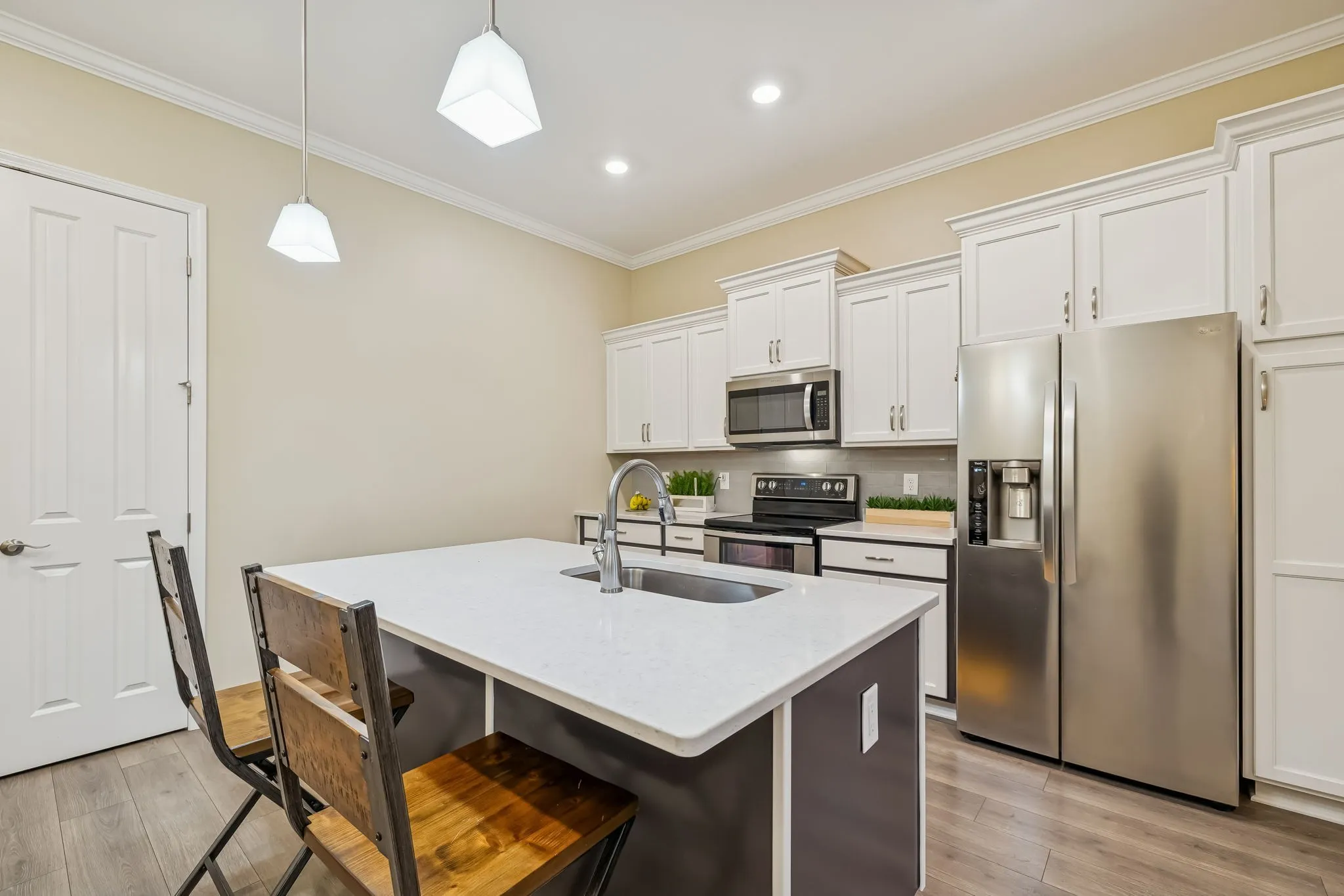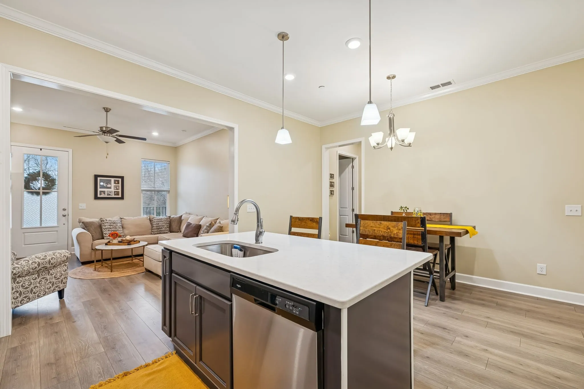 Stately first-floor 2BR/2BA condo with soaring ceilings and an 8×27 covered porch that brings your indoor living outdoors while overlooking wooded common land. Turnkey and meticulously cared for, this home features marble countertops, crown molding, 6″ baseboards, bright white cabinetry, and luxury vinyl plank flooring throughout with hypoallergenic carpet in primary bedroom.
