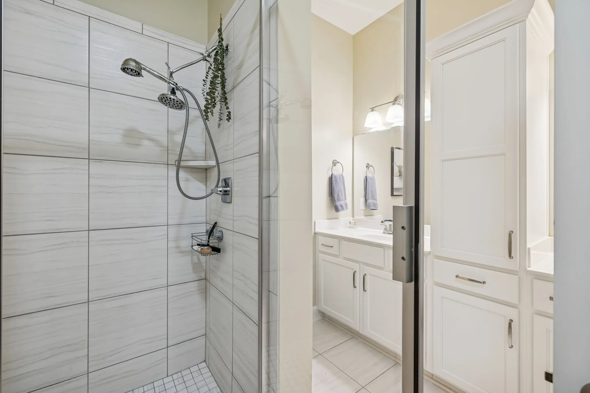 The secluded primary suite offers private ingress/egress, patio access, a walk-in closet, and a luxury bath with double-sink vanity and a 4′ tile and glass shower. Split bedroom layout provides a private secondary bedroom and bath for guests or office use. Designed with accessibility in mind, enjoy 36″ doors and handicap-accessible flow throughout, plus convenient rear entry to assigned upper-deck parking.