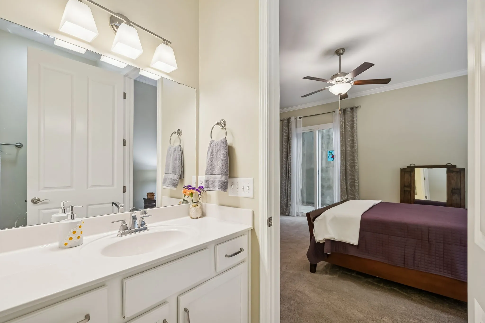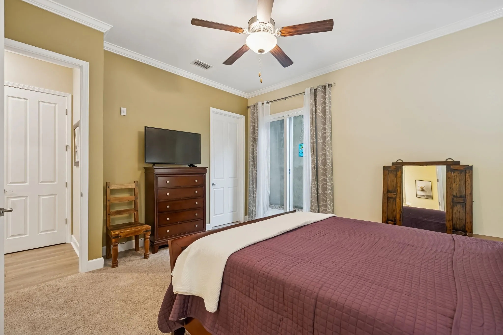 The secluded primary suite offers private ingress/egress, patio access, a walk-in closet, and a luxury bath with double-sink vanity and a 4′ tile and glass shower. Split bedroom layout provides a private secondary bedroom and bath for guests or office use. Designed with accessibility in mind, enjoy 36″ doors and handicap-accessible flow throughout, plus convenient rear entry to assigned upper-deck parking.