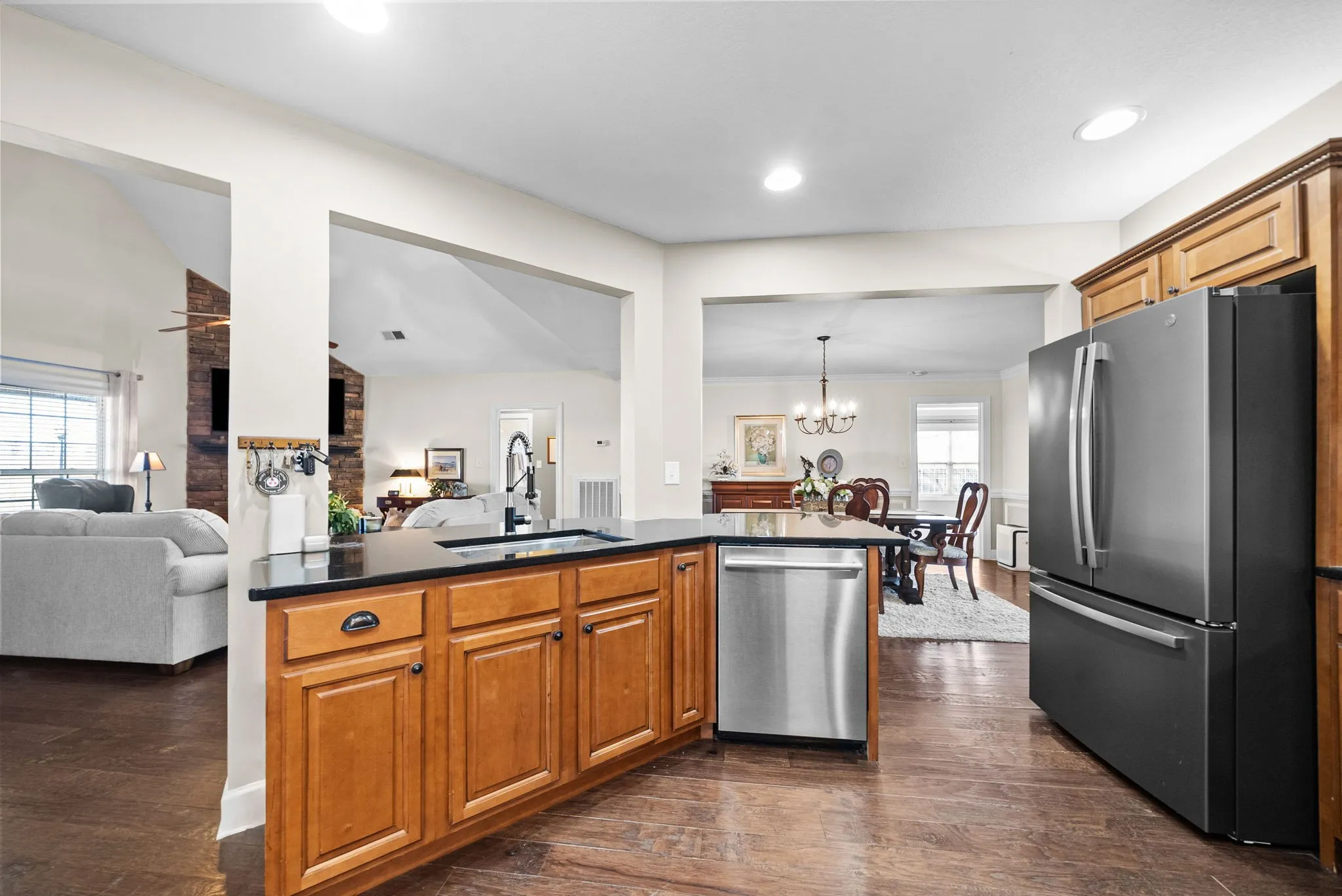 Welcome to this pristine RANCH style craftsmen home on a large corner lot, tucked away in the sought after Hickory Wild community, complete with a NEW ROOF and walking distance from the COMMUNITY POOL! This home features 3 bedrooms on the MAIN LEVEL w/ 2 FULL bathrooms, plus a large BONUS/4th BEDROOM w/ attached FULL bathroom and tons of closet space upstairs. The main level has beautiful vaulted ceilings, an open layout, floor to ceiling stone fireplace, wood floors, fully renovated kitchen with granite, upgraded tile backsplash, stainless steel appliances, GAS STOVE, and upgraded lighting throughout! The primary bedroom is spacious, not to mention the HUGE primary bathroom and closet space. The pictures and videos really don’t do it justice and you will want to see this one in person to truly understand how perfectly maintained and spacious it is! The back yard is fenced in and you can enjoy the evenings relaxing on the covered back patio. Make sure to check out the community AMENITIES which include a community POOL, fitness center, CLUBHOUSE, sidewalks, playground, 2 pavilions, and WEEKLY LAWN CARE – lawn mowing and maintenance!! All with no city taxes!! For more information, check out the VIRTUAL TOUR and website as well!
