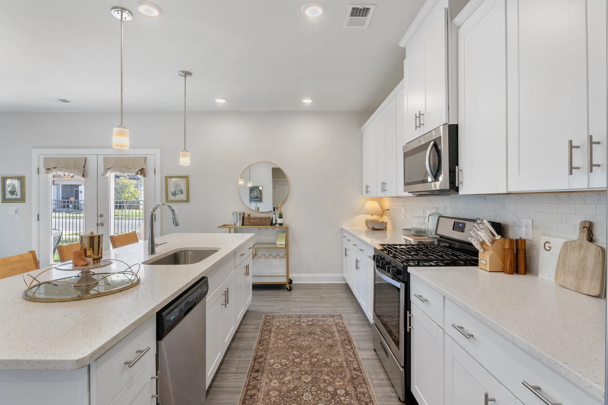 The main level showcases a spacious open-concept design ideal for daily living and entertaining. The living room centers around a shiplap-accented fireplace and flows seamlessly into a dining area designed for gatherings. The kitchen impresses with a statement island, gas range, and a large pantry.