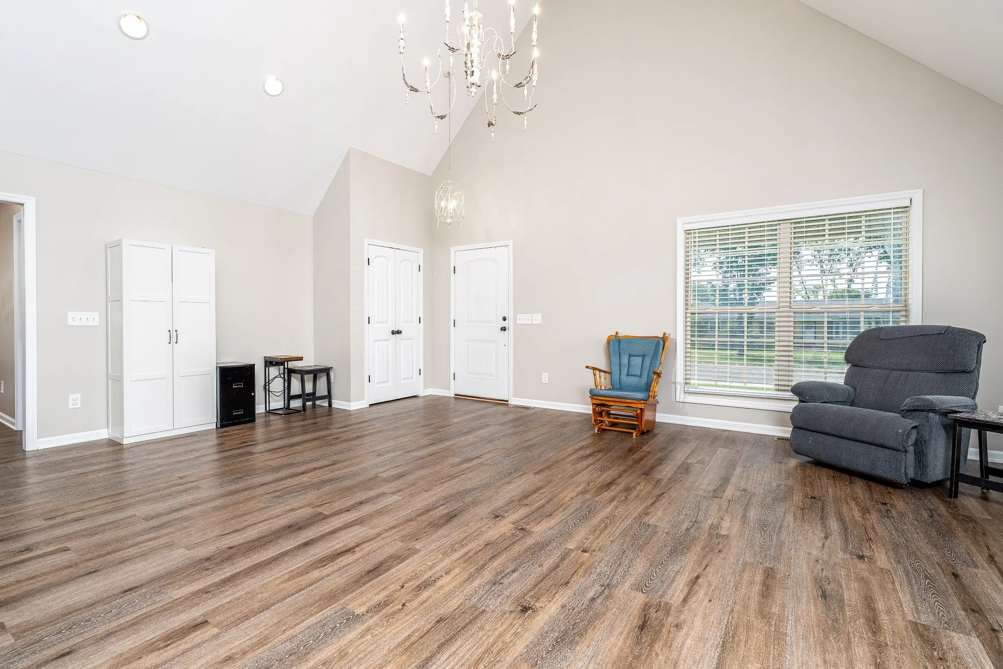 Welcome to this stunning 3-bedroom, 2.5-bath modern home located in one of Lawrenceburg’s most sought-after areas! From the moment you step inside, you’ll be greeted with a bright, open floor plan featuring soaring ceilings, gleaming wood floors throughout, and abundant natural light. Elegant vintage chandeliers add character and charm in every room.