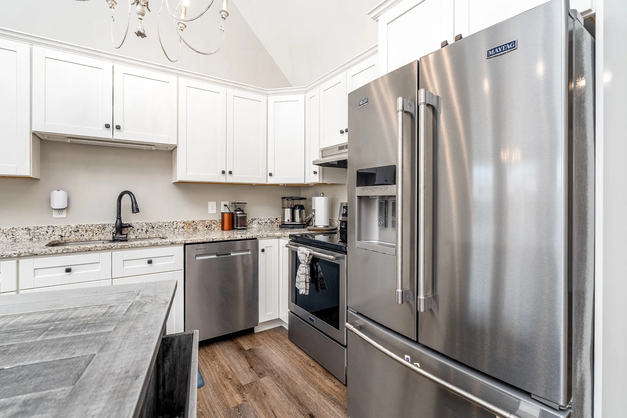 The kitchen is a dream with granite countertops, stainless steel appliances (all remain!), brand new refrigerator, a roll-away island, and a pantry for extra storage.