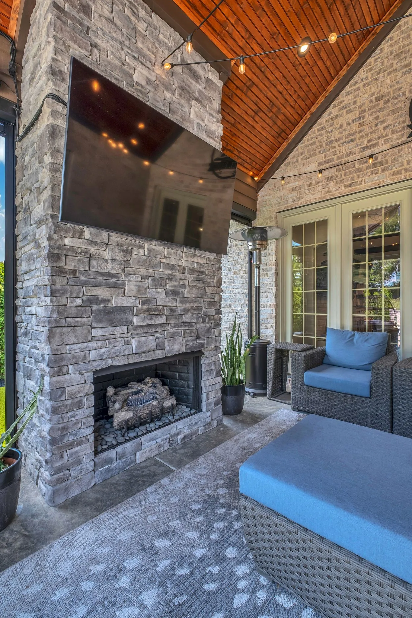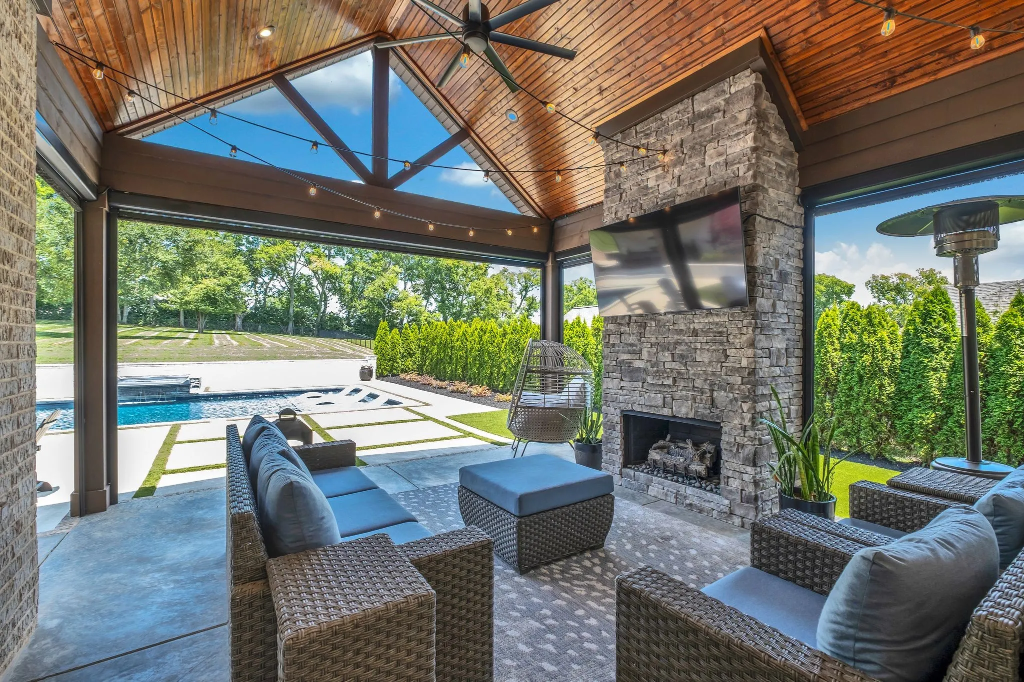 The backyard is a private retreat featuring a luxurious pool and spa, an expansive patio with motorized screens, a beautifully crafted outdoor kitchen, and a stunning outdoor fireplace—creating a seamless indoor–outdoor living experience ideal for year-round entertaining. Custom fencing enhances privacy and complements the resort-style setting.