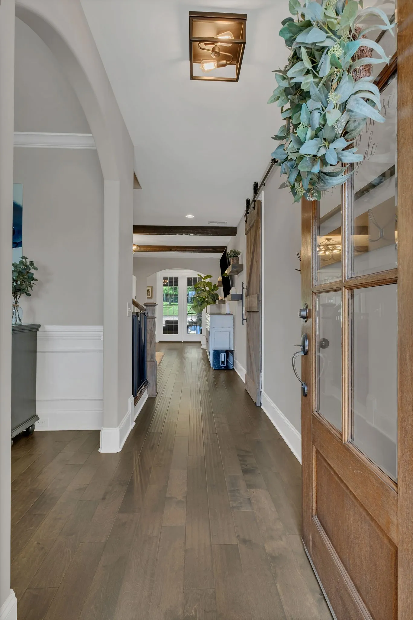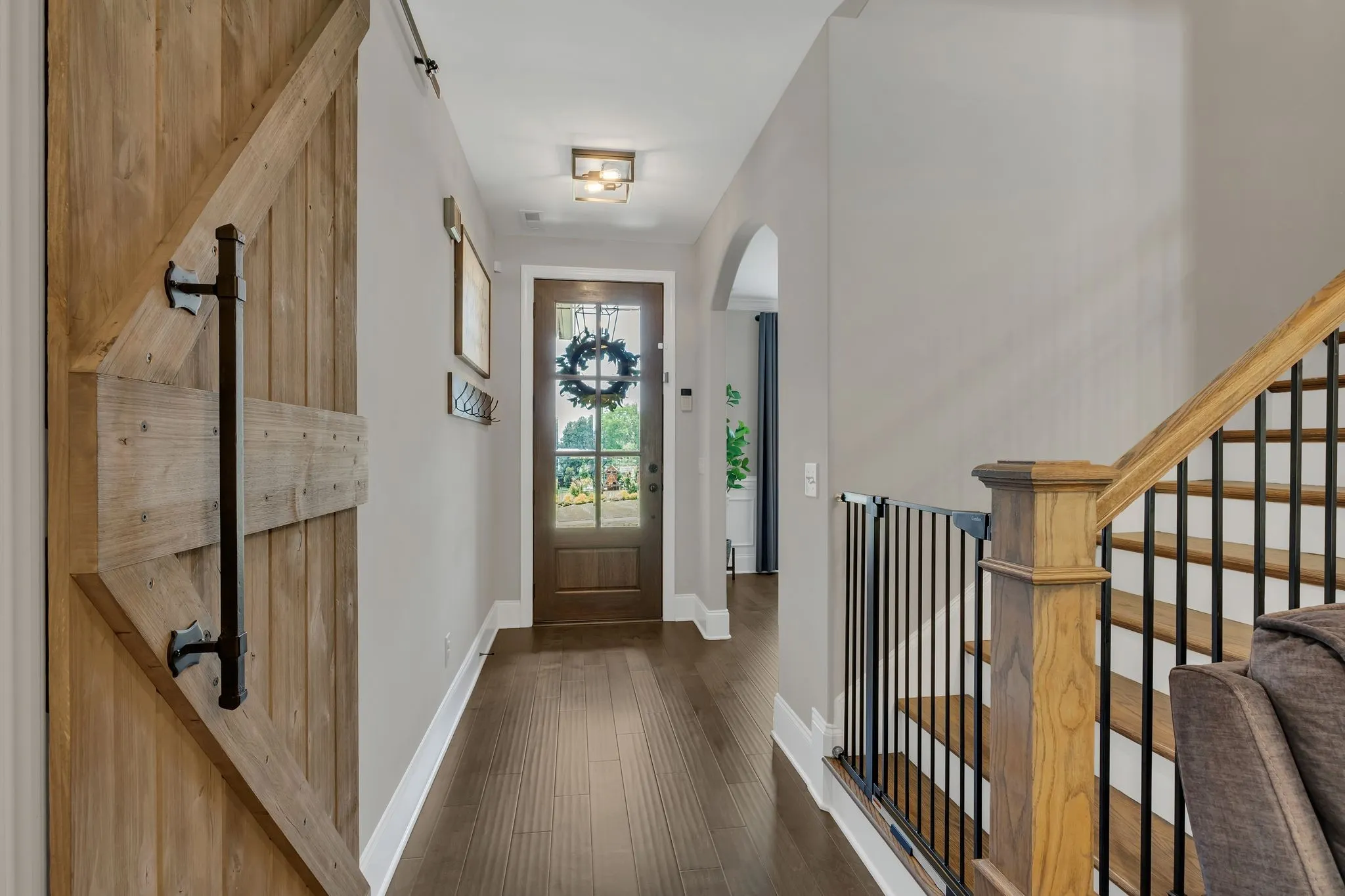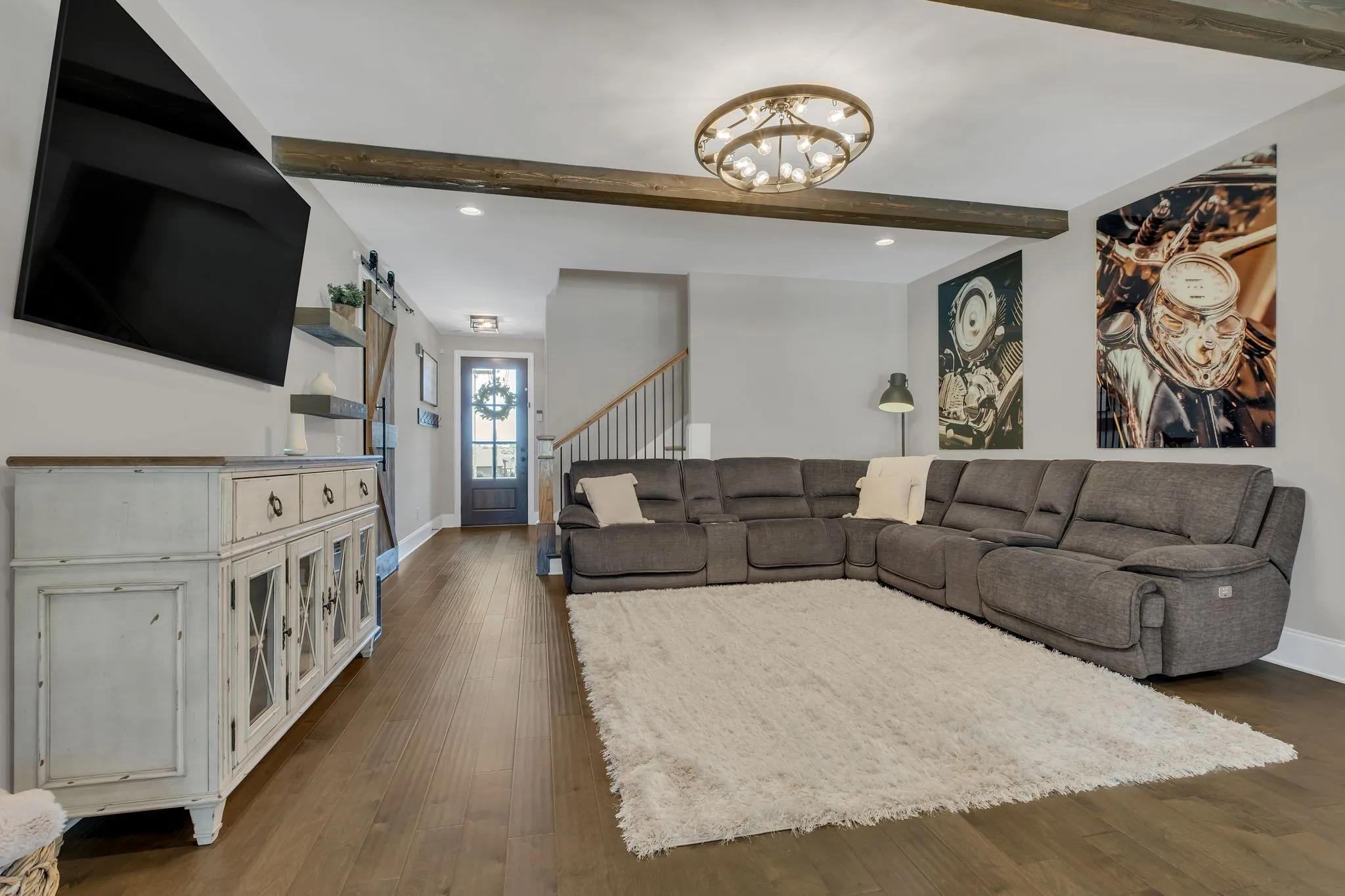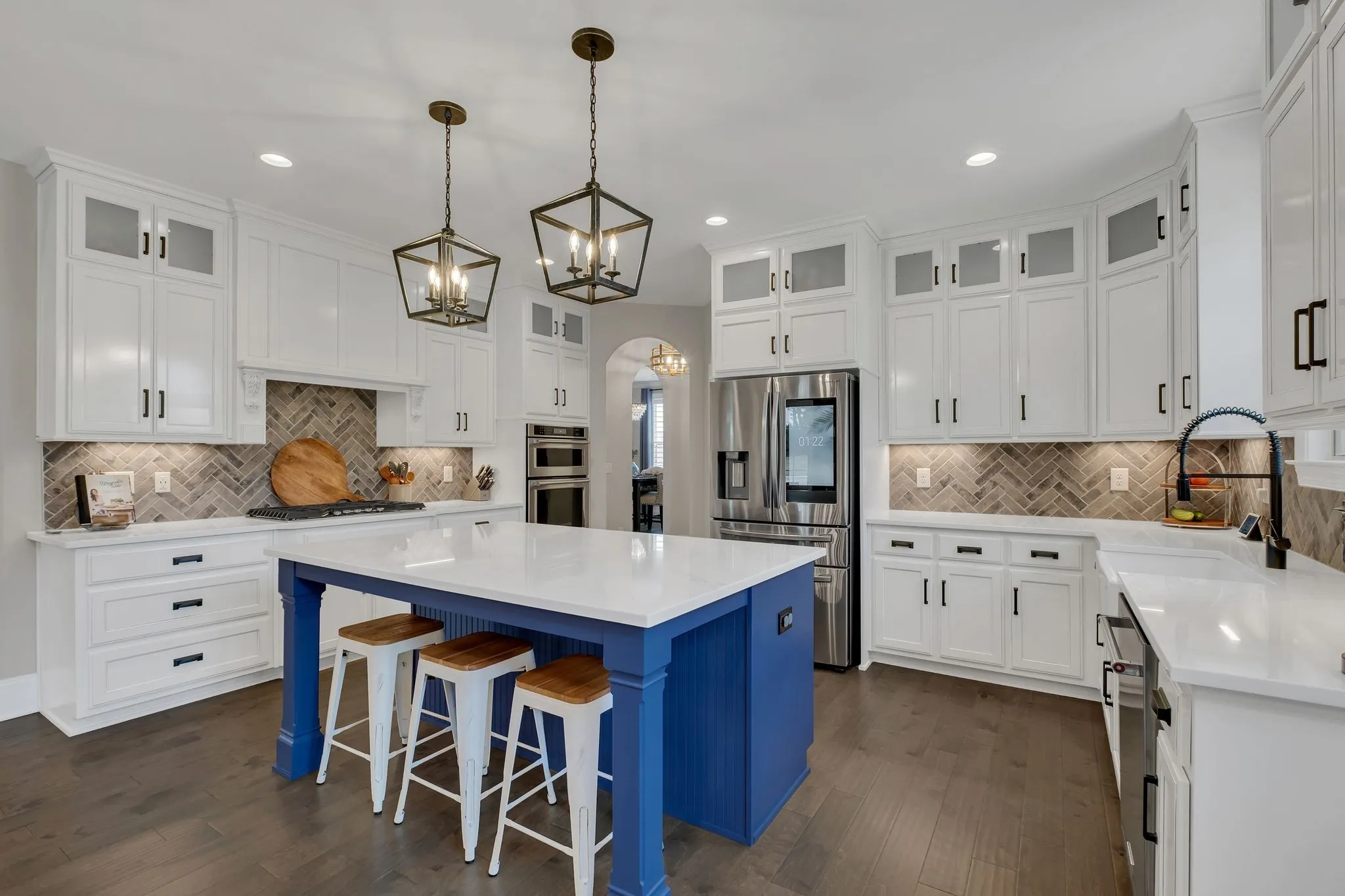 Inside, the home exudes elevated elegance with designer lighting, plantation shutters, custom cabinetry, floating shelving, barn doors, shiplap accents, and hardwood flooring throughout the main level. The gourmet kitchen showcases quartz countertops, an extended island, floor-to-ceiling upgraded cabinetry, a farm sink, herringbone backsplash, and a sophisticated butler’s pantry with added refrigeration.