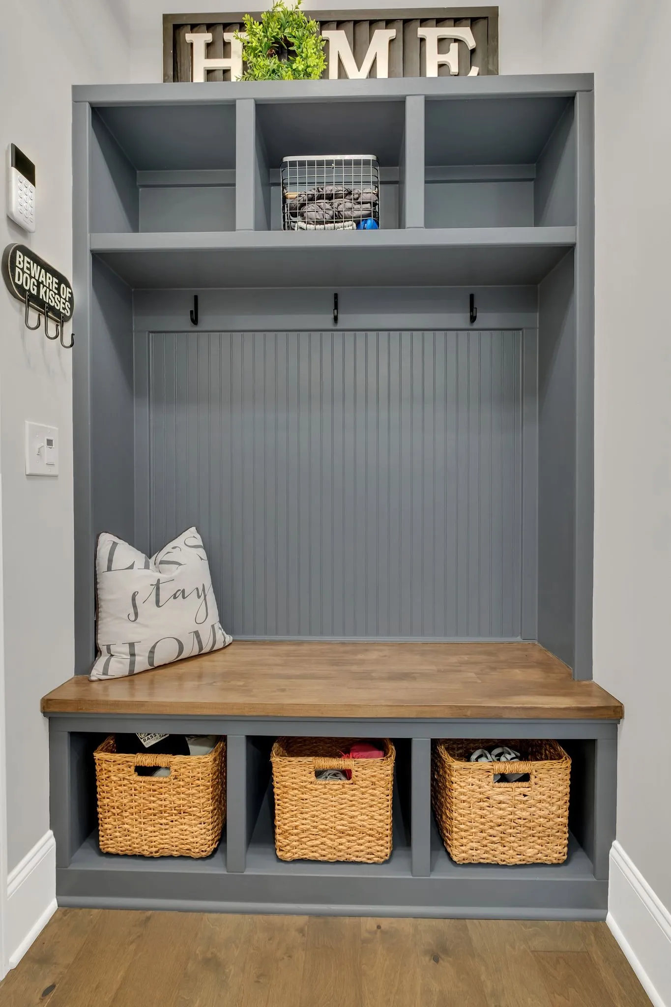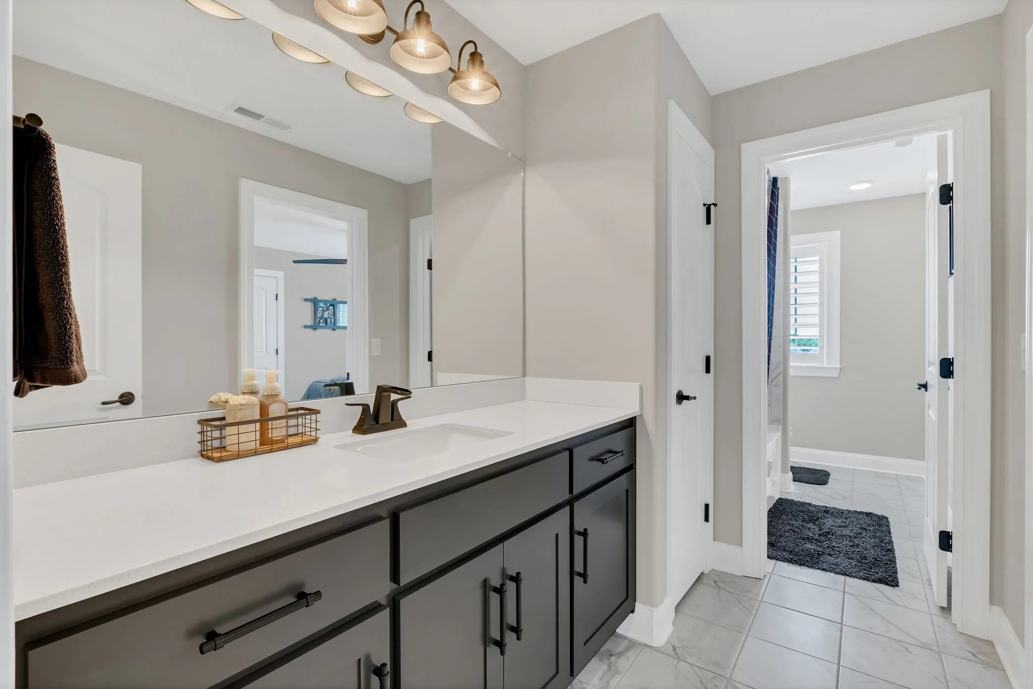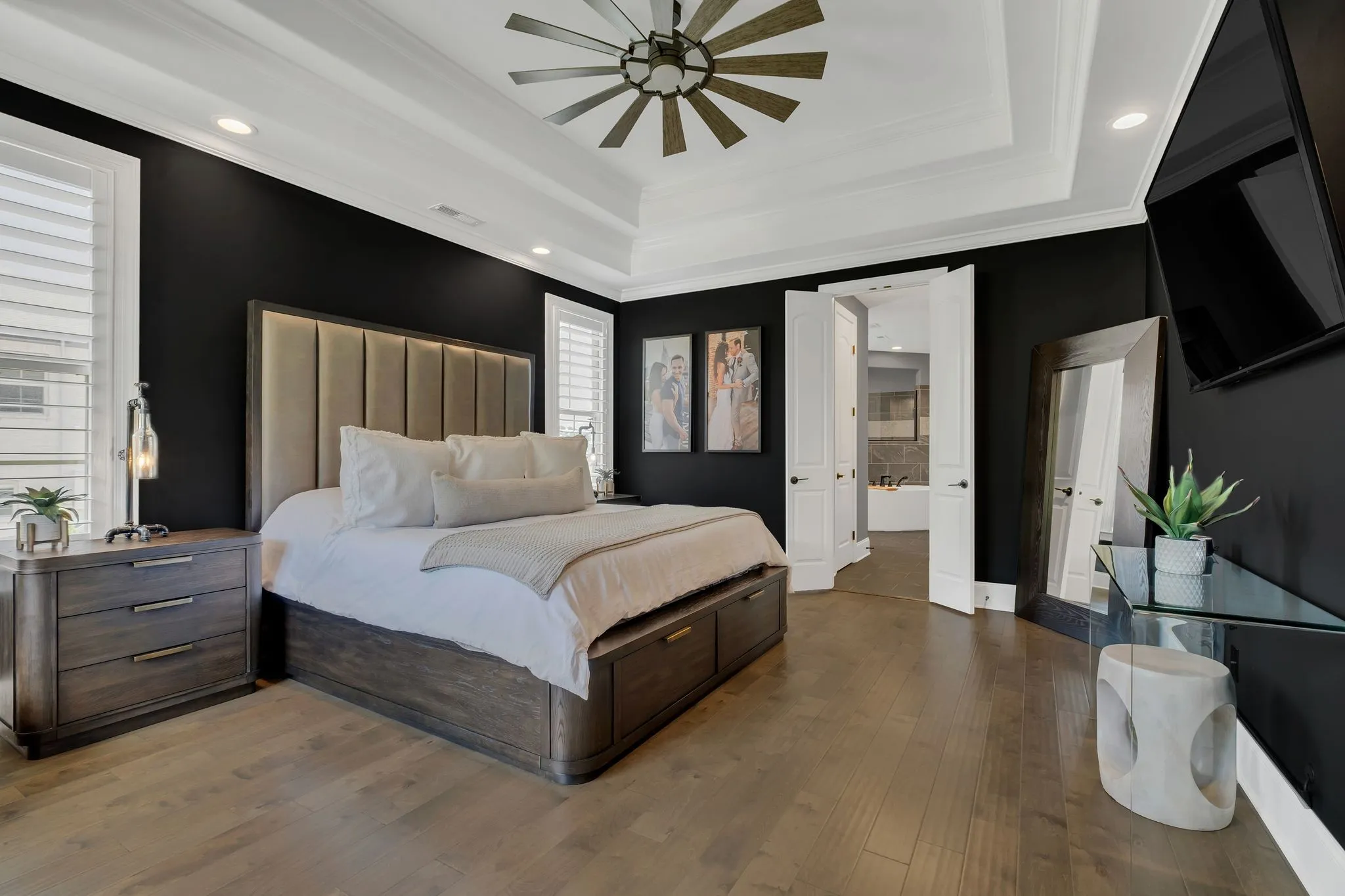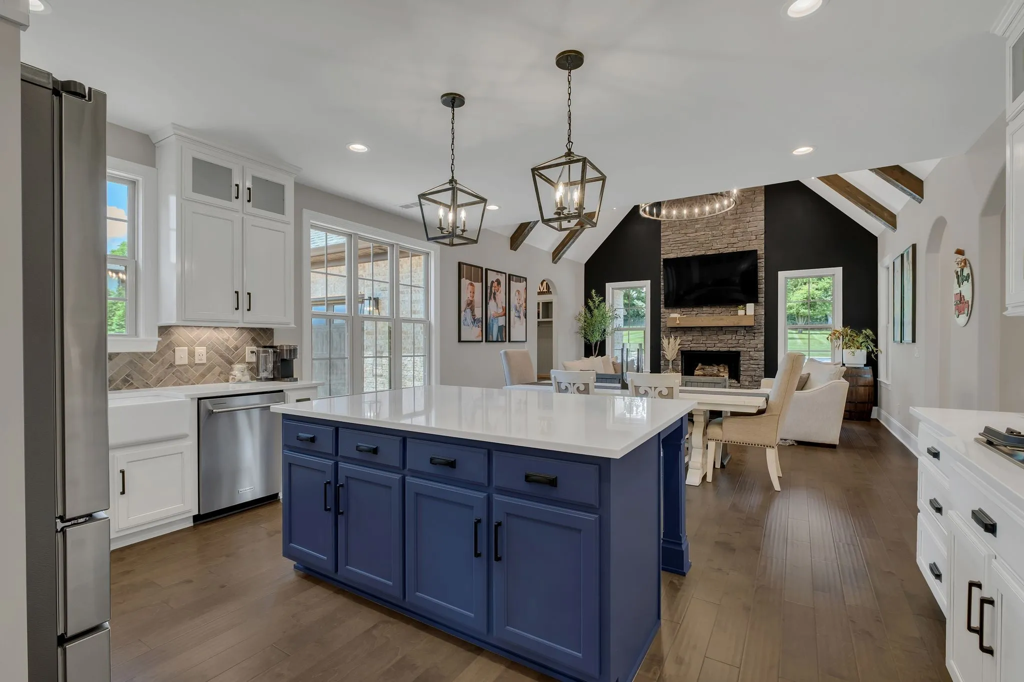 Inside, the home exudes elevated elegance with designer lighting, plantation shutters, custom cabinetry, floating shelving, barn doors, shiplap accents, and hardwood flooring throughout the main level. The gourmet kitchen showcases quartz countertops, an extended island, floor-to-ceiling upgraded cabinetry, a farm sink, herringbone backsplash, and a sophisticated butler’s pantry with added refrigeration.