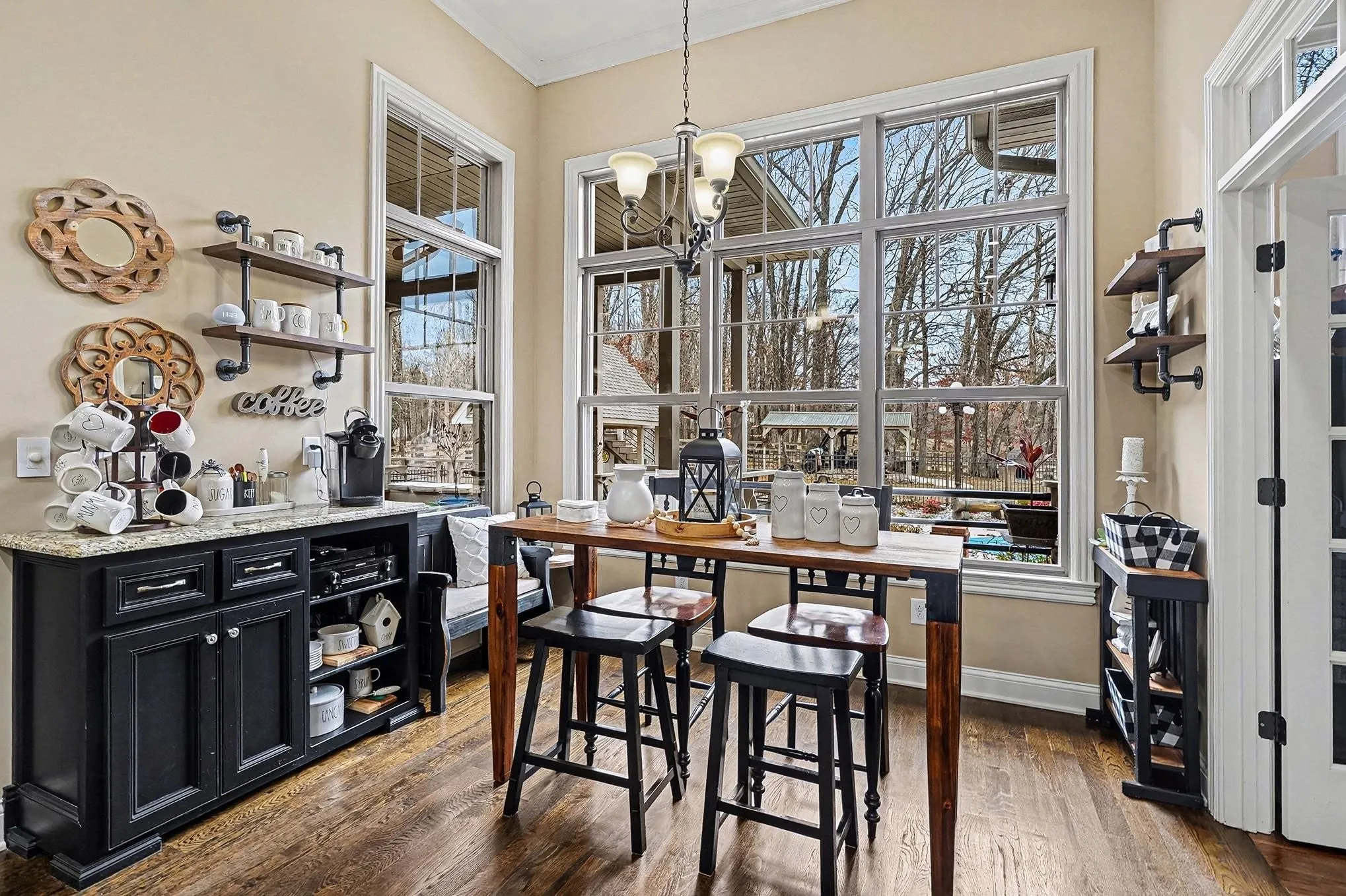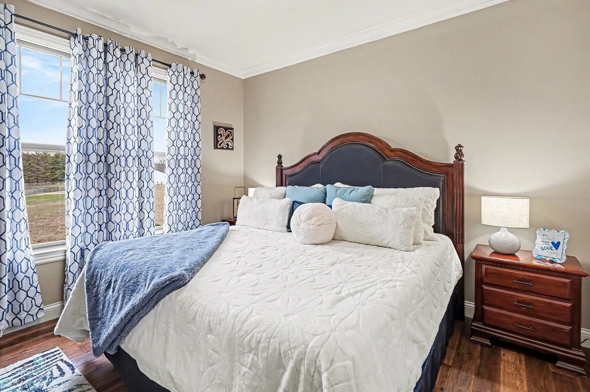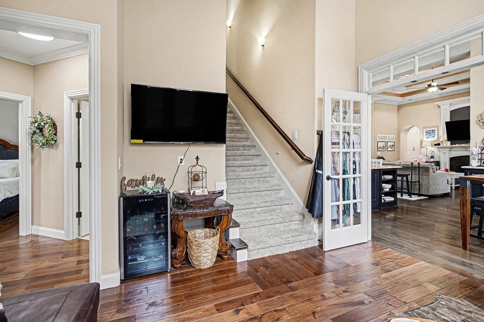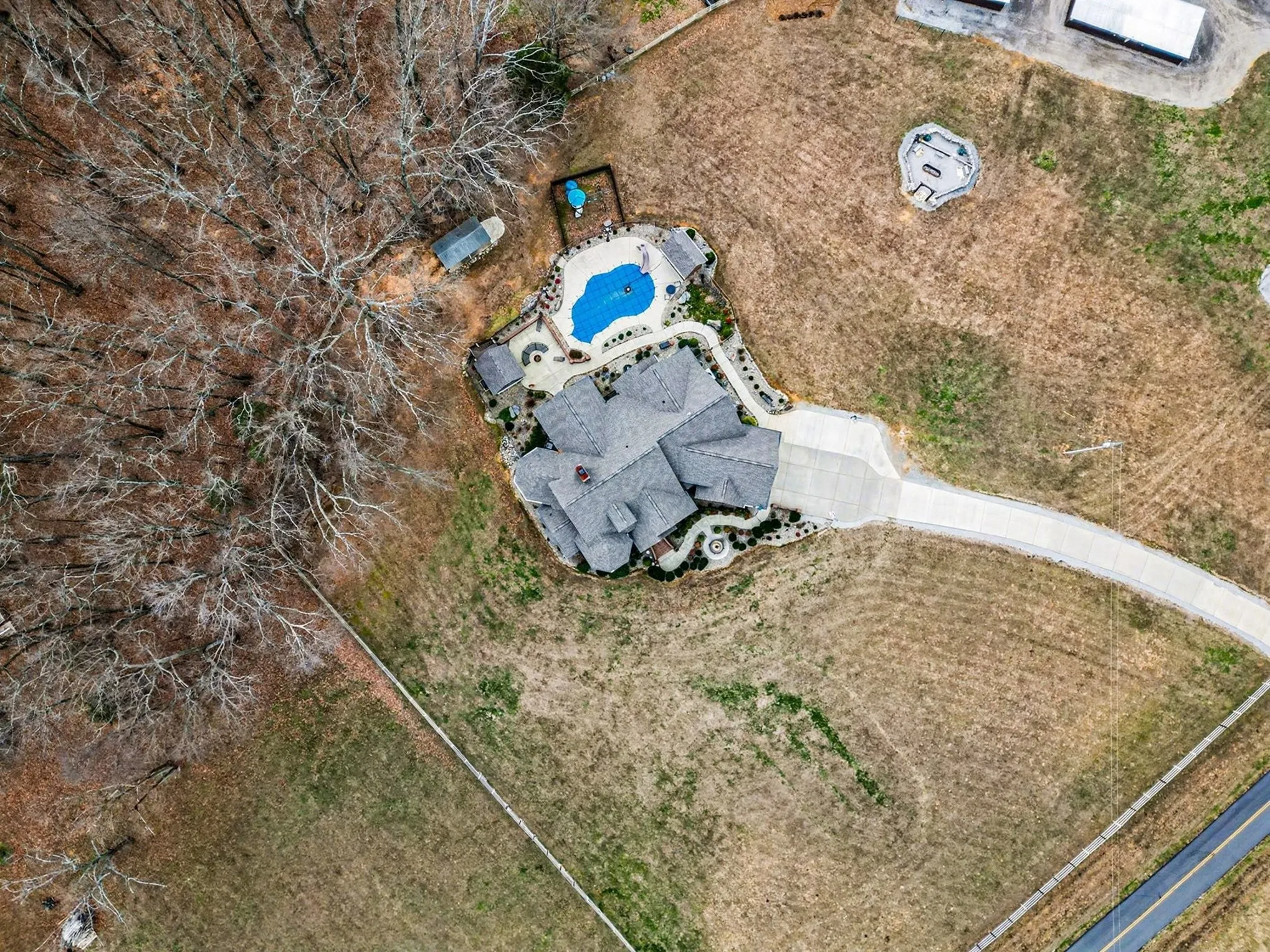 The 4,146 square foot primary residence offers four bedrooms, three and a half baths, expansive gathering spaces, and peaceful views across open usable land that feels worlds away while still within reach of Nashville. The setting is quiet, private, and built for those who want room to breathe, entertain, and step away from the pace of the city without sacrificing convenience.