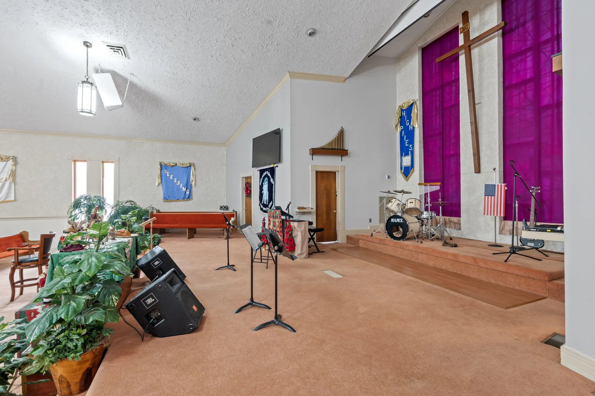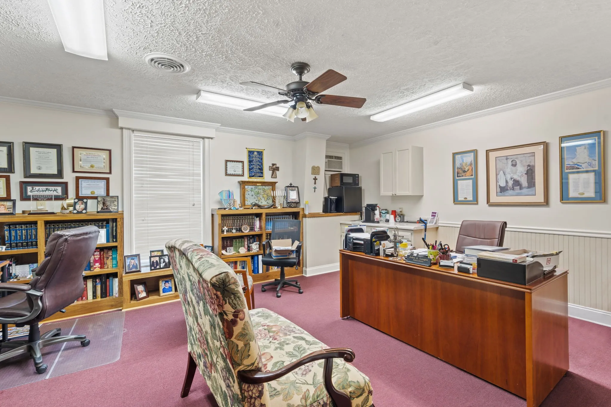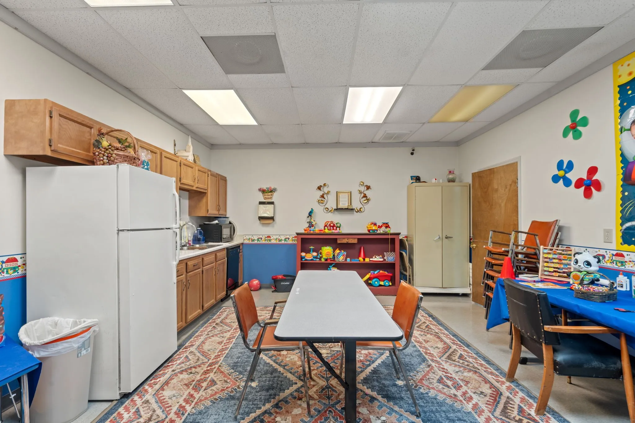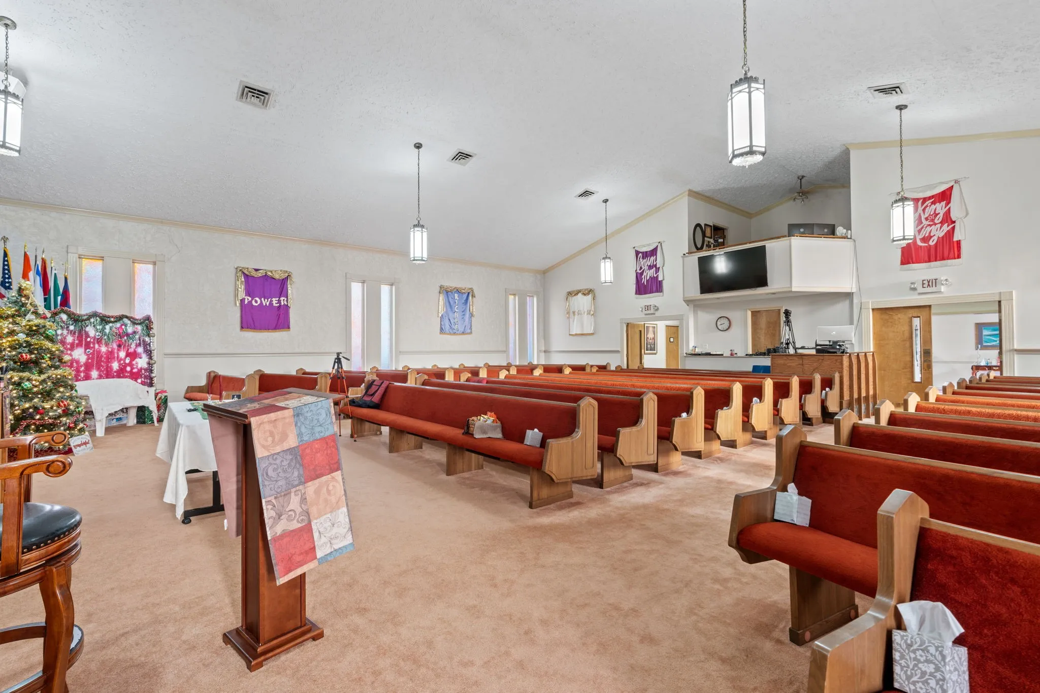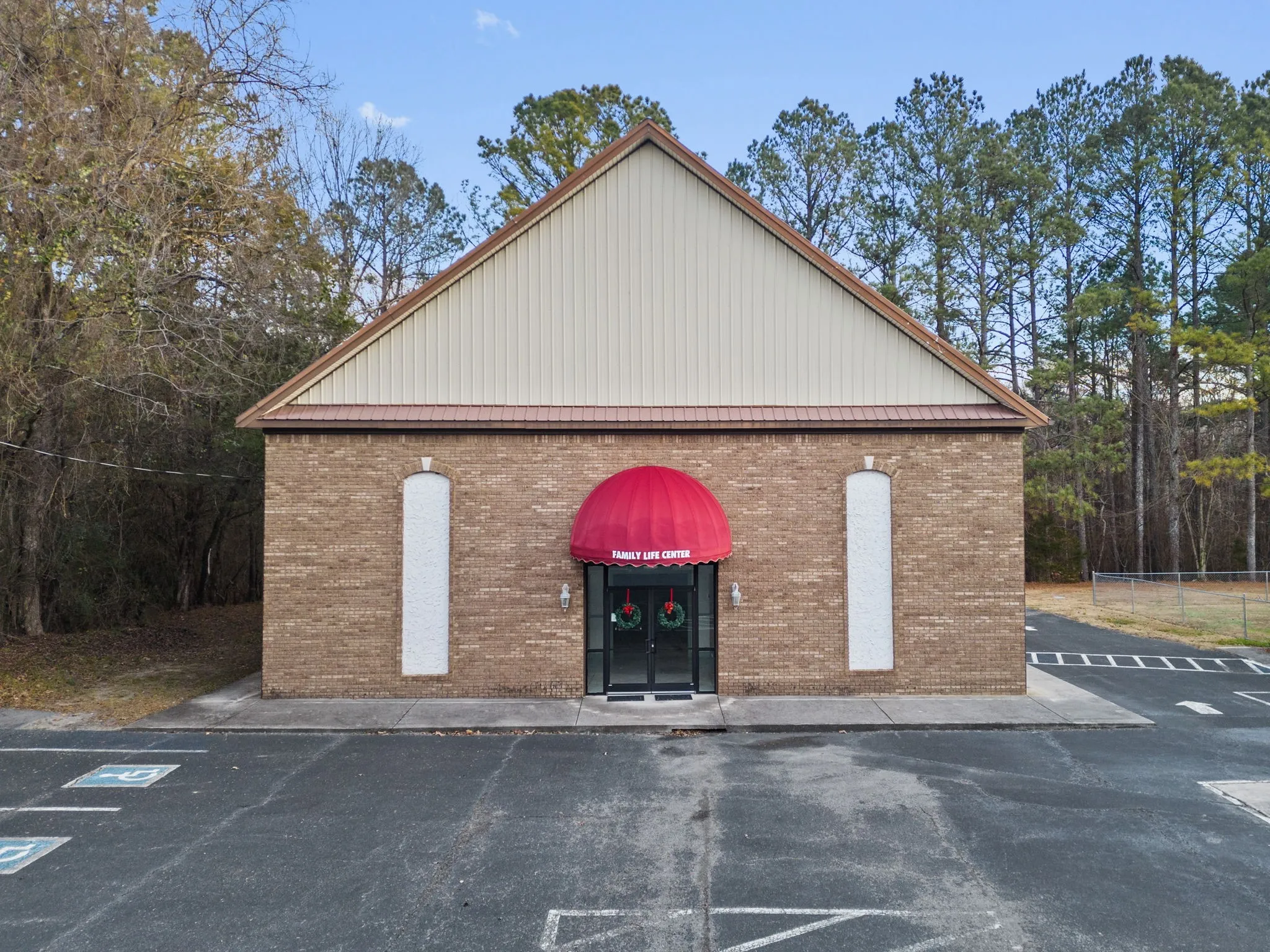 Two additional buildings enhance the campus functionality. A ±1,600 SF classroom/nursery building provides flexible space for administration or instruction. The ±4,200 SF Family Life Center (FLC) significantly expands usability and includes a large flex/recreation room, full industrial kitchen, multiple storage rooms, and men's and women's restrooms. The upper level of the FLC offers six additional rooms (three on each side) suitable for offices, classrooms, libraries, meeting rooms, or storage, allowing for a wide range of institutional or community uses.\n