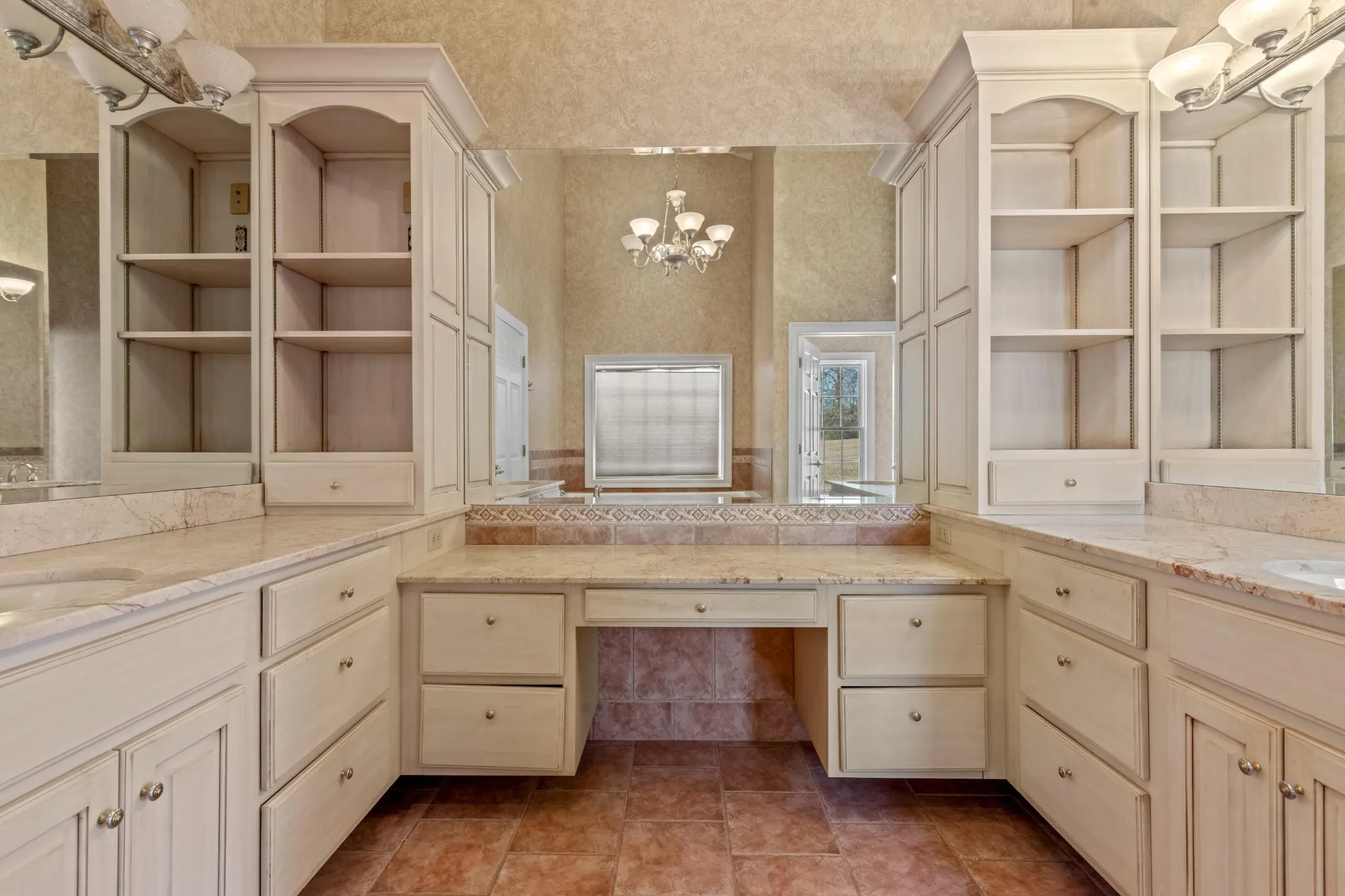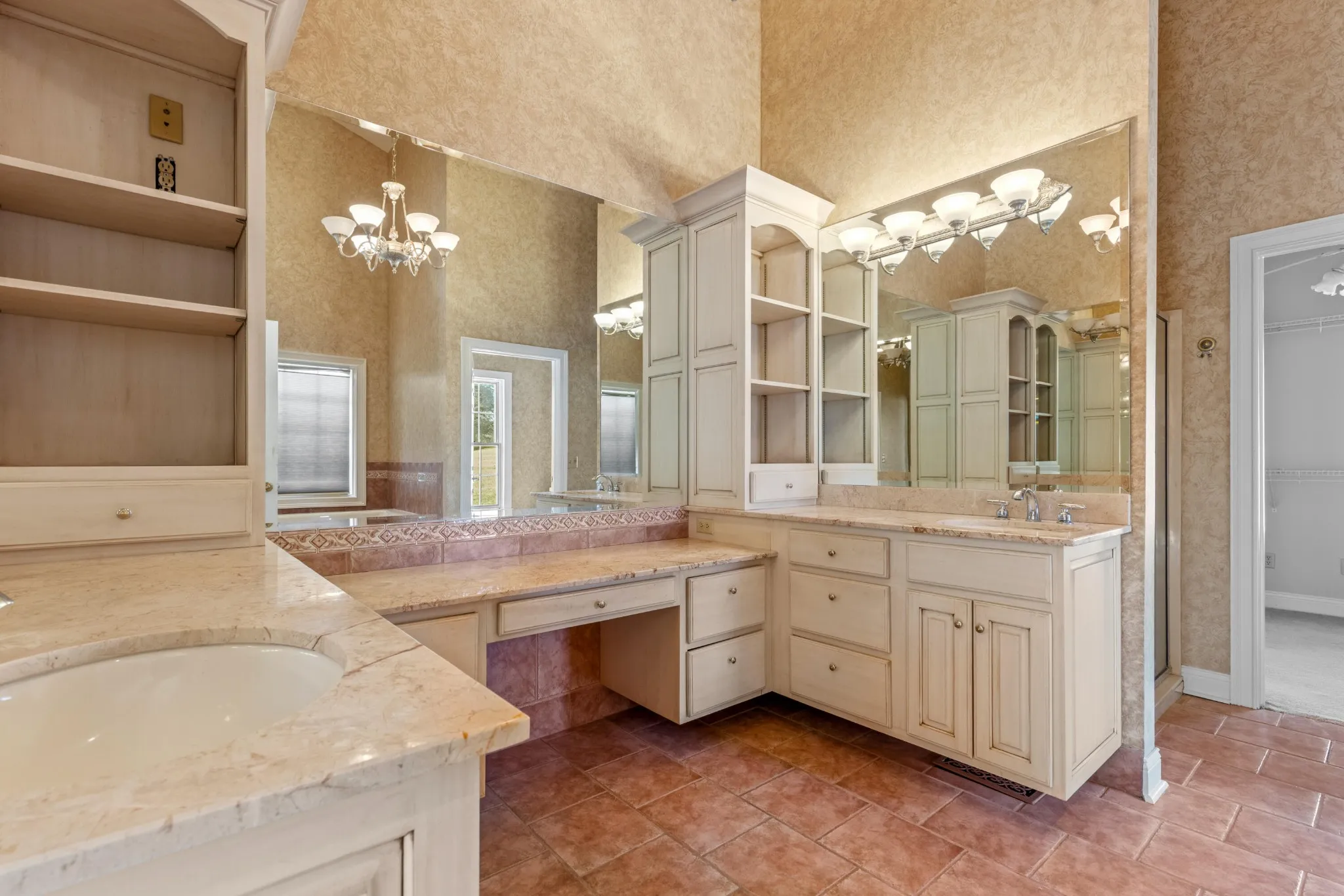 The primary suite is a true retreat with vaulted ceilings, built-in shelving, a built-in vanity, and a spa-inspired bath complete with a jetted soaking tub and shower. The expansive walk-in closet offers space for seating, adding comfort and functionality.