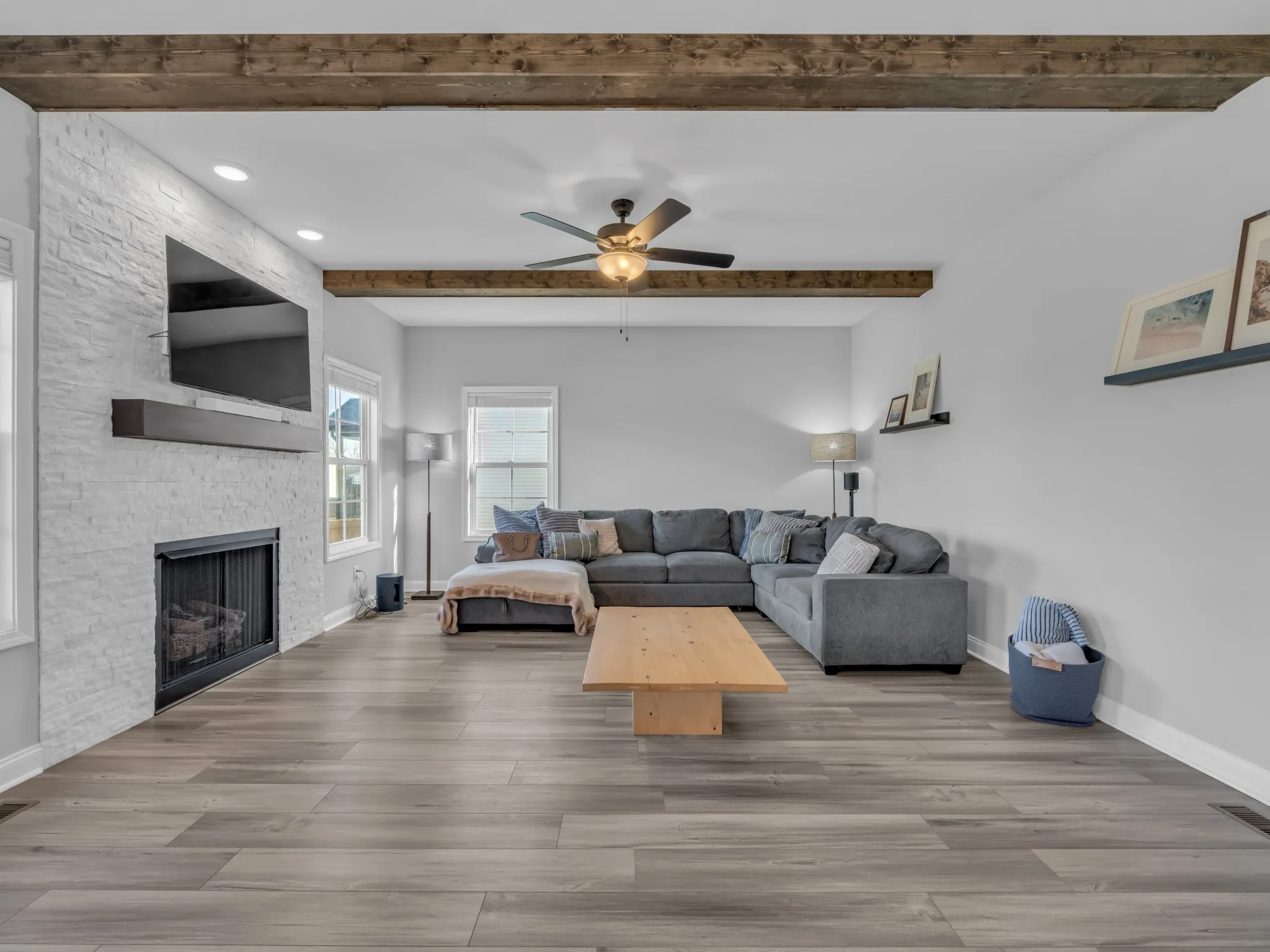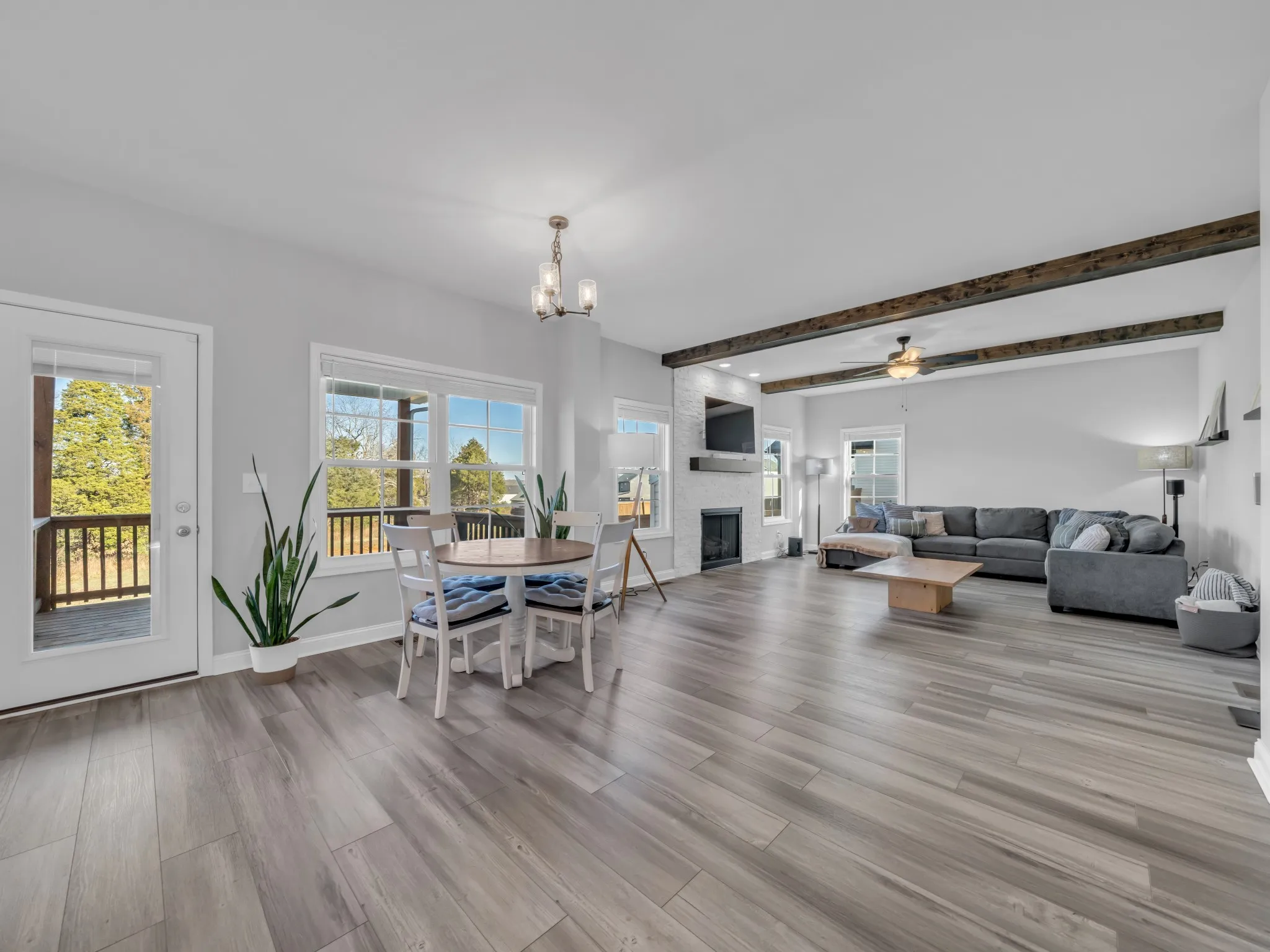 offers a modern yet functional layout, enhanced by charming wooden accent beams in the living room and a cozy gas fireplace. The Kitchen features stainless steel appliances, an oversized farmhouse sink, spacious pantry, and a dedicated bar and coffee area — great for entertaining and everyday living. All appliances remain, including the washer and dryer. An elevated deck with ceiling fan, overlooking serene land that cannot be built upon, provides lasting privacy and peaceful views. • A large primary suite showcases elegant wainscoting on the bed wall, a spa-like bathroom with double vanities, separate tub and shower, and two very generously sized walk-in closets. Guest BR #1 is a mirror image of the Primary. Ceiling fans are installed in all bedrooms, and the laundry room includes a convenient utility sink • Additional highlights include a two-car garage and low HOA fees. Just 4 miles to Ft. Campbell and 7 miles to Downtown Clarksville!