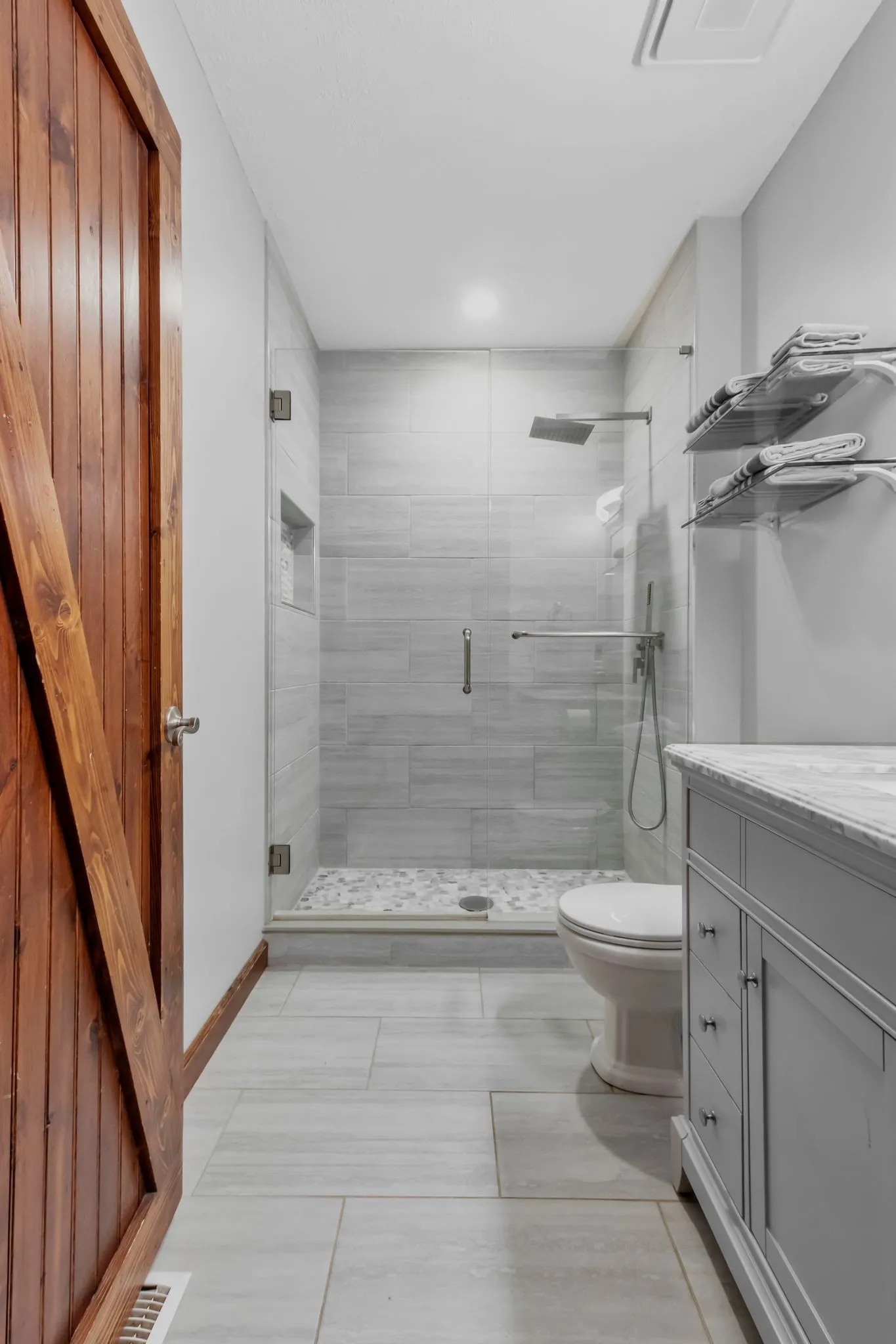 The main suite features a large walk-in closet and a private bath with gorgeous tile flooring, double vanities, and a walk-in shower. Two additional bedrooms and a full bath provide comfortable space for family or guests.