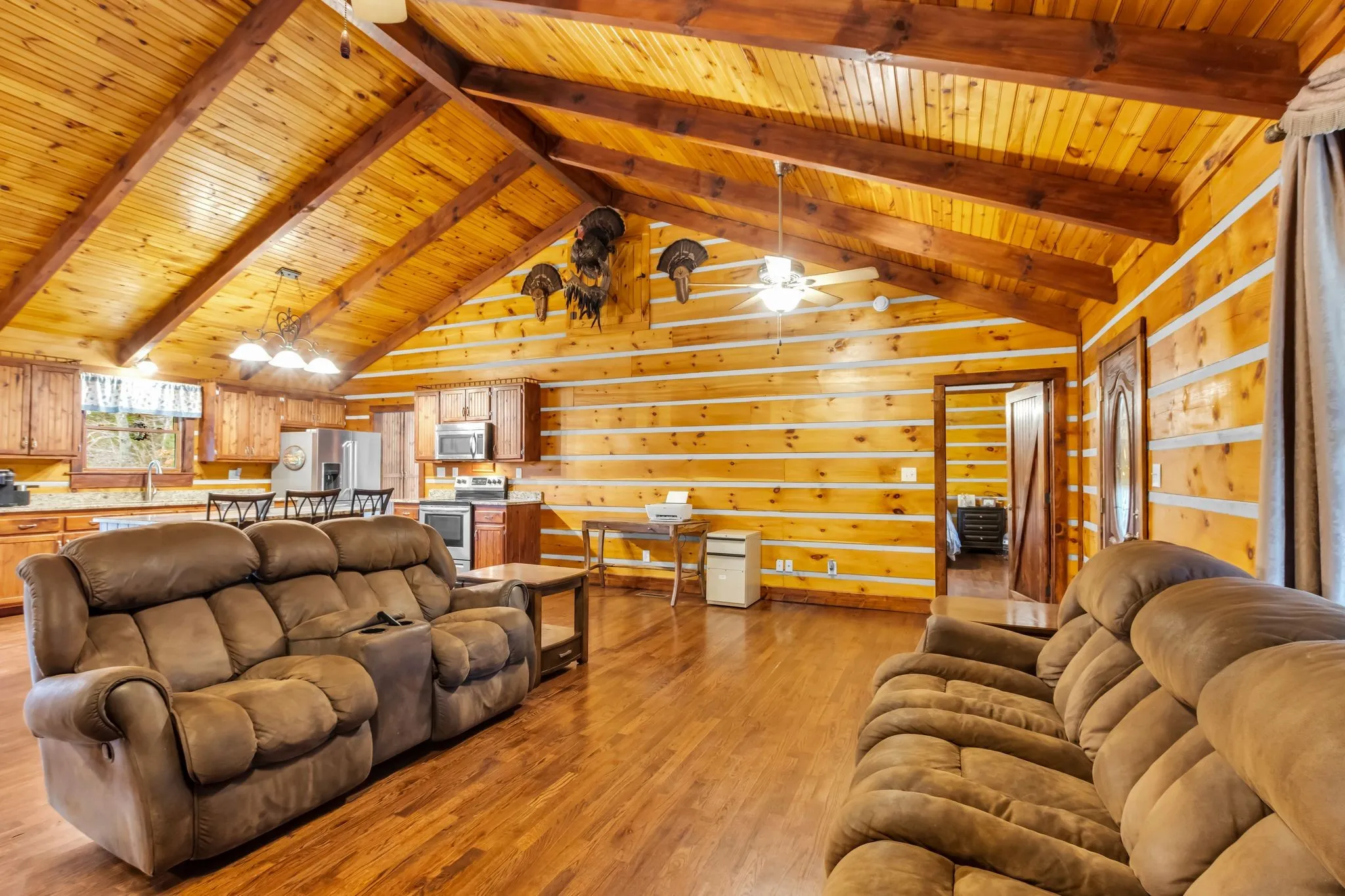 Inside, the open-concept design showcases vaulted ceilings, stunning wood floors, and timeless rustic charm. The kitchen offers custom detailed cabinetry, granite countertops, an eat-in dining area, and additional seating at the island—ideal for everyday living and entertaining.