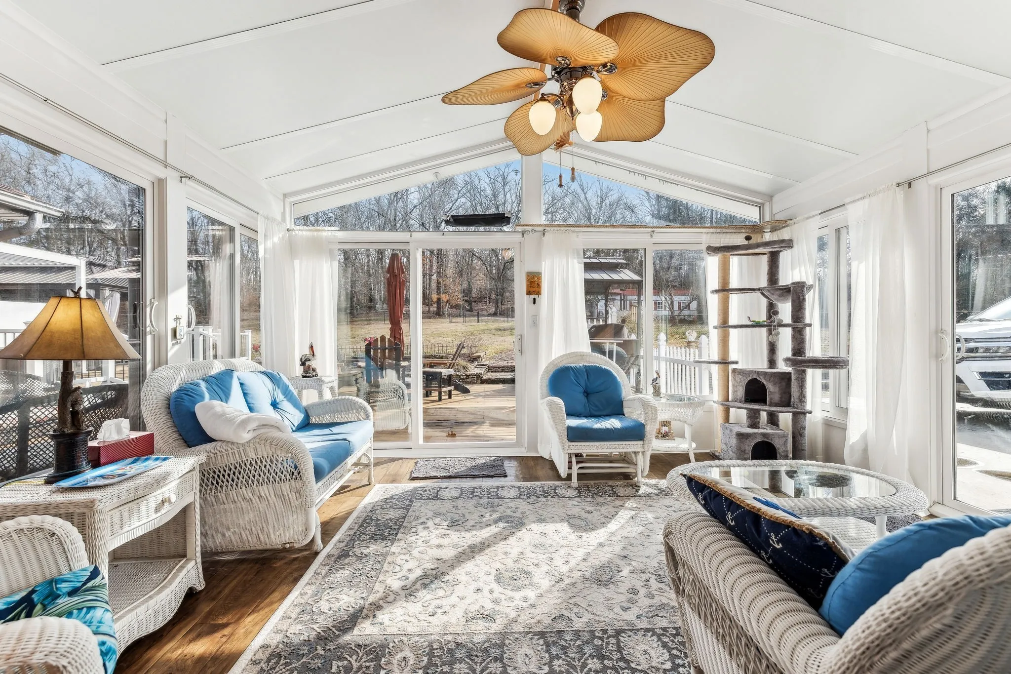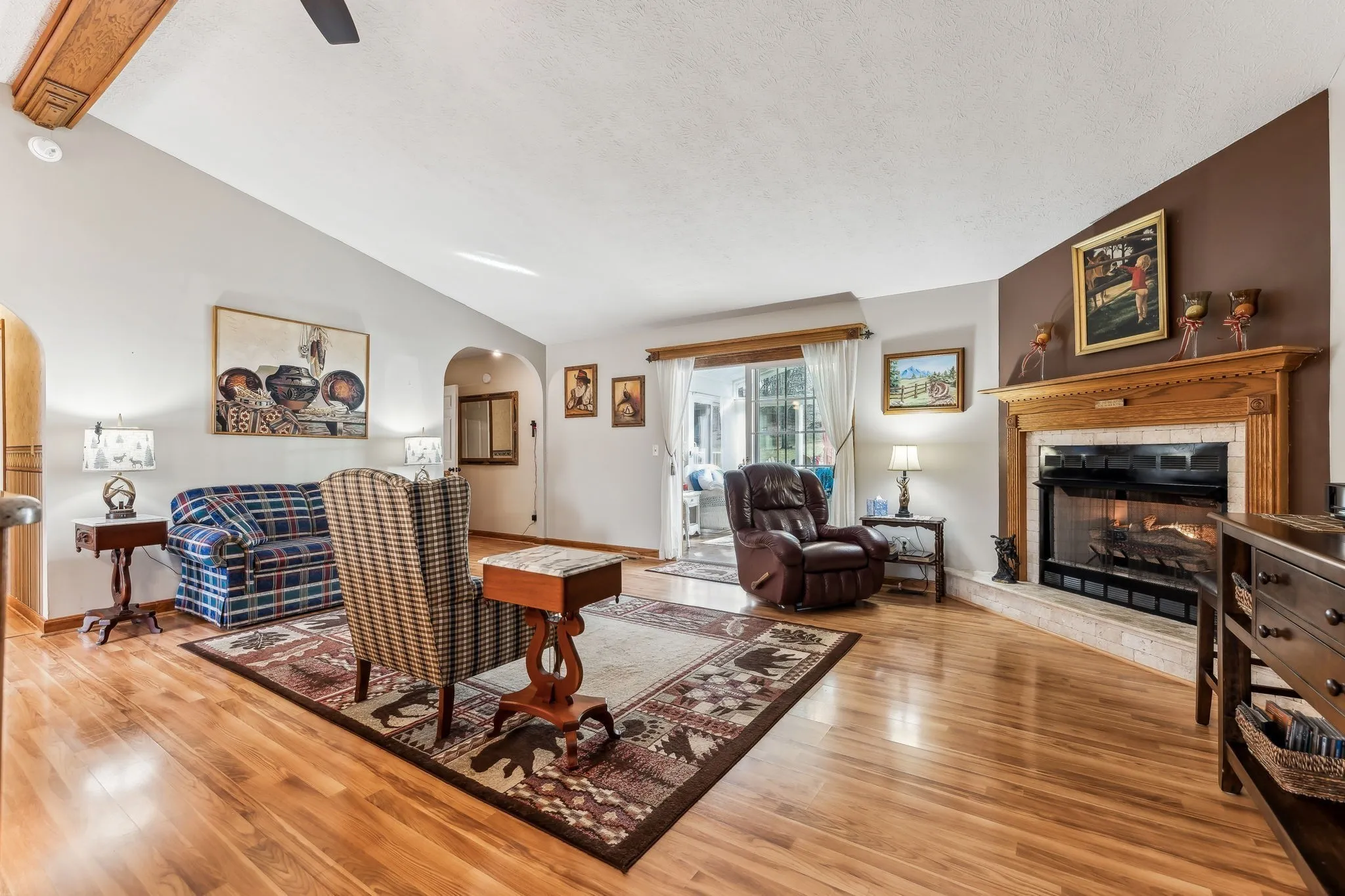 Inside, a heated & cooled sun porch surrounded by glass provides the ultimate spot for evening relaxation. The family room boasts a walk-up bar, while the cozy den offers a fireplace with gas logs—perfect for enjoying the big game or a card night. The spacious primary suite includes a walk-in tile shower, abundant closet space, and private access to the deck.\n