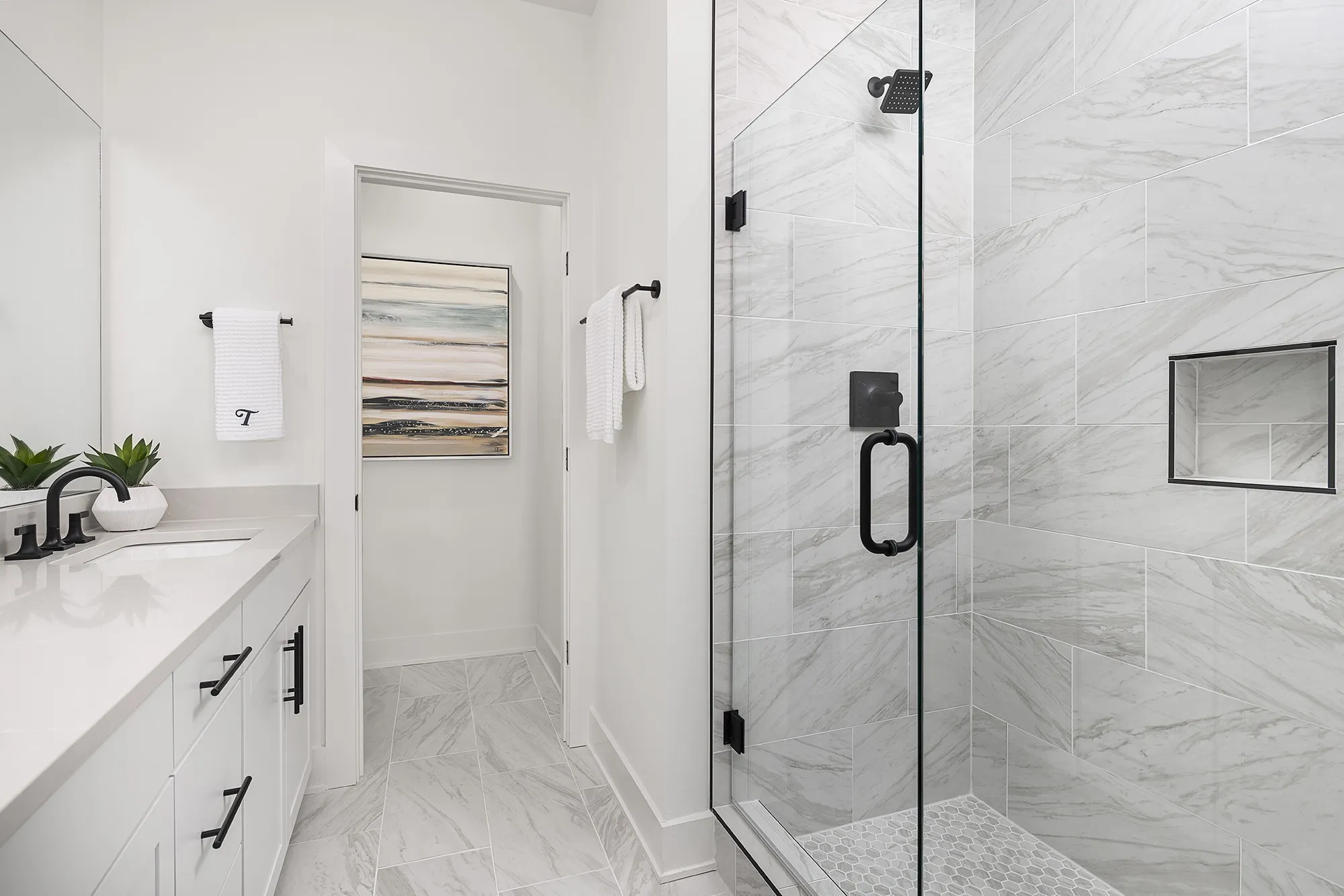 The third floor is dedicated to privacy and comfort. The large primary suite offers dual walk-in closets and a boasts an elegant ensuite bath featuring a dual vanity sink, gold and black finishes and an elegant touch of green in the shower. This bathroom feels like a spa! The second bedroom is also sizable with its own ensuite bath, offering a stunning emerald octagon tile-to-ceiling shower. Laundry is on this floor and comes complete with washer and dryer!