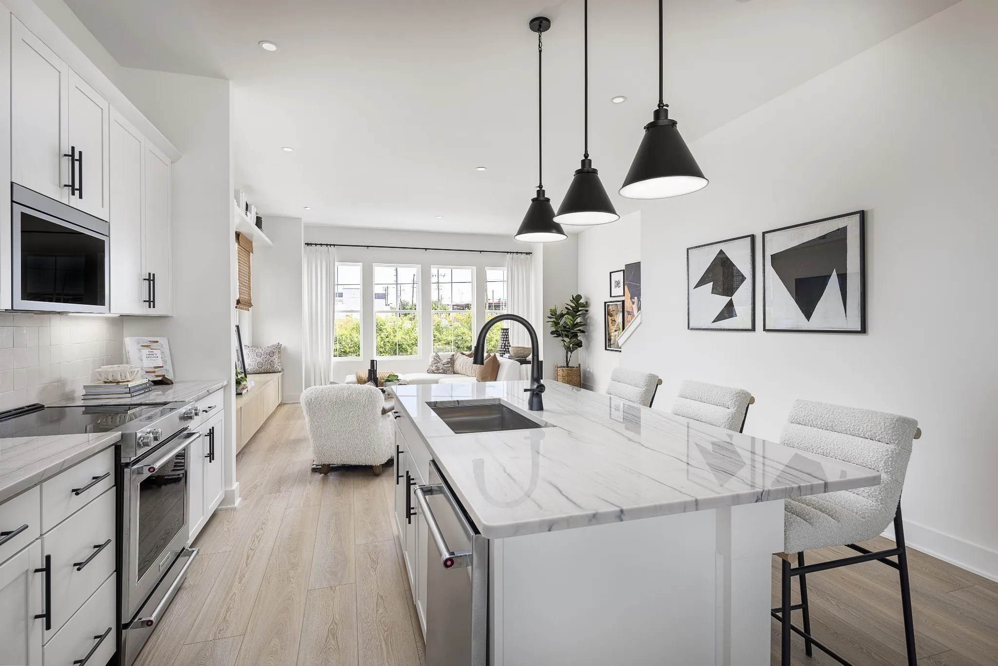 The second floor is the heart of the home featuring an open-concept kitchen boasting gorgeous swirled quartzite countertops, a large living room with a faux balcony and glass slider doors, and a designated dining area. This is the perfect home to entertain or wind down. The kitchen includes KitchenAid appliances and a walk-in pantry. Off the dining is a balcony, offering a great spot for outdoor relaxation. With plenty of windows throughout the home, natural light pours in, creating an airy and warm atmosphere.