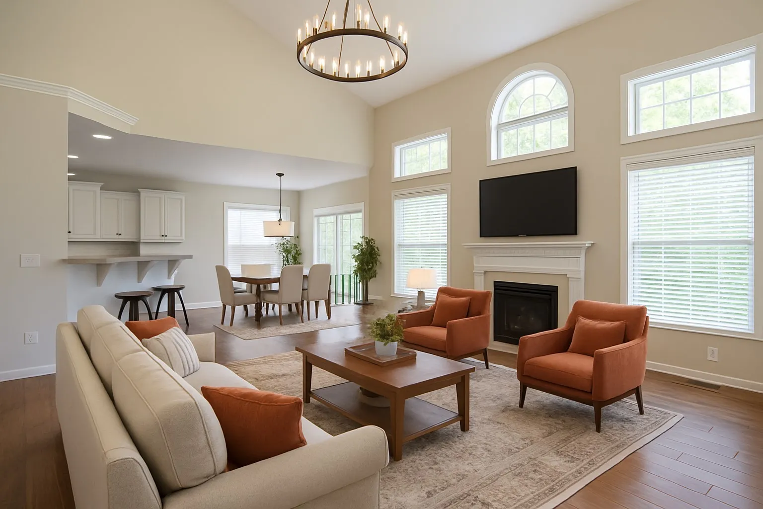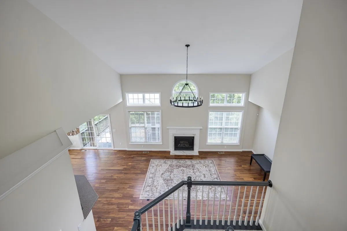 Step inside to an open floor plan featuring gleaming hardwood floors and a light-filled, two-story living room with expansive windows that fill the space with natural light. The updated kitchen includes modern appliances, a cozy breakfast nook, and opens to a covered deck—perfect for relaxing with sunset views.