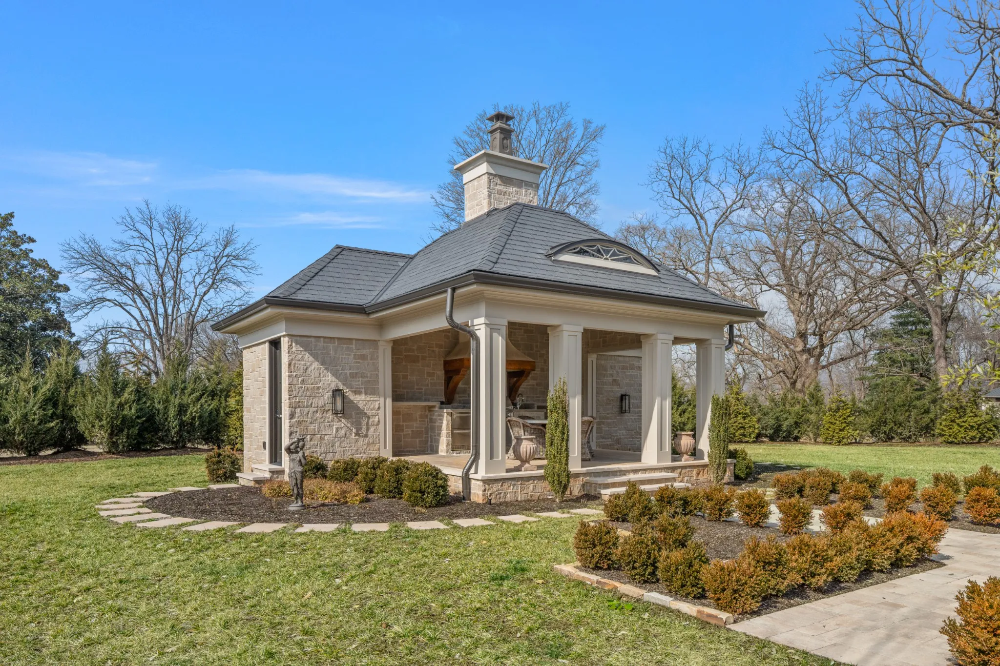 Outdoor living includes a matching stone pool house with an entertaining area, outdoor kitchen, pool equipment room, half bath, and storage loft. The fully irrigated lawn is bordered by 180 evergreens for privacy, with a front courtyard, stone columns, and front and rear landscape lighting.
