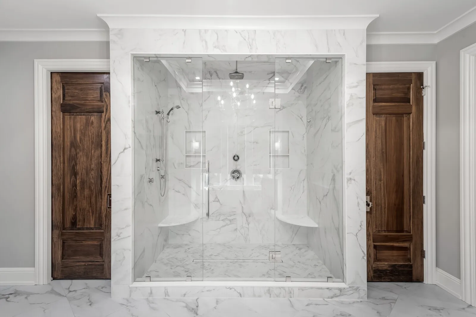 Inside, elevated finishes are everywhere, including extensive trim work, solid 8-foot doors on both levels, and designer ceiling details in the formal dining and living rooms, foyer, and upper stairwell. Three fireplaces and custom built-ins add warmth in the family room, study, and office. The home offers five bedrooms with adjoining bathrooms, two laundry rooms, and a large vaulted bonus room. The primary suite features a sitting area, heated bathroom floors, a freestanding tub, a large walk-in shower, and an expansive primary closet with custom built-ins.