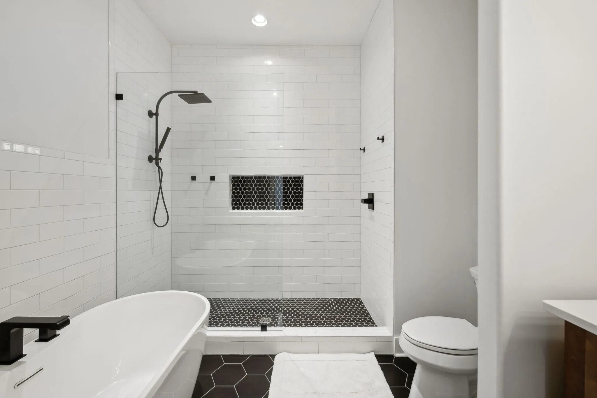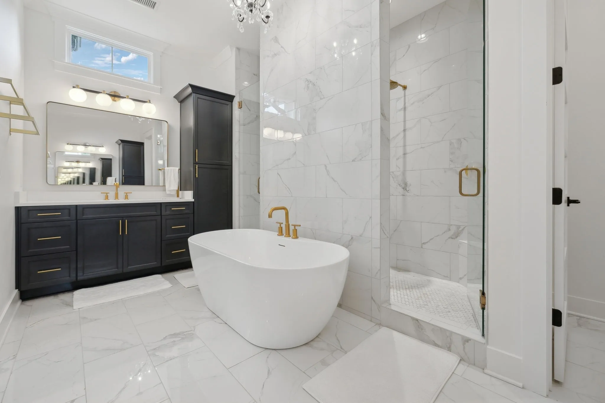 Additional features include a mosaic-tiled laundry room with Tiffany blue cabinets and a second bathroom with honeycomb tile, a soaking tub, and a subway-tiled shower. The home also includes epoxy floors in the three-car garage, a tankless water heater, and a welcoming front porch.