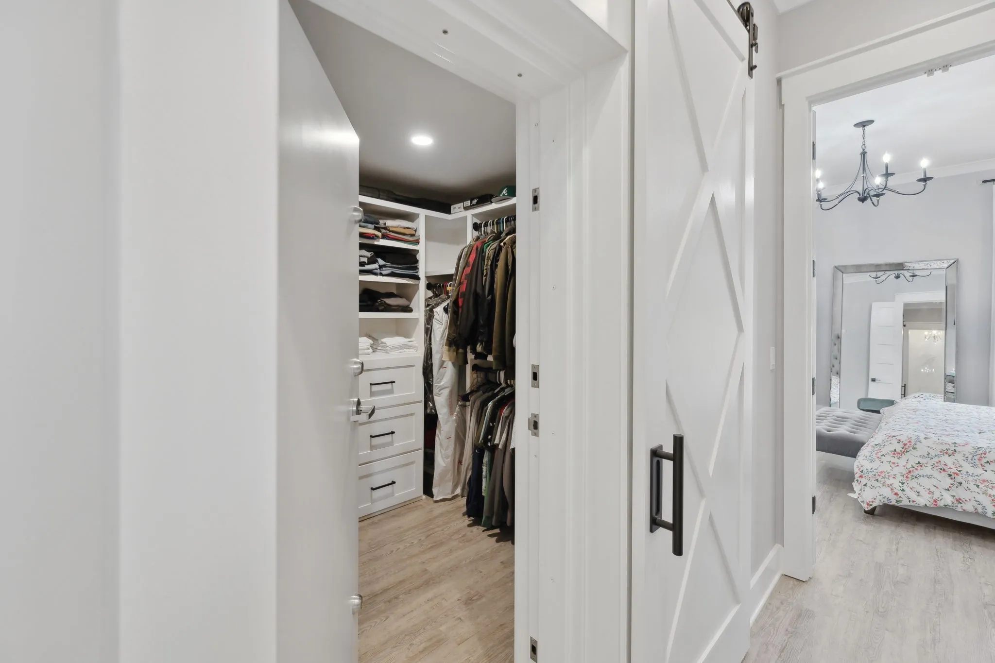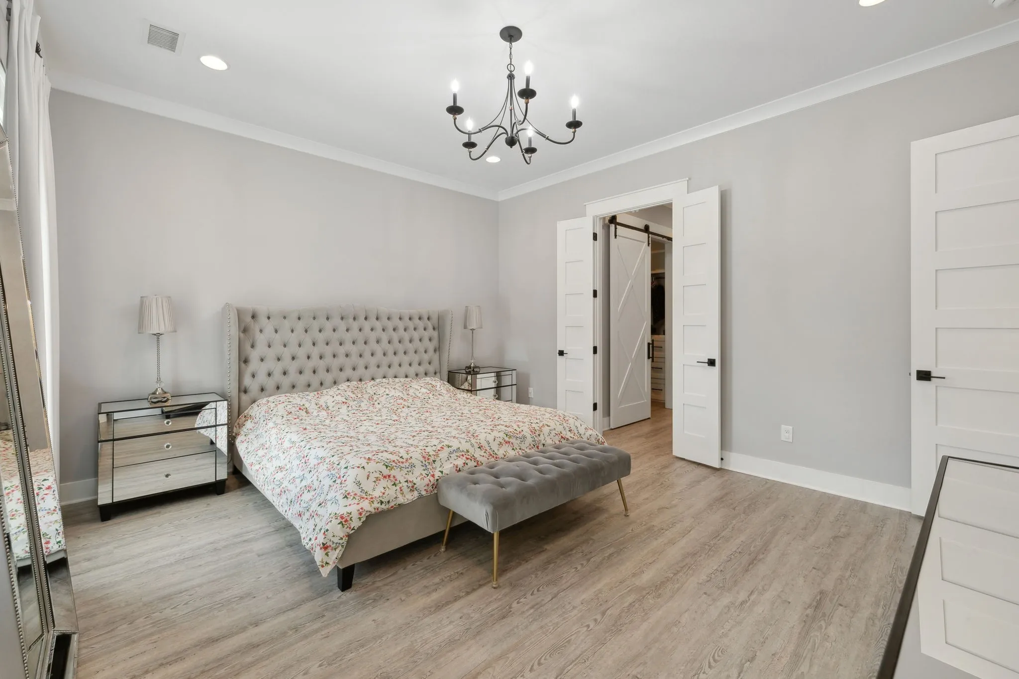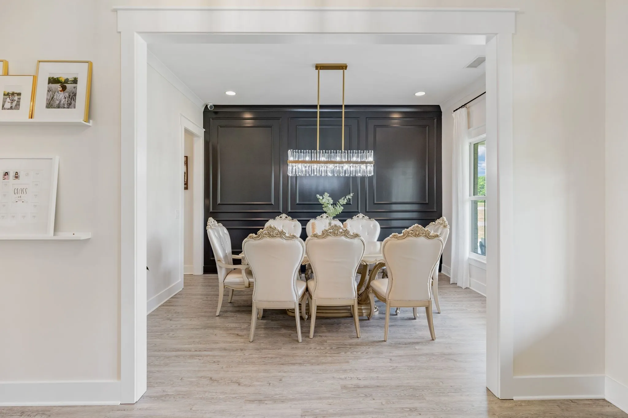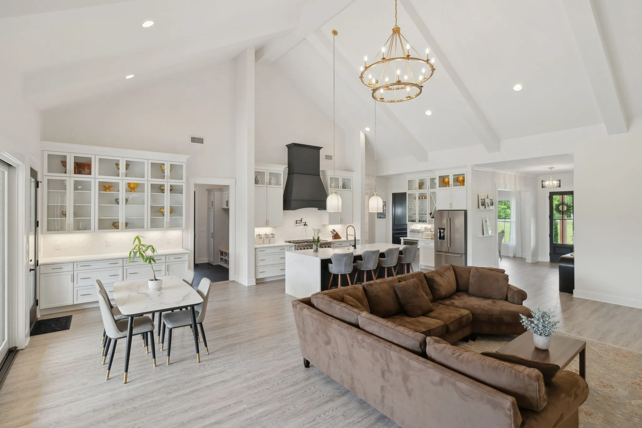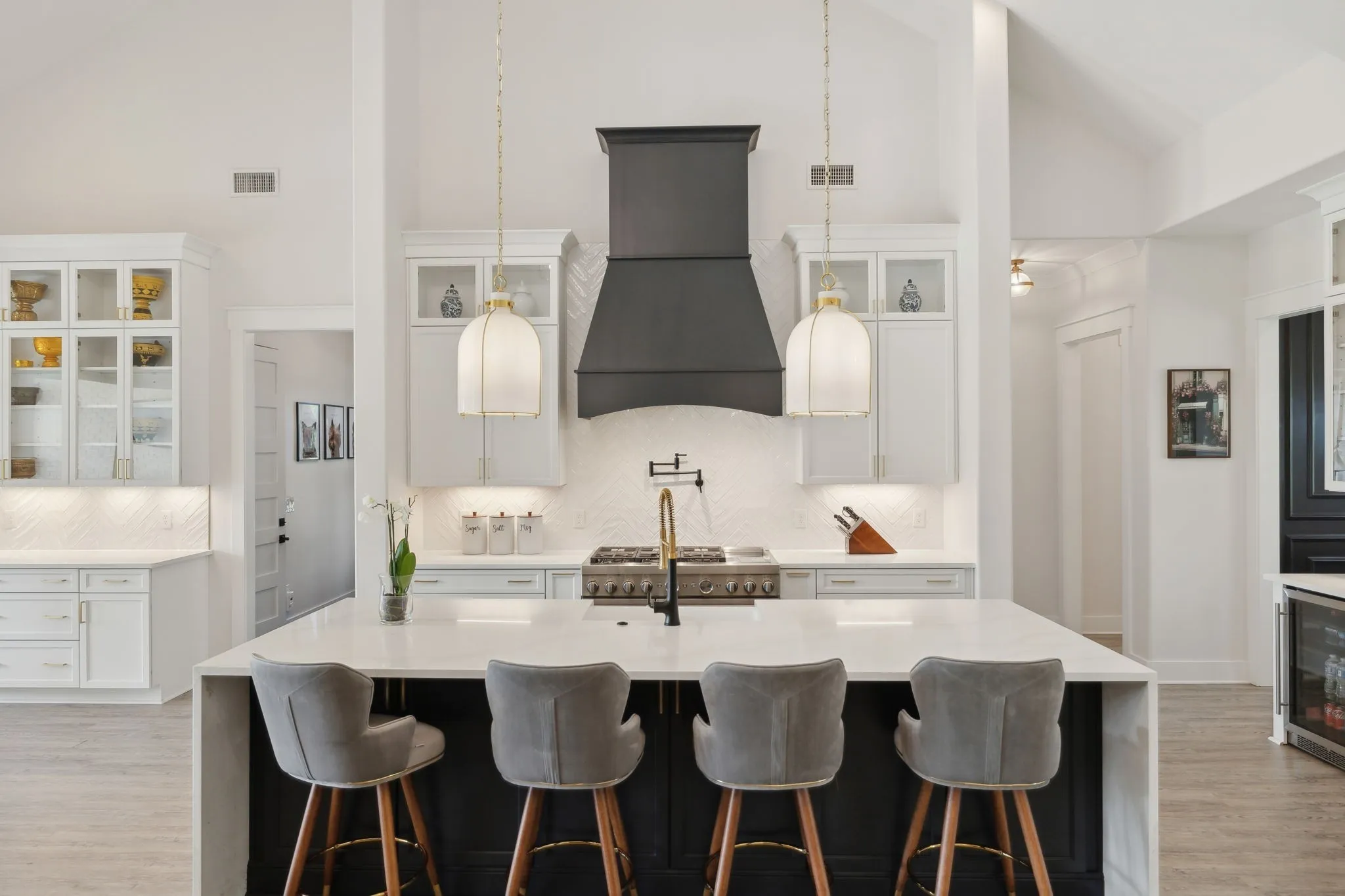 Step inside to an open concept living area that smoothly transitions into a chef’s kitchen. This space features an oversized island with waterfall countertops, a herringbone backsplash, and high-end stainless steel appliances, including a pot filler and farmhouse sink. Golden door pulls, soft-close drawers, and a beverage station enhance functionality, while a walk-in butler’s pantry with butcher block counters is ideal for meal prep.