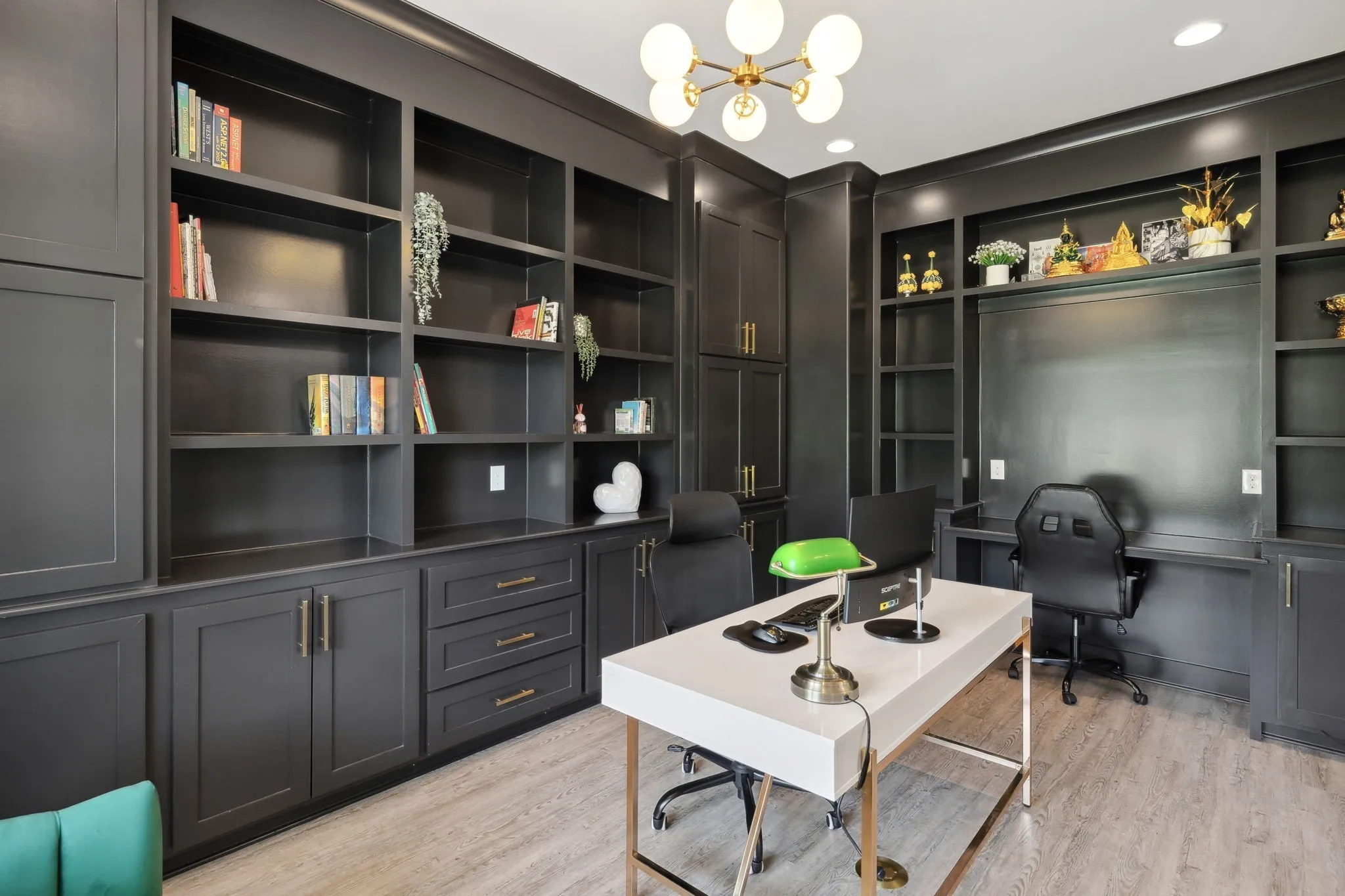 Throughout the home, decorative lighting, tall doors, and crown molding contribute to an elegant atmosphere. The formal dining room and office space are equipped with custom built-ins for added style and practicality. The owner’s suite offers a private retreat with double rain head showers, a soaking tub, and his-and-her oversized closets with barn doors. A thoughtfully concealed interior storm shelter provides peace of mind.