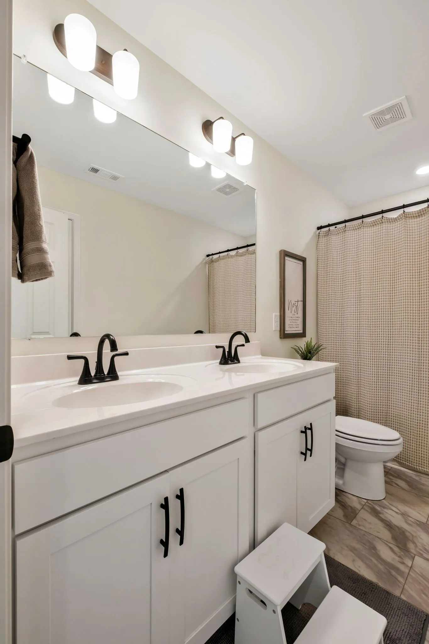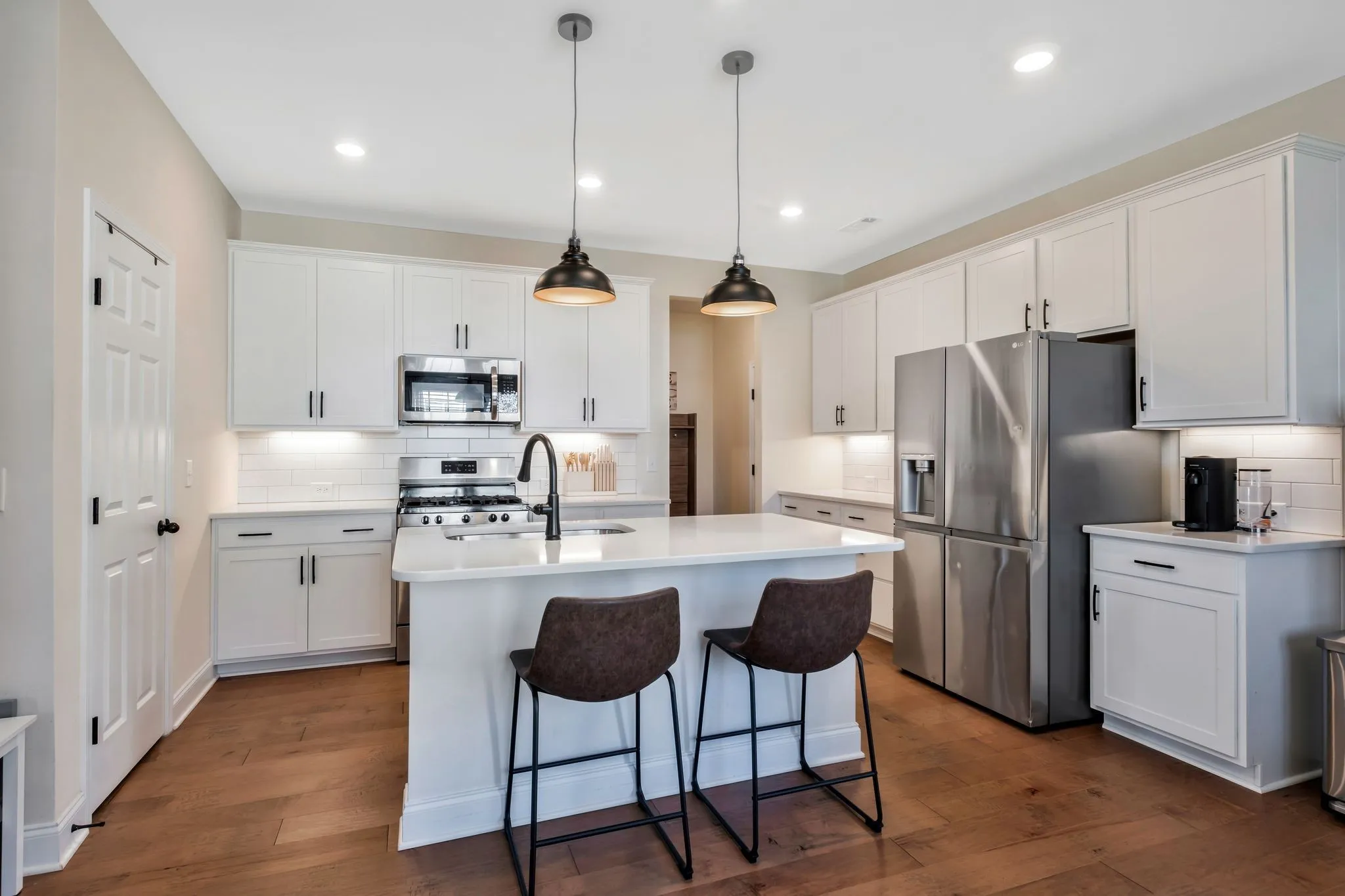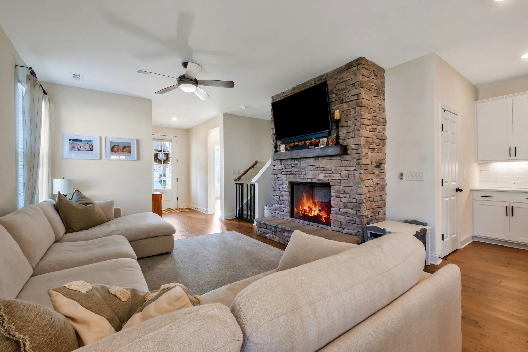 The bright, open kitchen is a showstopper with quartz countertops, stainless steel appliances, farmhouse sink, a gas range, tile backsplash, dark cabinetry, and recessed & pendant lighting that elevates the space. The living room is warm and inviting with a stacked stone gas fireplace, creating the perfect setting for relaxing or entertaining.