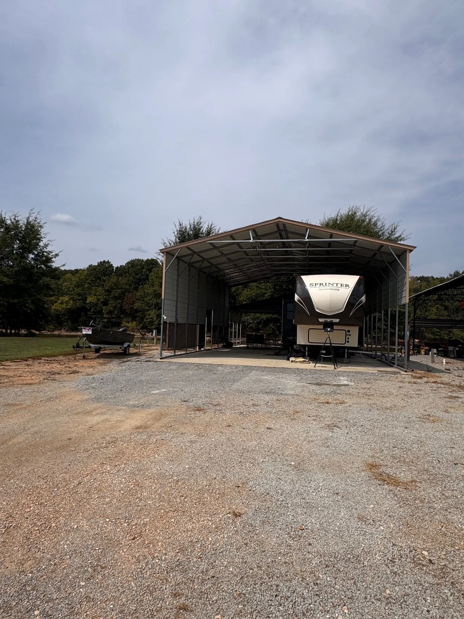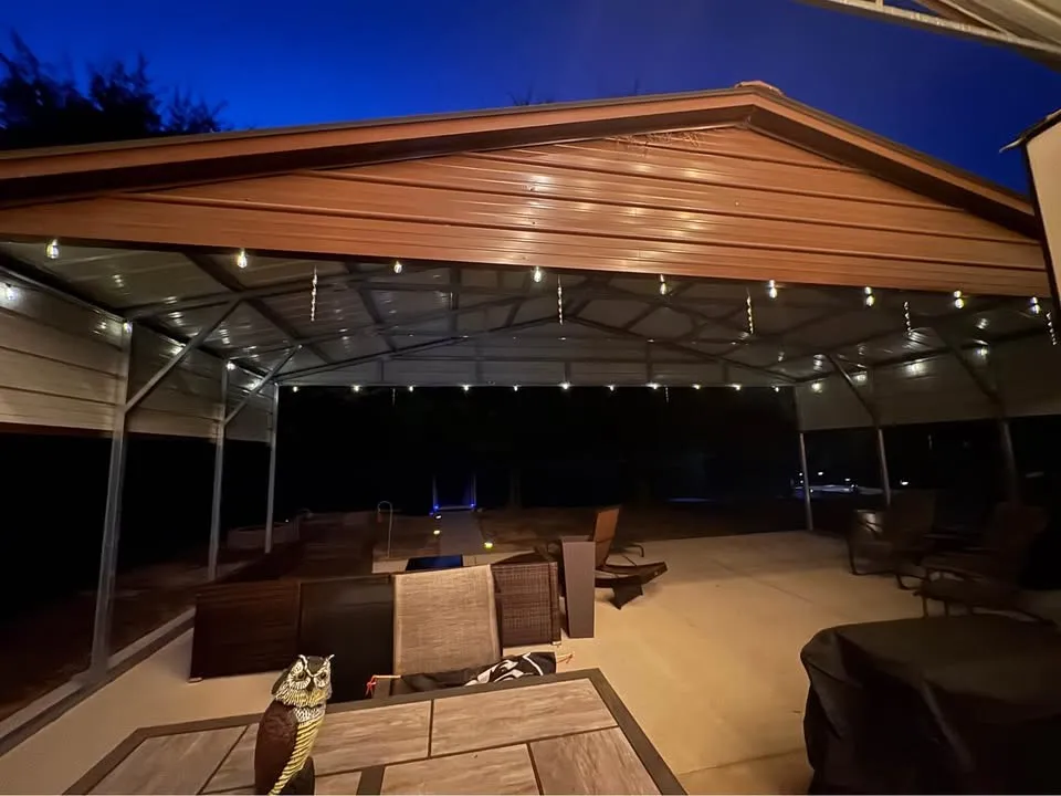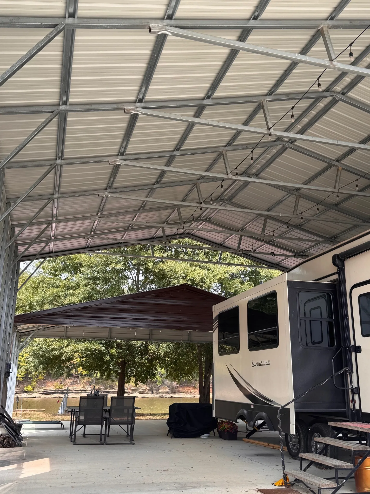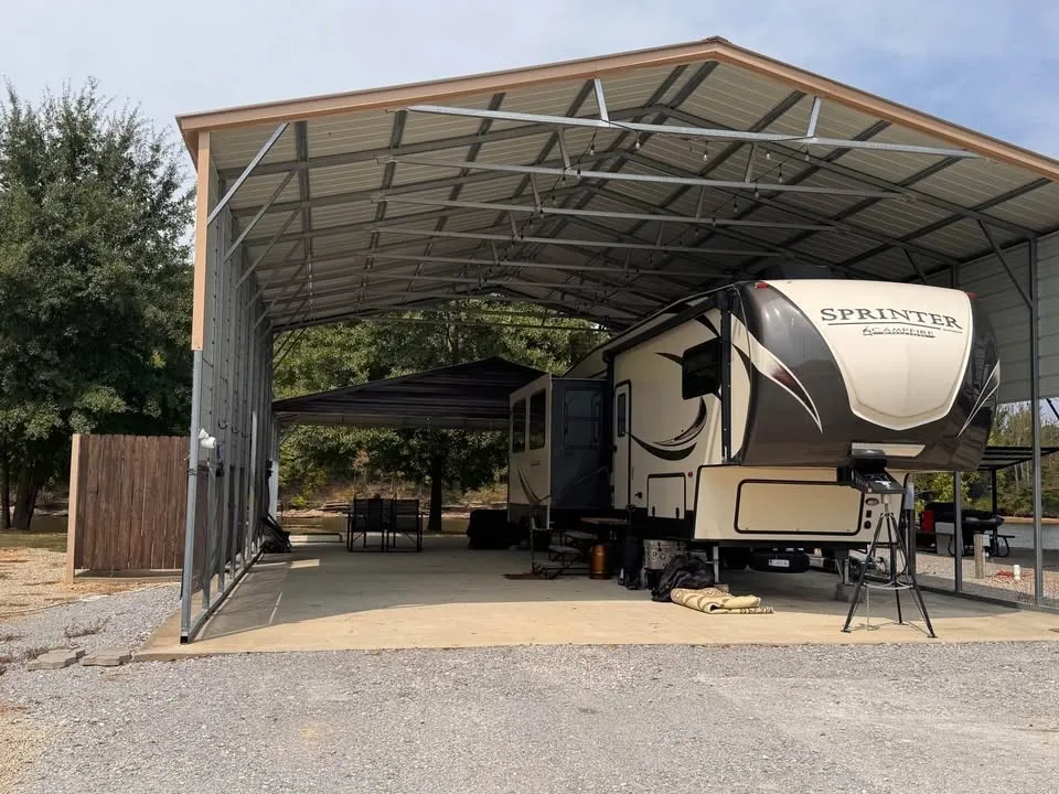 Premium Covered Space: A spacious 30×40 covered metal RV port on a concrete slab, with strung electric lights, easily accommodates your RV and boat.