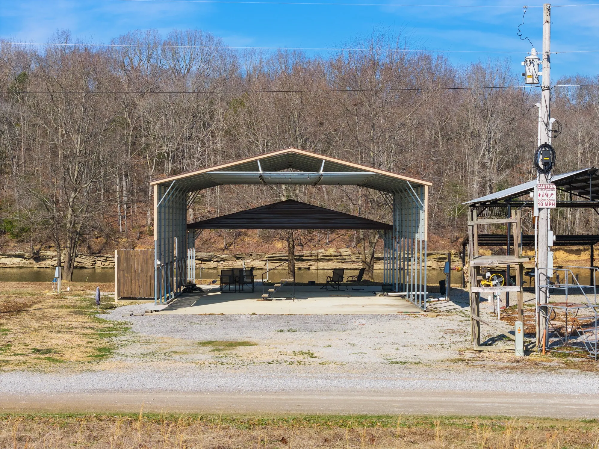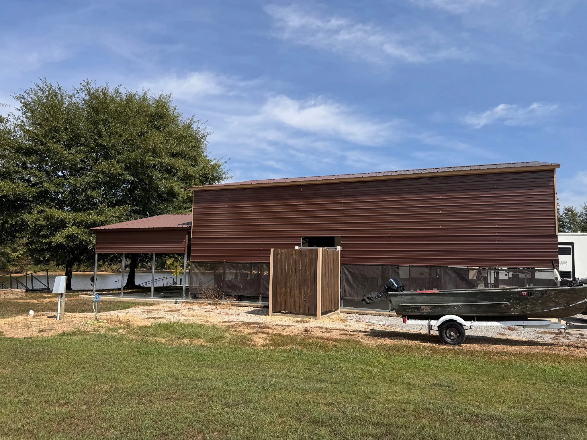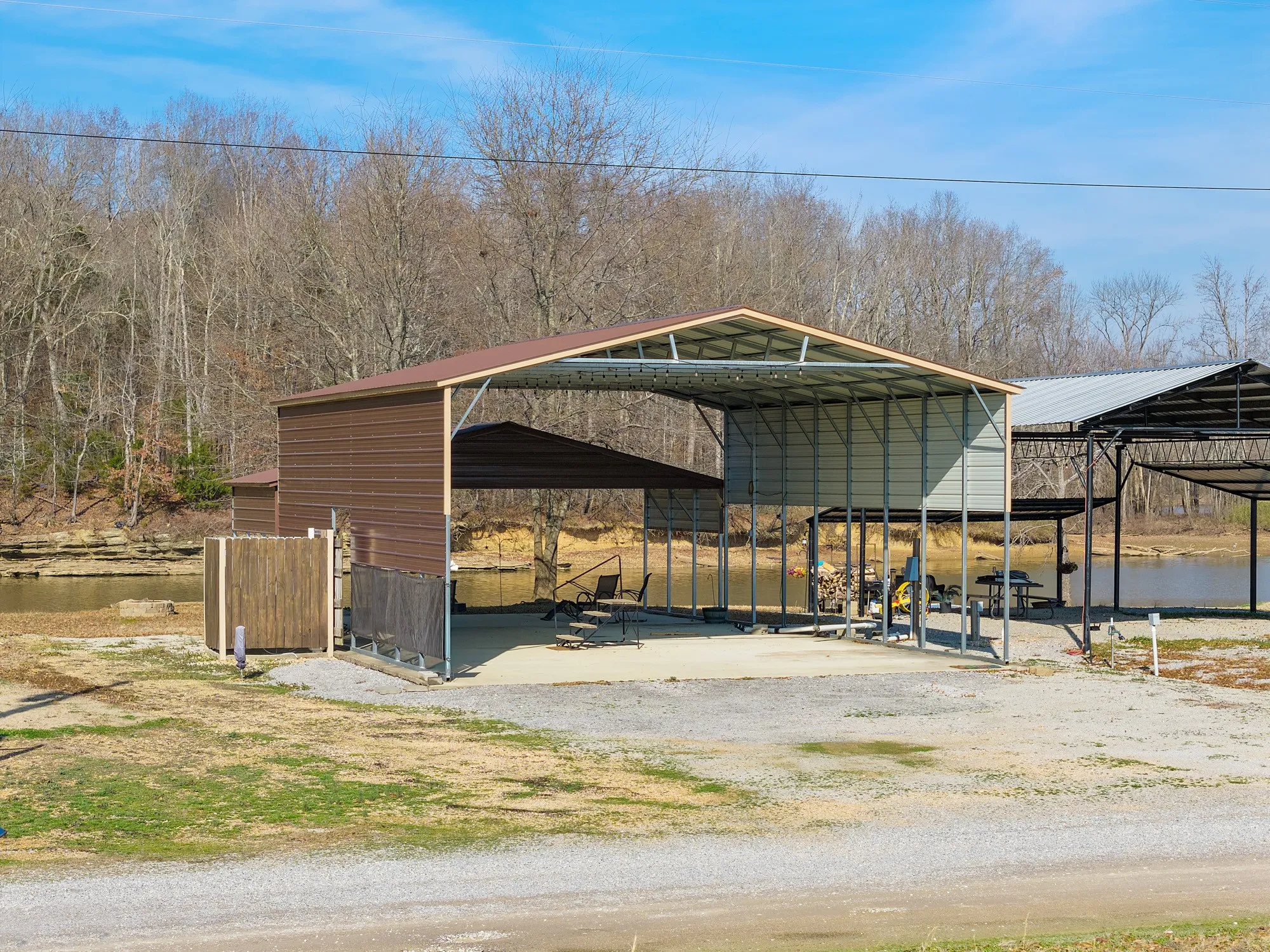 Premium Covered Space: A spacious 30×40 covered metal RV port on a concrete slab, with strung electric lights, easily accommodates your RV and boat.