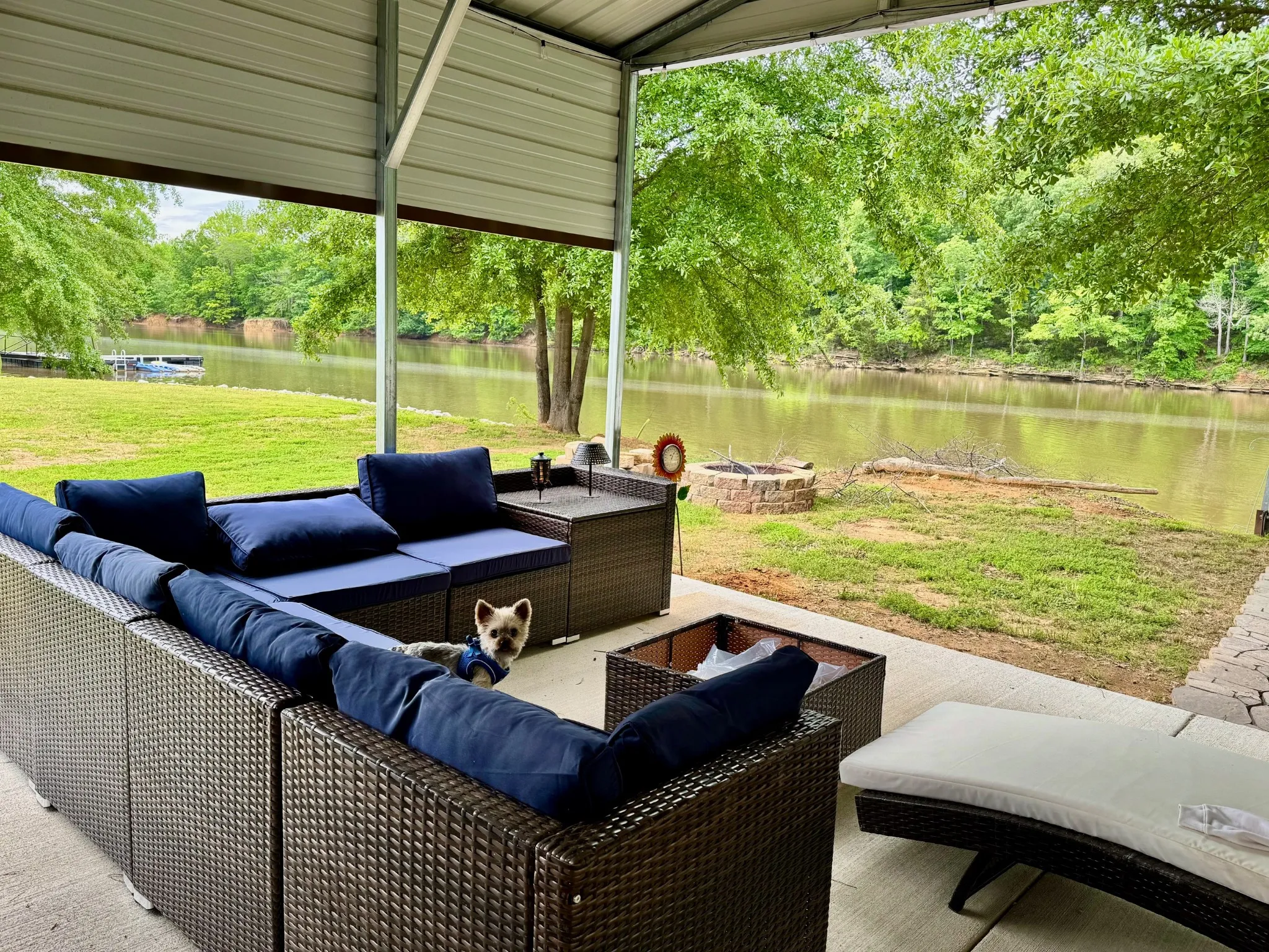 Outdoor Entertainment: Enjoy a 30×15 covered patio/grilling area on a concrete slab, complete with solar lights. It’s the perfect spot for a patio sectional, morning coffee, or watching TV with a scenic river view.