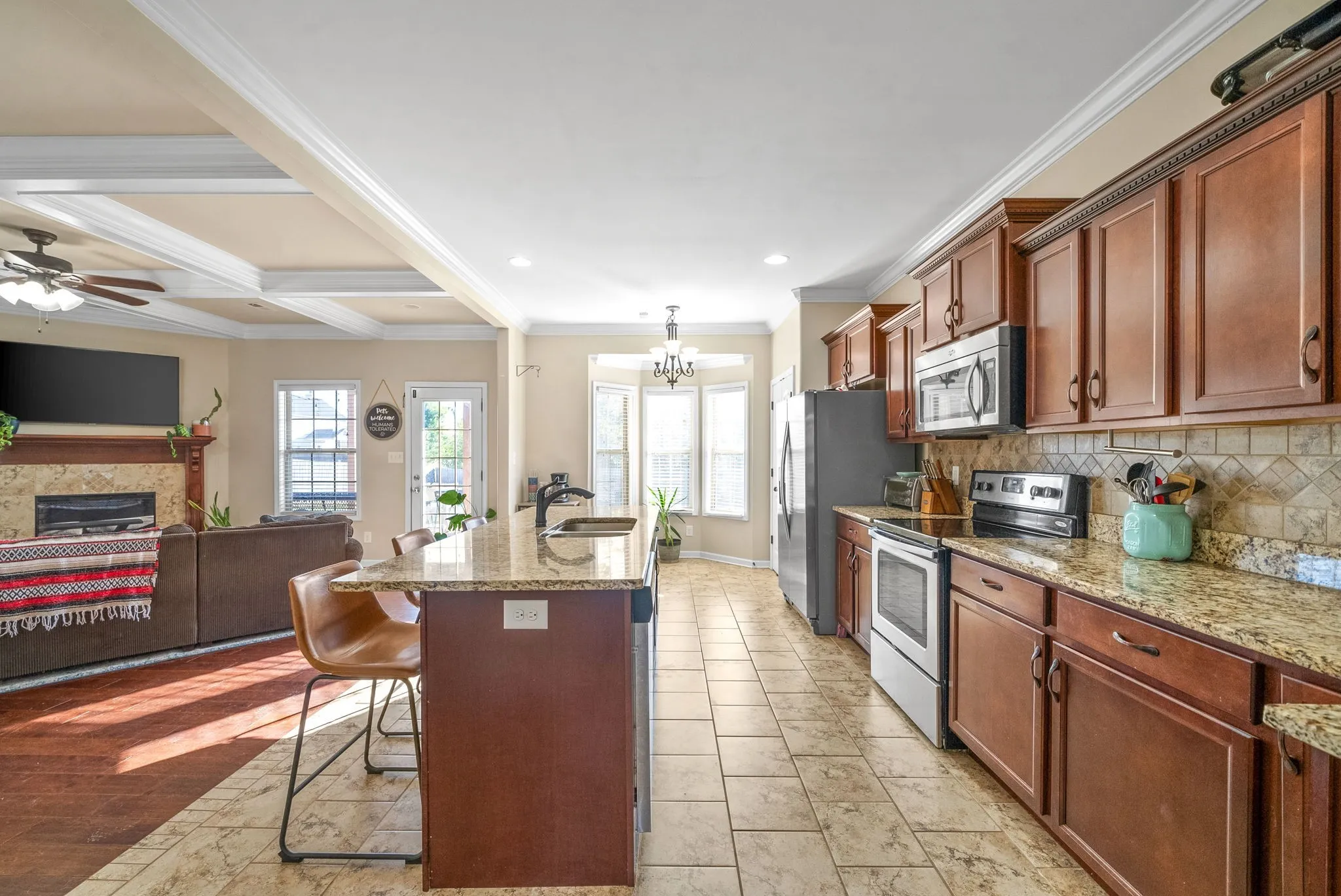 Check out this beautiful home! Beautiful covered front porch! Stunning entrance for decorations. Coffered ceilings in living room with a fireplace with an open floor plan! Stunning island in kitchen that leads open to the living room. Perfect for sitting on some stools or enjoying coffee! Spacious pantry in eat in kitchen! So much cabinet and counterspace. Huge formal dining room with Trey ceilings and beautiful wainscoting! One bedroom downstairs with a Trey ceilings! Primary bedroom is HUGE! So much space in there, double vanities in bathroom, separate shower and tub in primary bathroom, tilework throughout! Bench in primary shower! 3 additional huge bedrooms upstairs! Beautiful backyard with an outside fireplace! Fenced in yard!