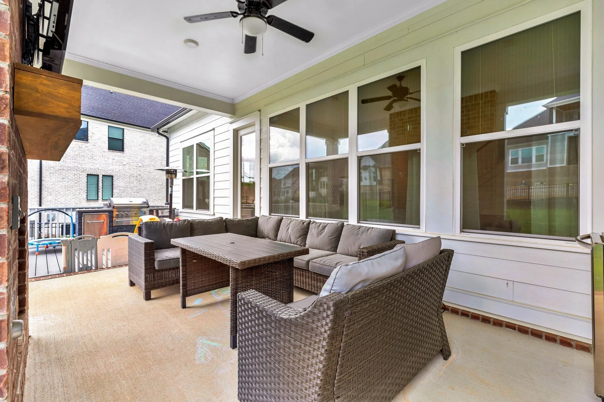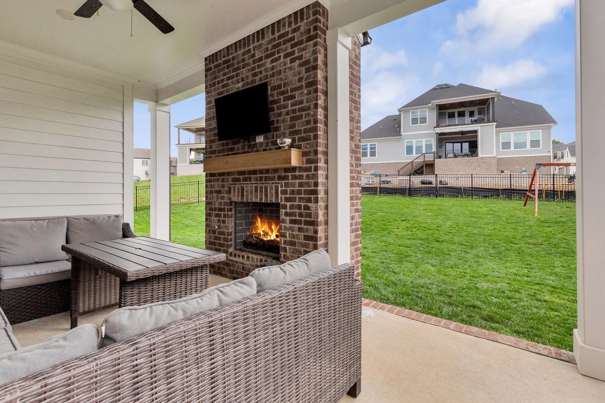 Outdoor amenities include a wraparound front porch, covered rear porch with fireplace, dedicated grilling area, and ample green space ideal for family and pets.