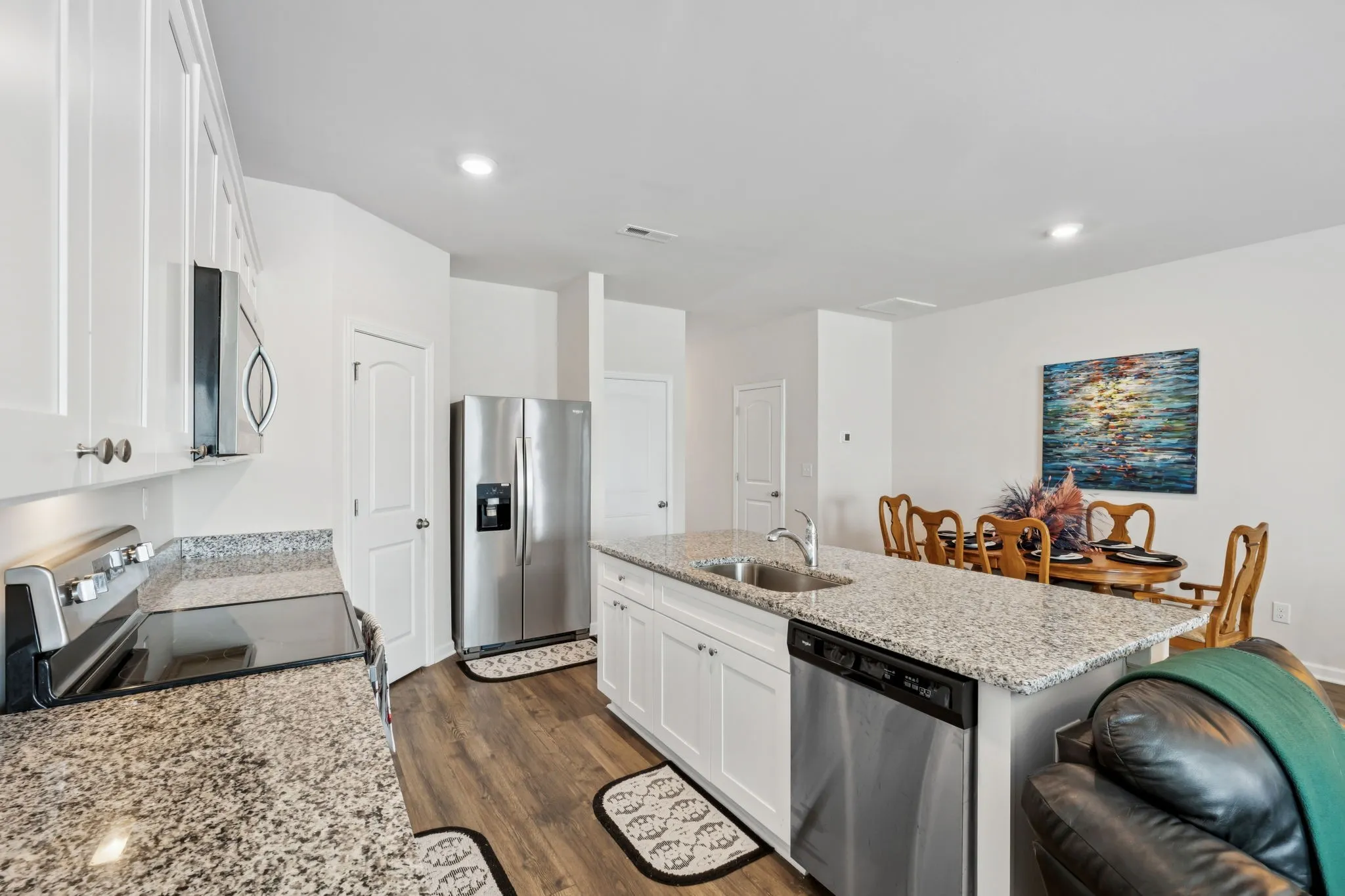 The open-concept main level features a bright and inviting family room that flows seamlessly into a chef-inspired kitchen with granite countertops, designer wood cabinetry, and a full suite of energy-efficient Whirlpool® appliances, including the refrigerator. Luxury vinyl plank flooring, LED lighting, and a dedicated dining area create a functional and stylish space that’s easy to live in and easy to maintain.