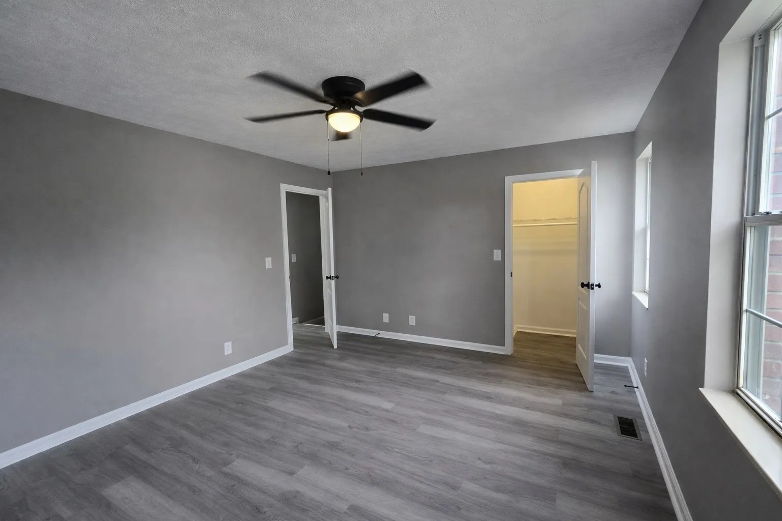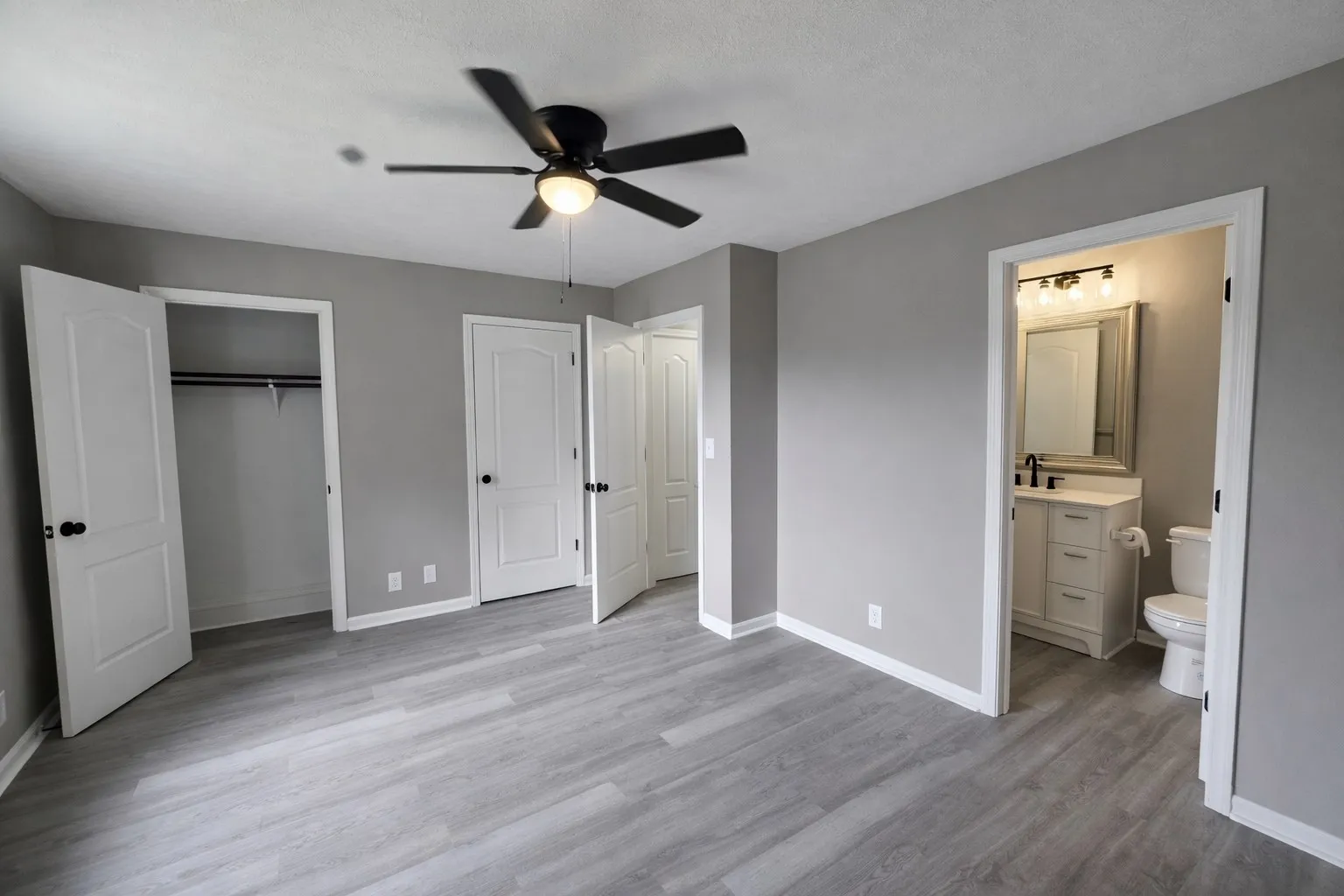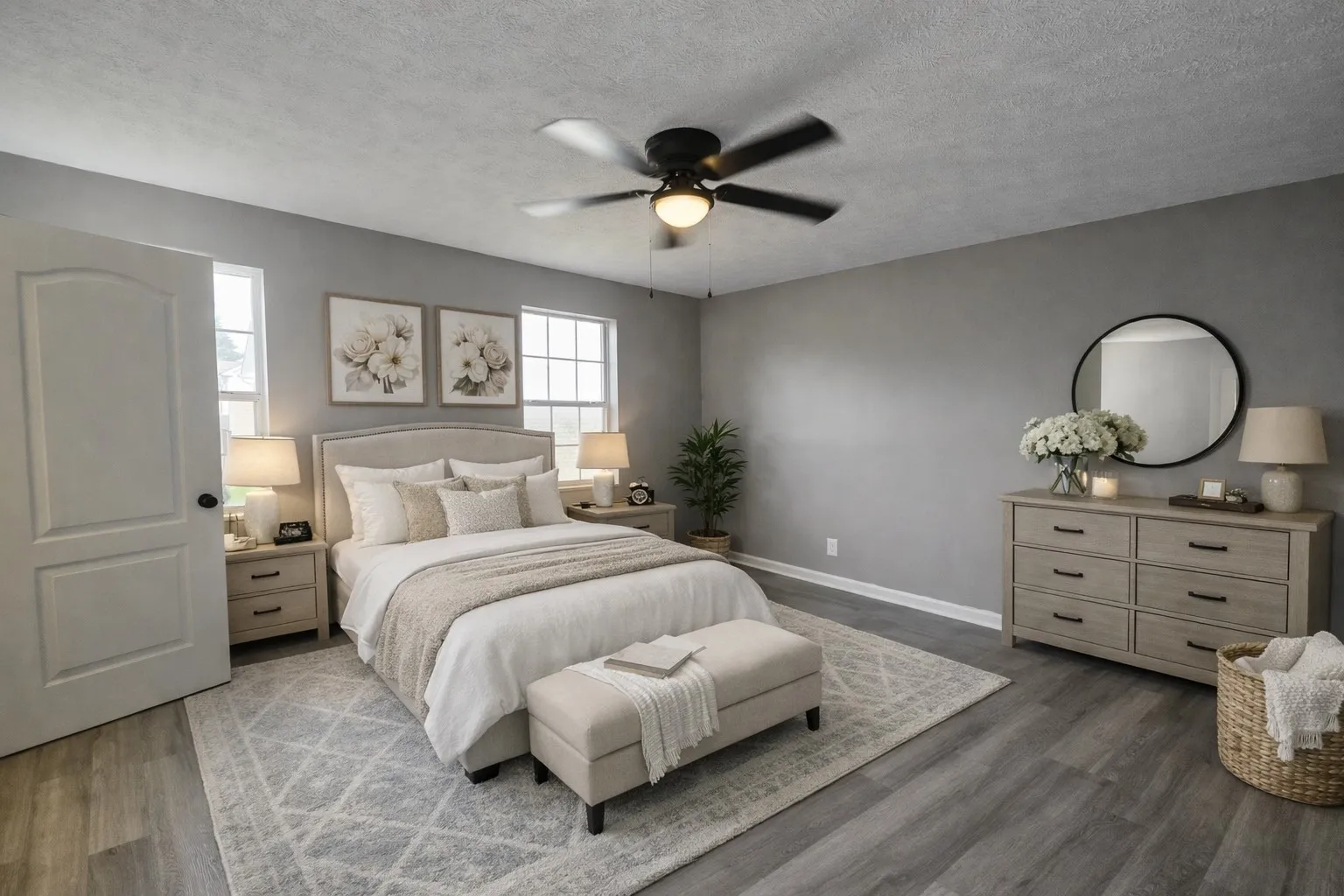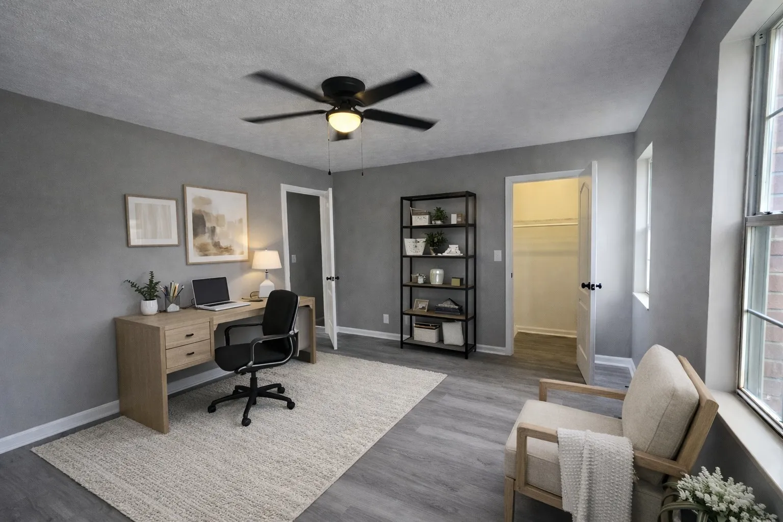The spacious bedrooms feel airy and serene, with abundant natural light, sleek gray flooring, and contemporary ceiling fans that add both comfort and charm. Flexible rooms have been virtually staged to show their full potential—imagine a peaceful home office ideal for remote work, a fun and functional kids’ playroom, or a cozy guest space tailored to your lifestyle, the possibilities are endless.