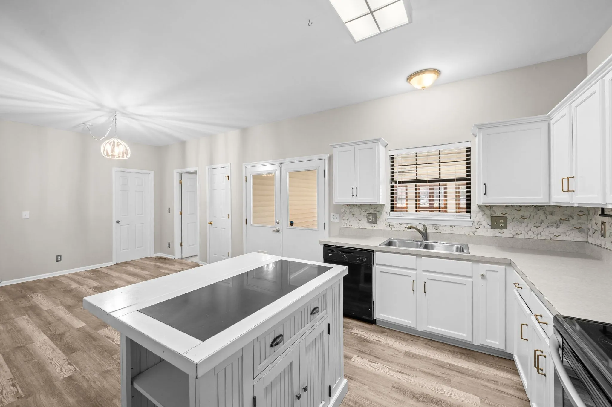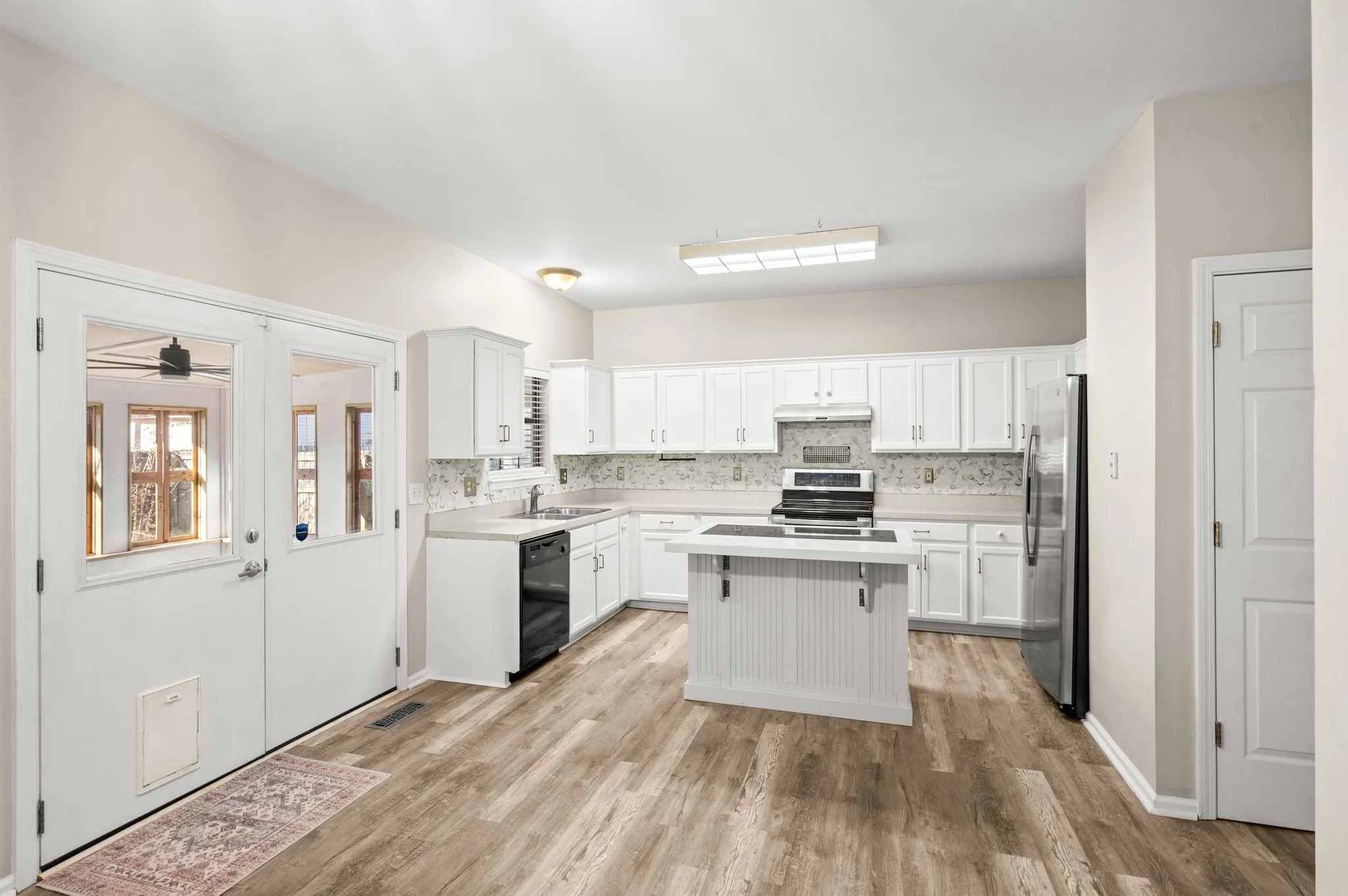 WHITE Kitchen with Island and STAINLESS appliances, LVP flooring on the main level. Primary Suite on the MAIN, DARLING cedar plank door & Insulated PATIO room for year around pleasure, VAULTED ceiling in the living room with WOOD burning fireplace. Expansion area or storage area is a wonderful feature. Washer/Dryer to remain. Located on a corner lot, full PRIVACY fencing in backyard with Mini Metal storage shed. Bring your Dog!!Very convenience to shopping, restaurants and trails and Parks!