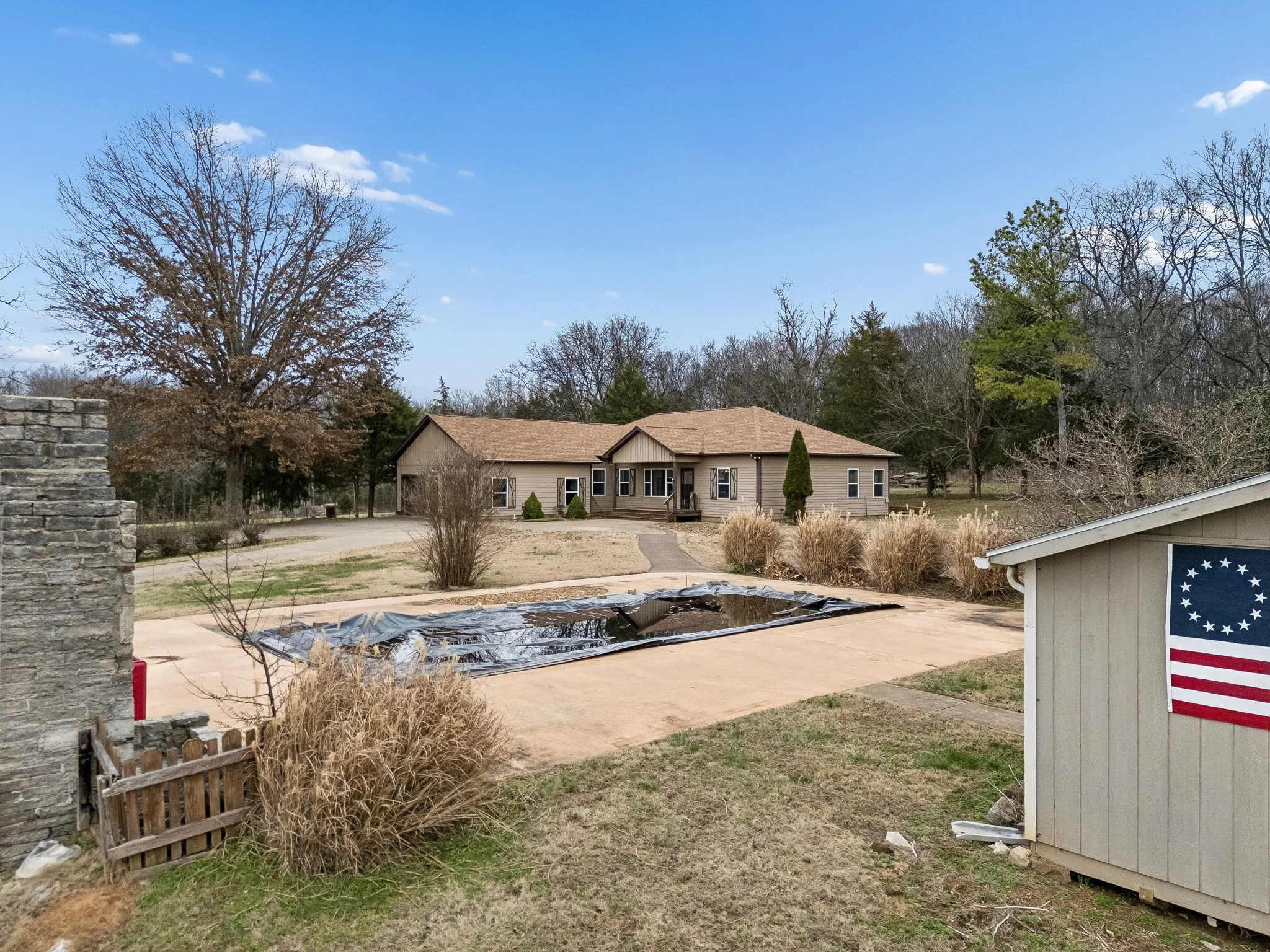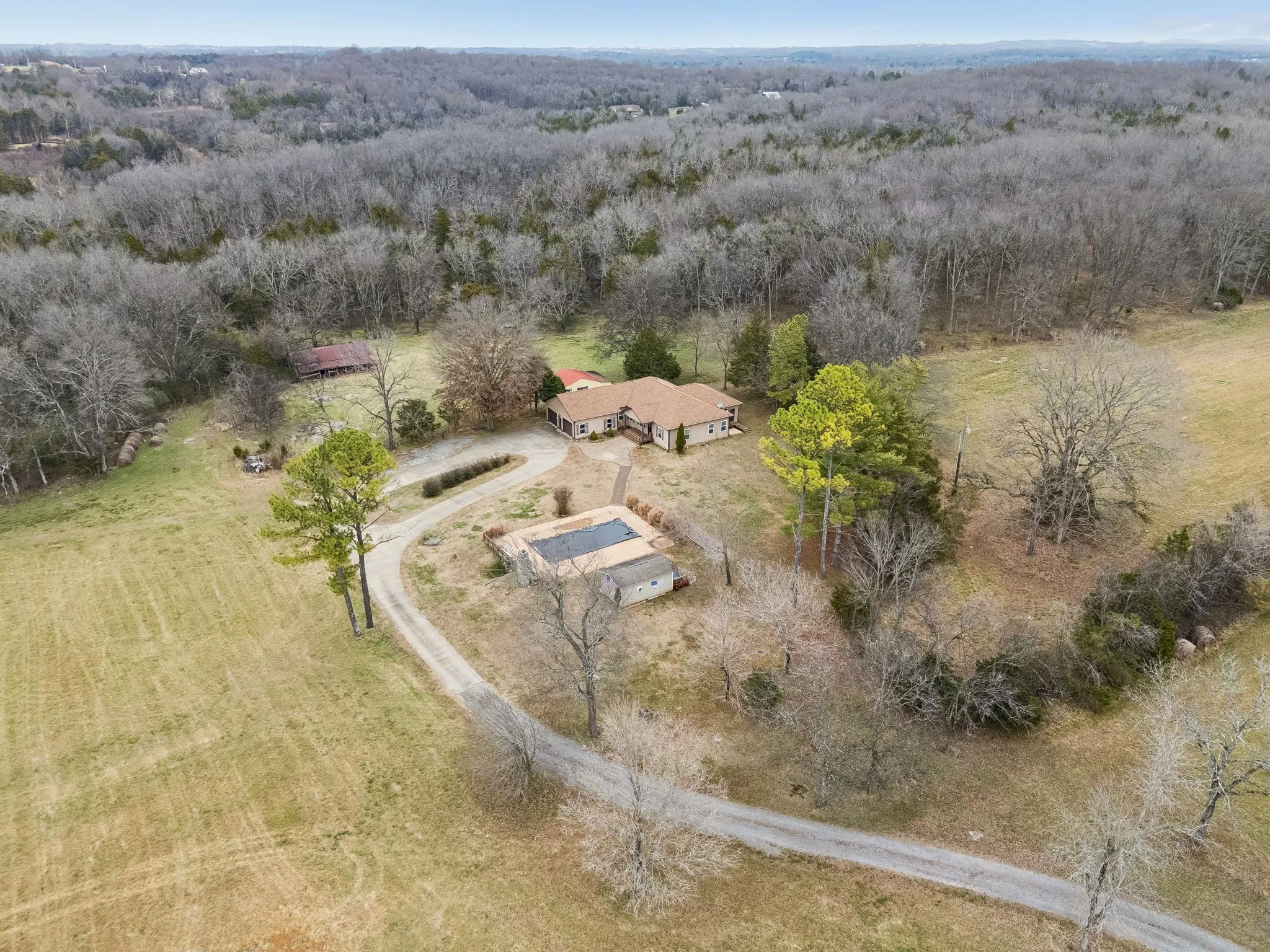 Horse lovers dream farm, very private. Custom built home with many upgrades, Granite countertops, inground pool with pool house, with half bath. Mostly open land, hay has been cut yearly. Hay barn 30×65 will hold several large rolls hay. Small shop building behind house has concrete floors and electricity. Large windmill in trees. Airport 10 miles away. Twin Pines golf course 3.5 miles away.