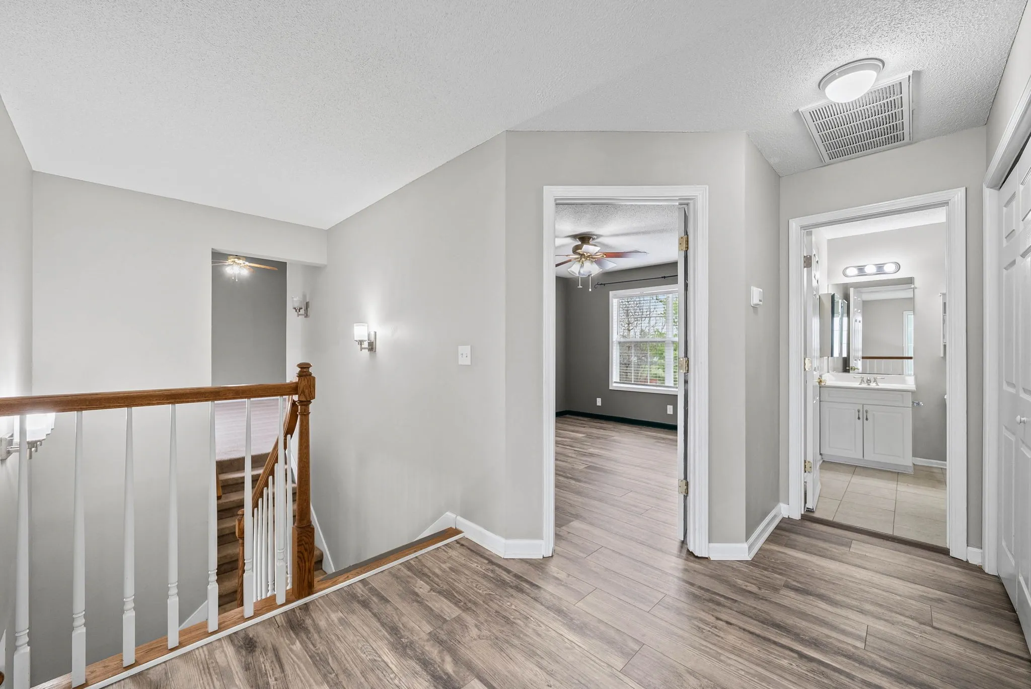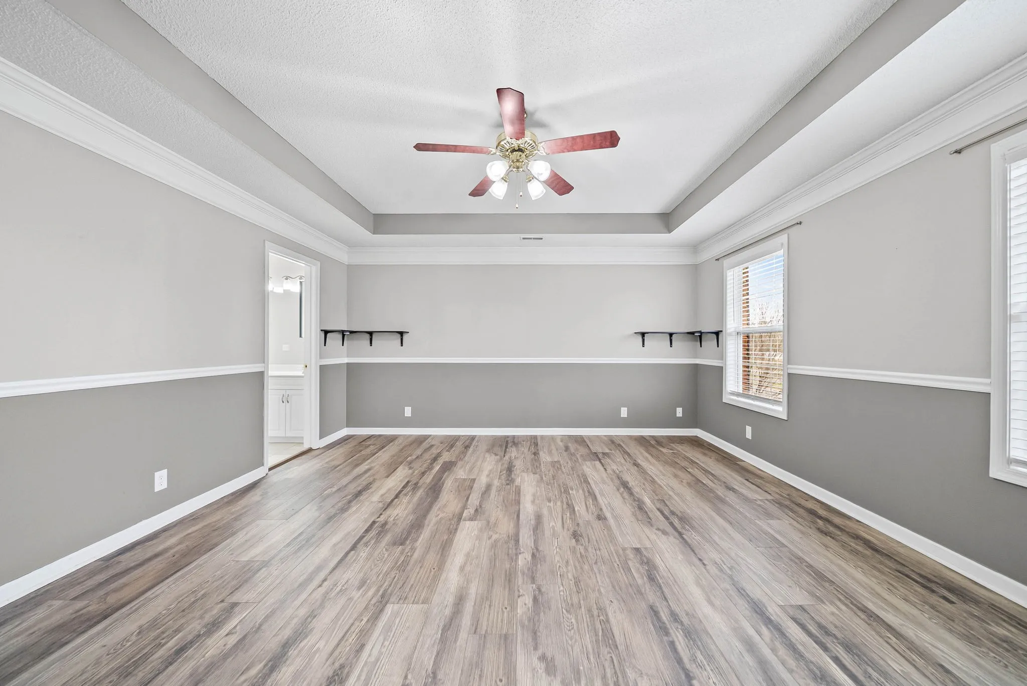 All bedrooms are located upstairs and include ceiling fans for added comfort. The washer and dryer are conveniently located upstairs and are included with the home. The oversized primary suite features elegant tray-style ceilings and a private ensuite bath with dual sinks, a jacuzzi tub, and a separate standing shower.