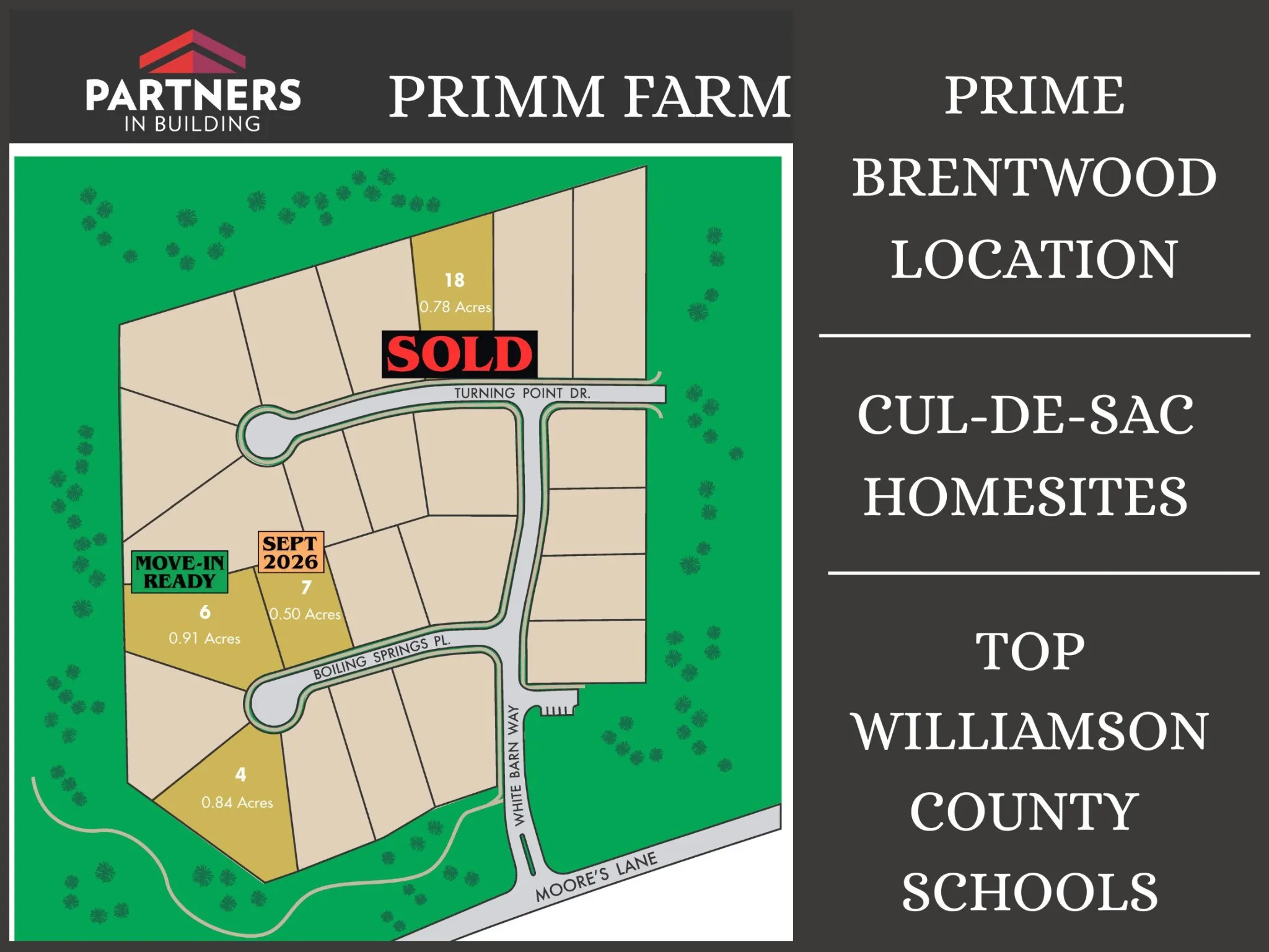 - Directions: GPS: 8318 Moores Lane Brentwood, TN 37027 • I-65 to Exit 69 Moores Lane EAST Toward Wilson Pike • Continue on Moores Lane 1.5 Mile to LEFT on White Barn Way into PRIMM FARM • Immediate Left on Boiling Springs • 3rd Lot on Right