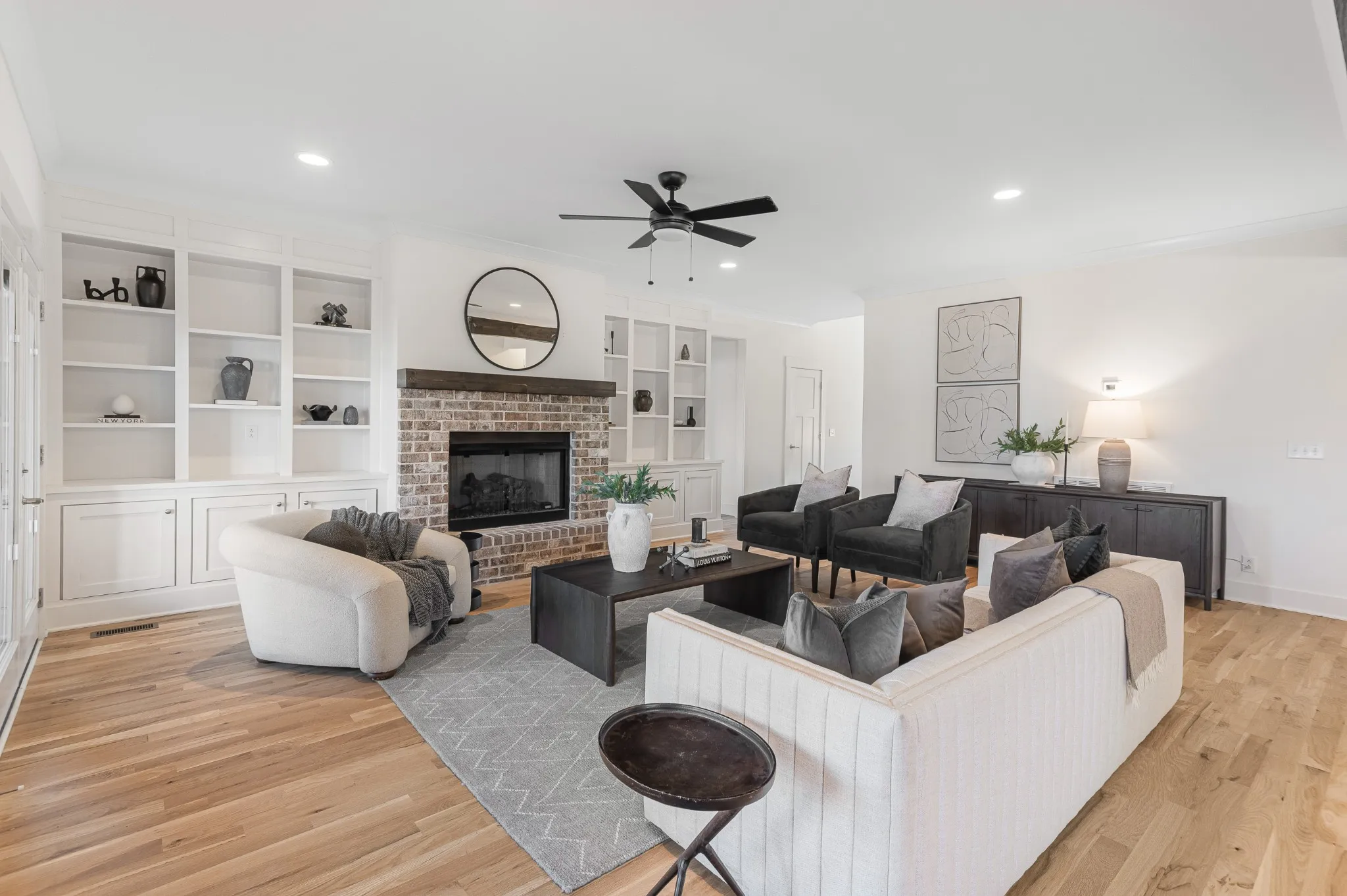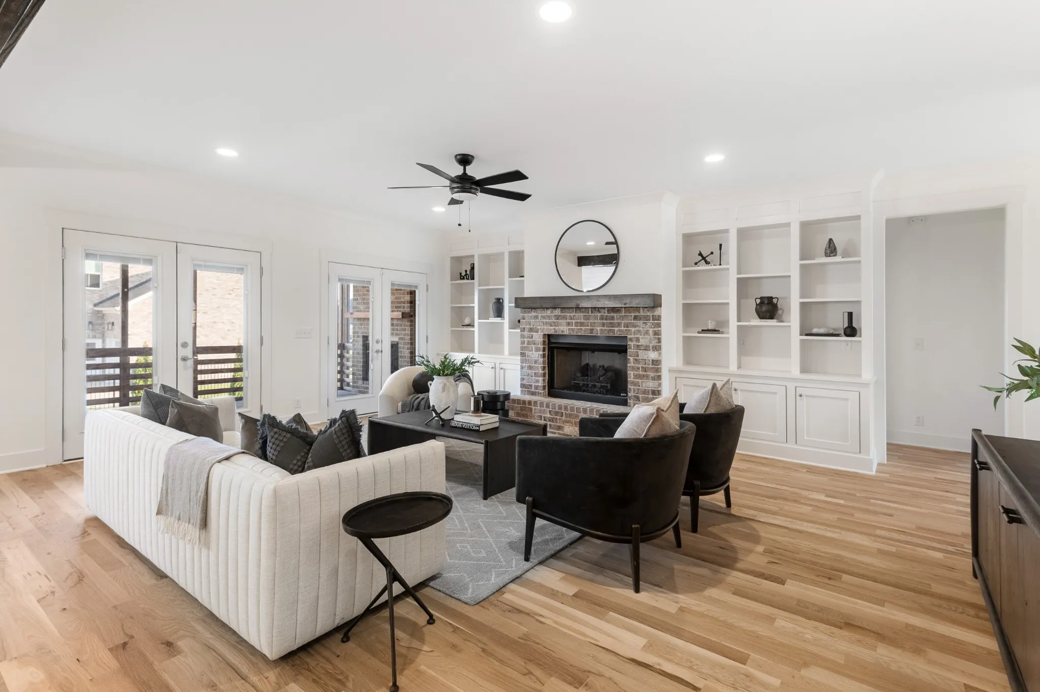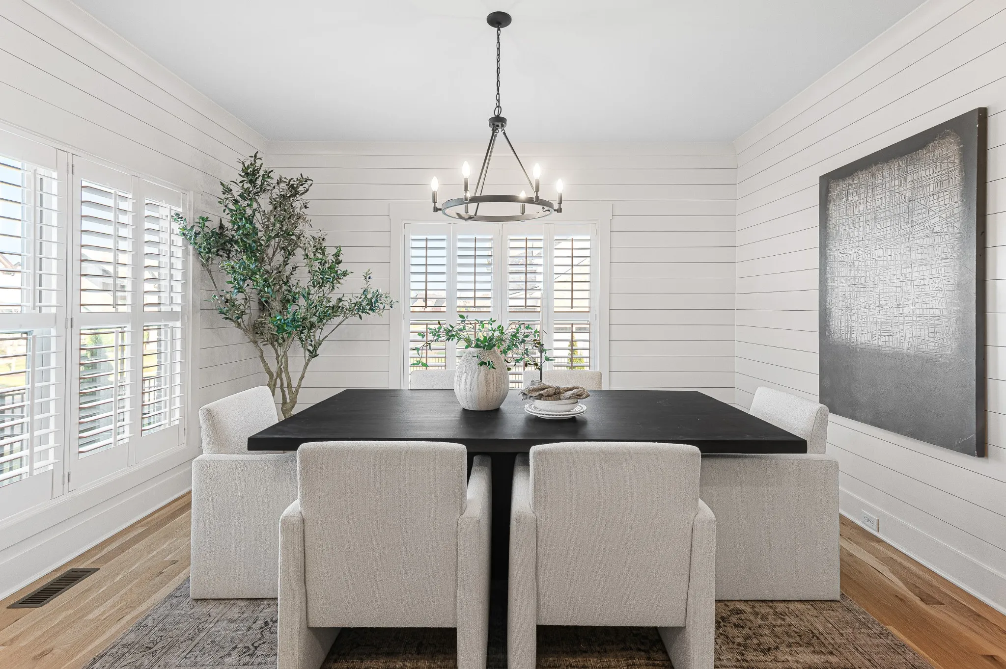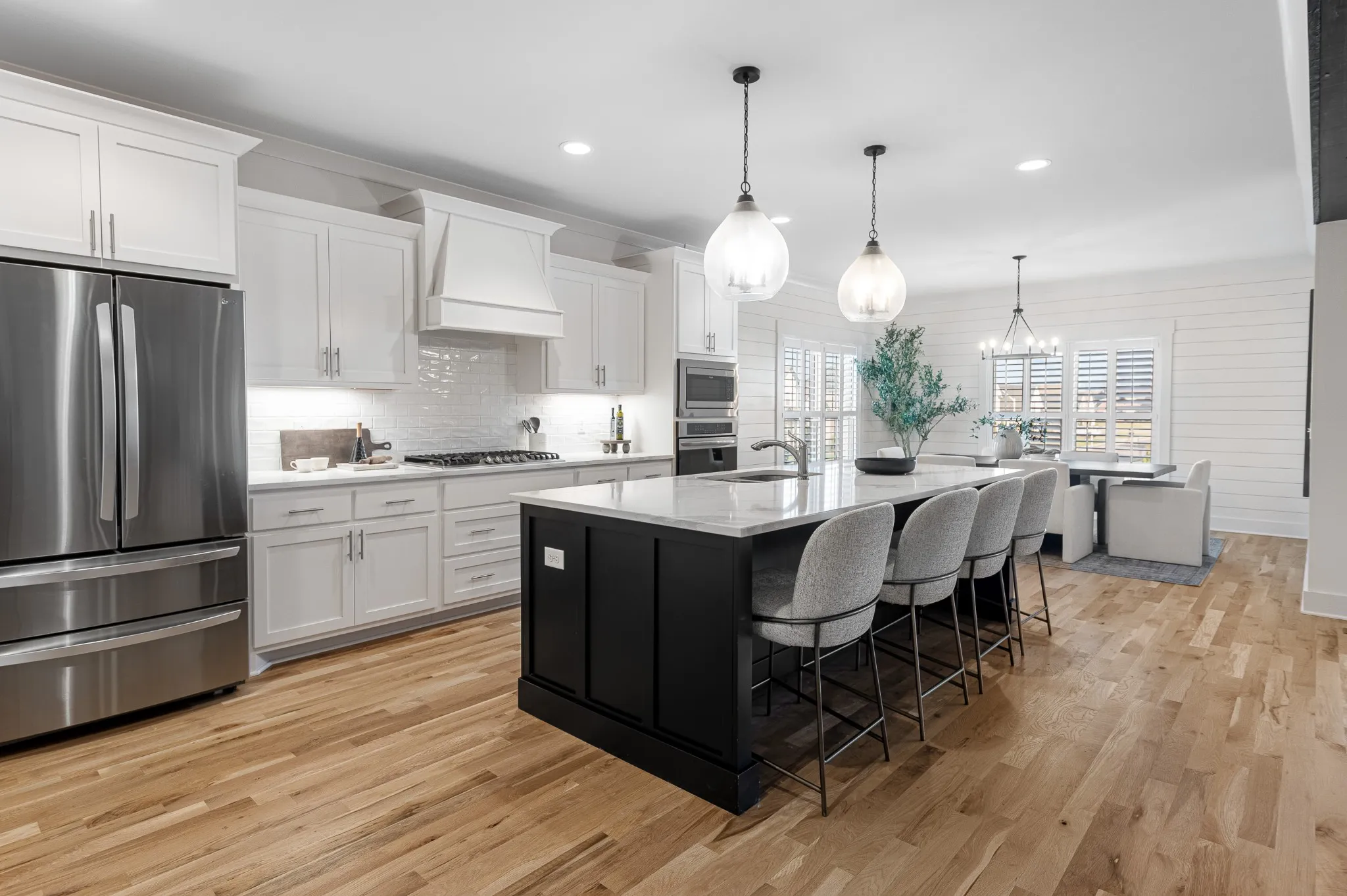 Inside, hardwood floors and soaring ceilings create a bright, open atmosphere throughout the main living areas. The dining room features shiplap walls and plantation shutters. The chef’s-style kitchen features quartz countertops, stainless steel appliances, a spacious island, tile backsplash and abundant cabinetry, all overlooking the inviting living room with a gas fireplace and custom built-ins. The primary suite on the main level is a true retreat, complete with a spa-like bath showcasing double vanities, a soaking tub, a tiled shower, and a generously sized custom closet.