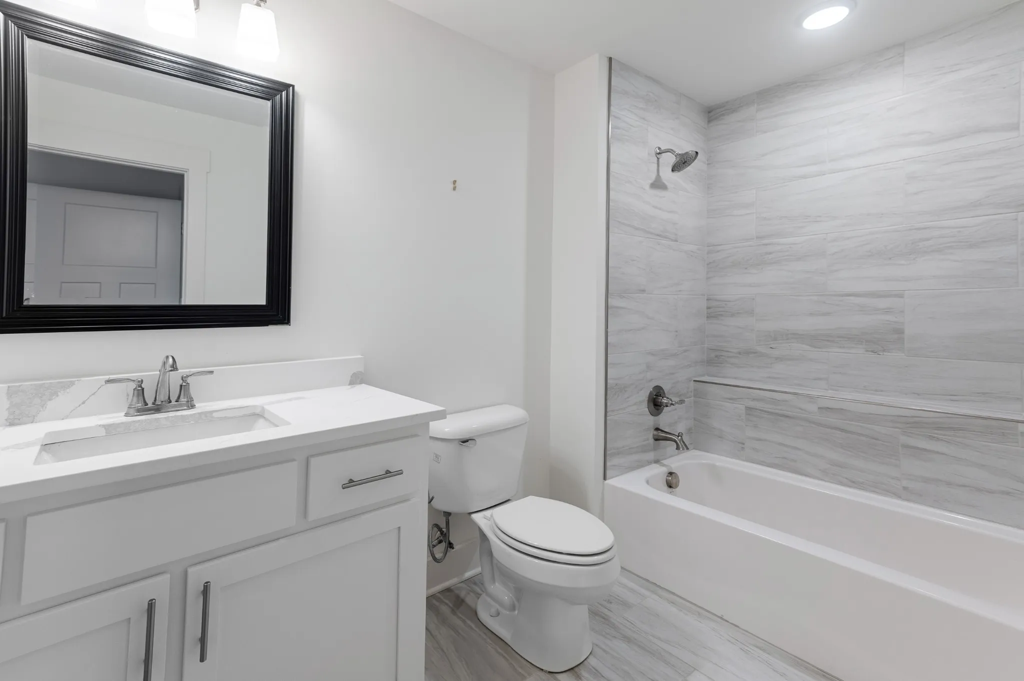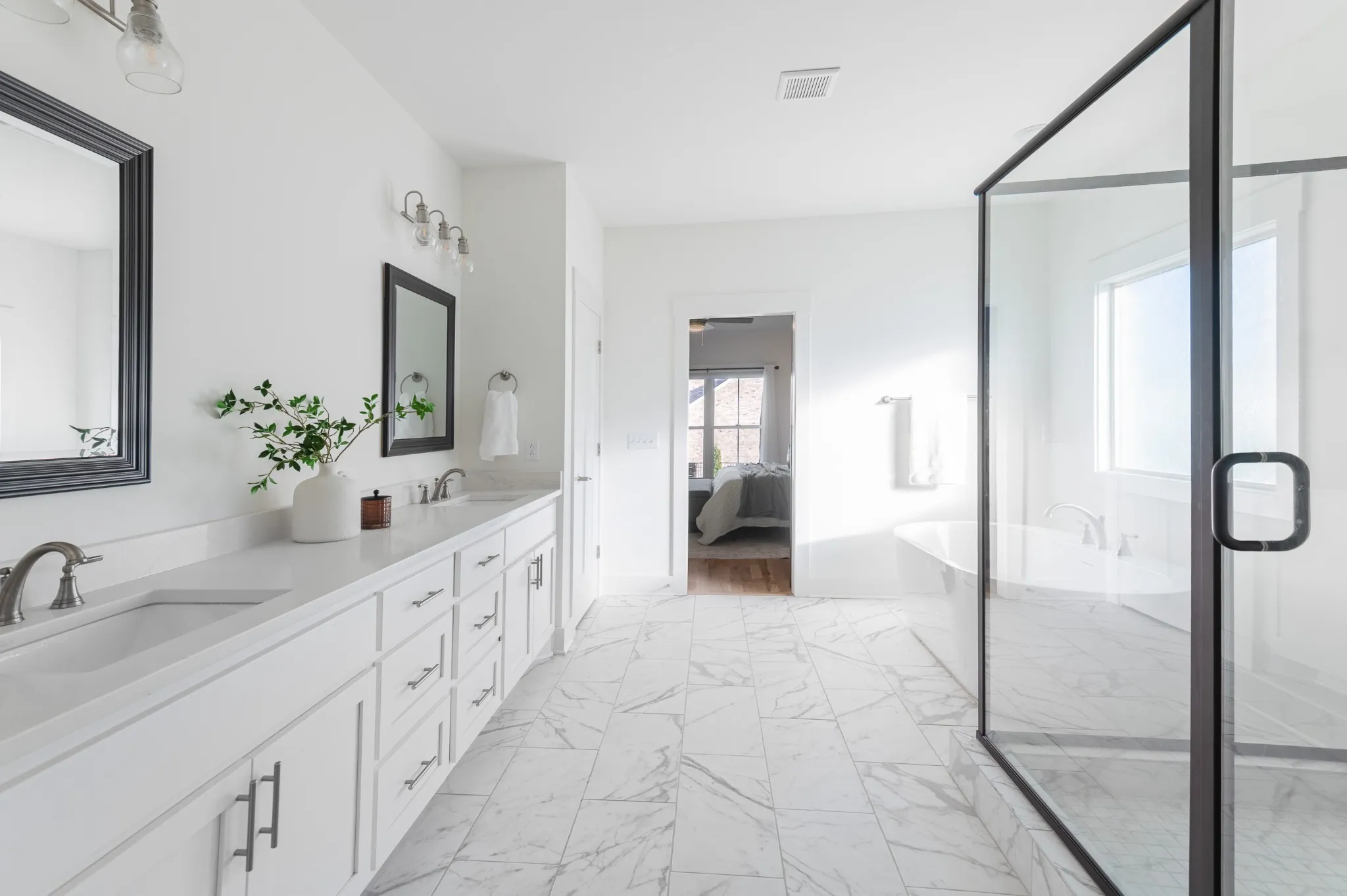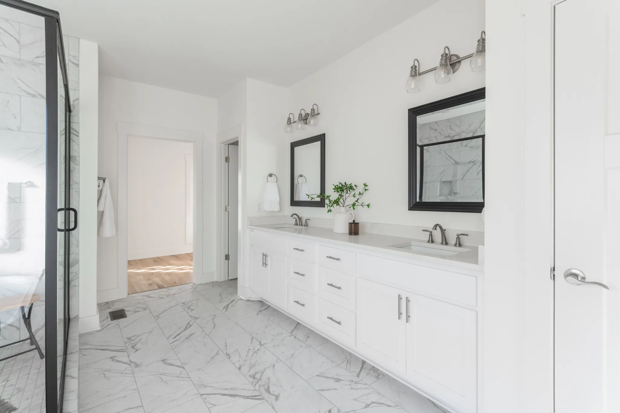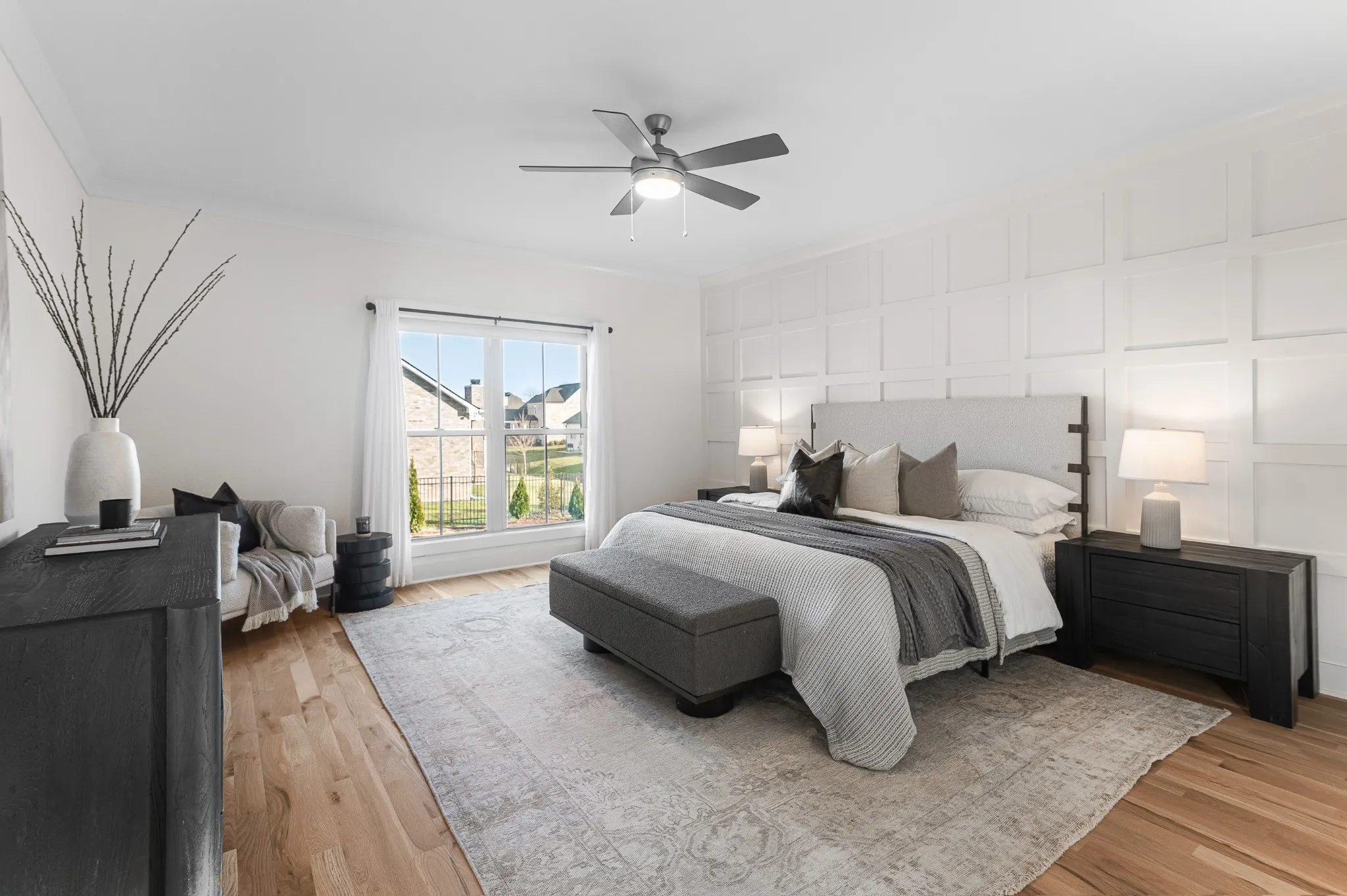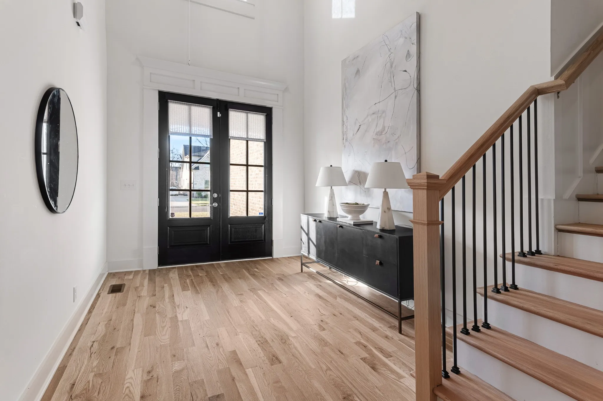 Inside, hardwood floors and soaring ceilings create a bright, open atmosphere throughout the main living areas. The dining room features shiplap walls and plantation shutters. The chef’s-style kitchen features quartz countertops, stainless steel appliances, a spacious island, tile backsplash and abundant cabinetry, all overlooking the inviting living room with a gas fireplace and custom built-ins. The primary suite on the main level is a true retreat, complete with a spa-like bath showcasing double vanities, a soaking tub, a tiled shower, and a generously sized custom closet.