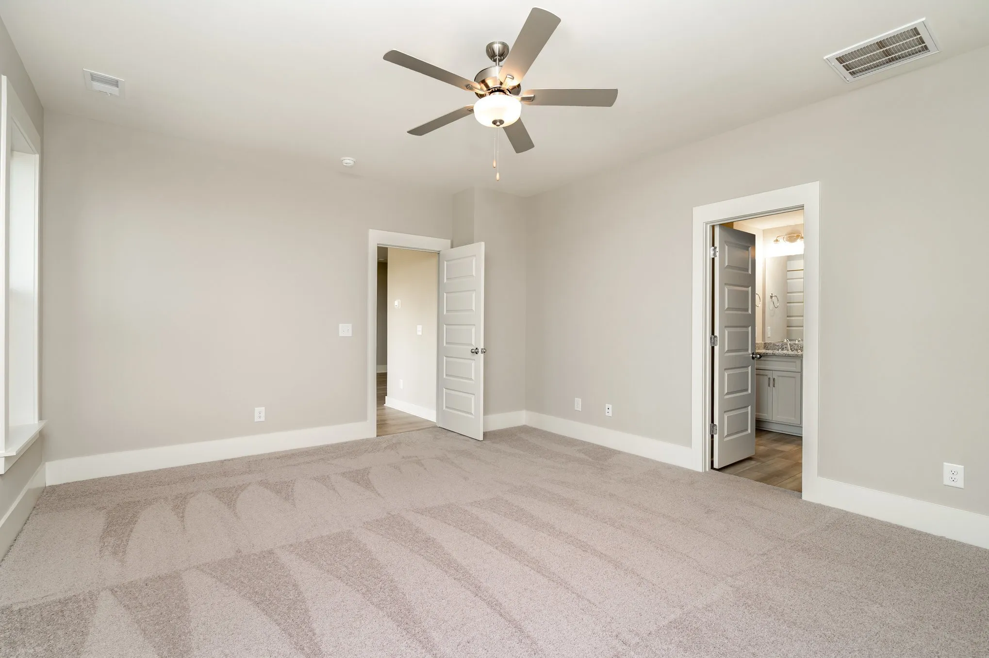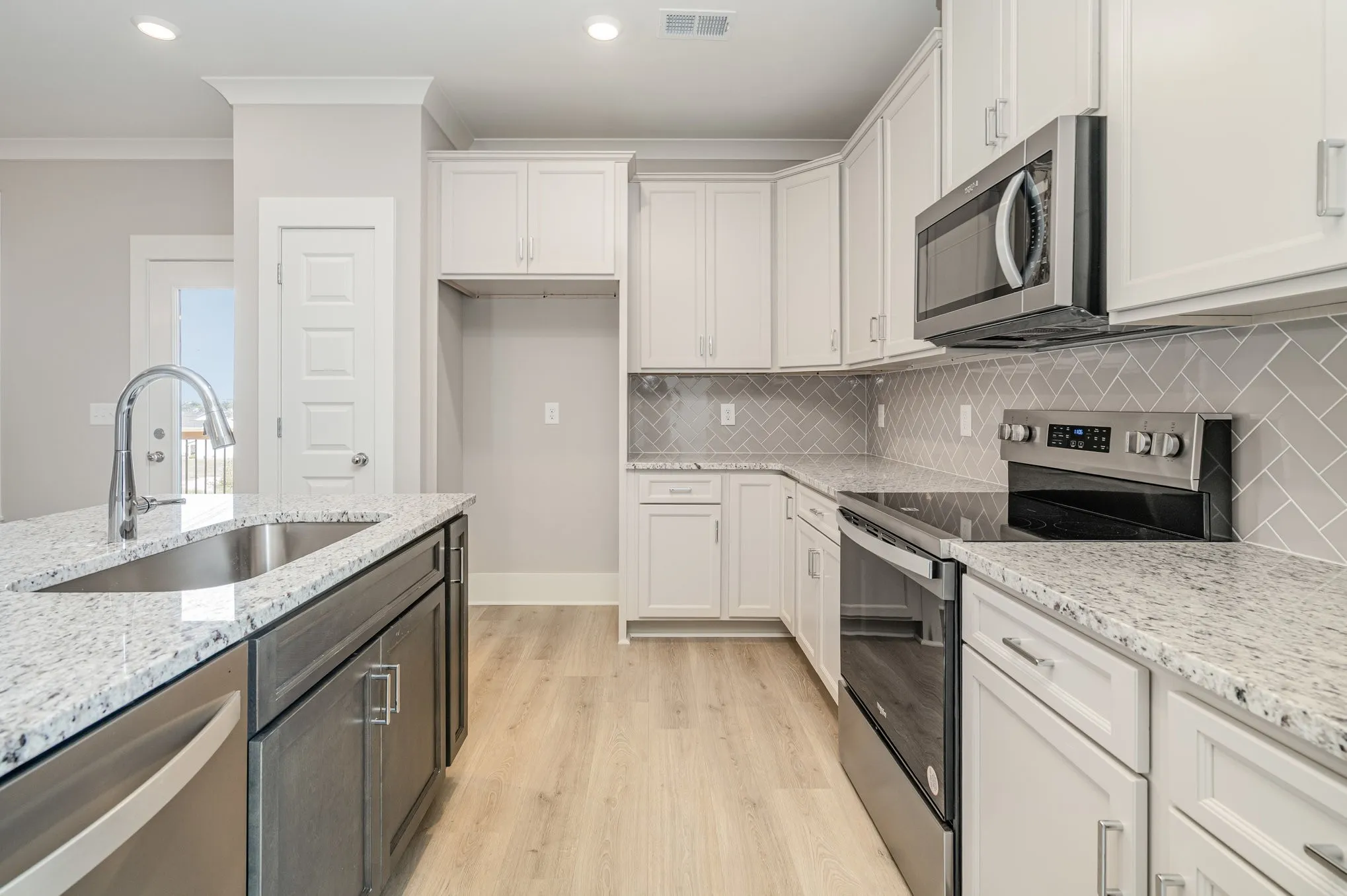 Main-level primary suite w/tiled shower & dual vanities. Eat-in kitchen features granite, SS appliances, soft-close cabinets & pantry. Extras: XL closets, camera doorbell, security system, and a large deck with tranquil views.