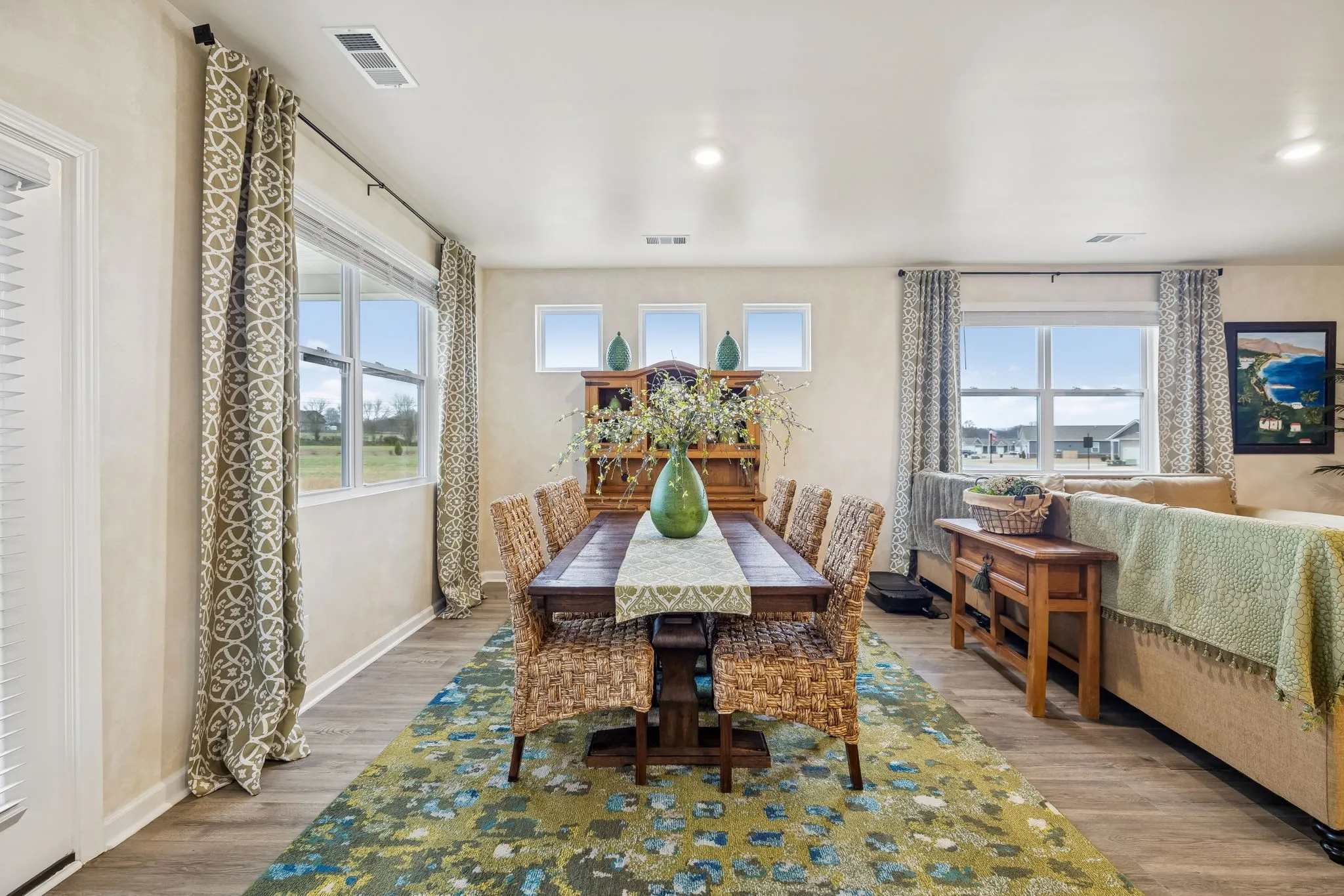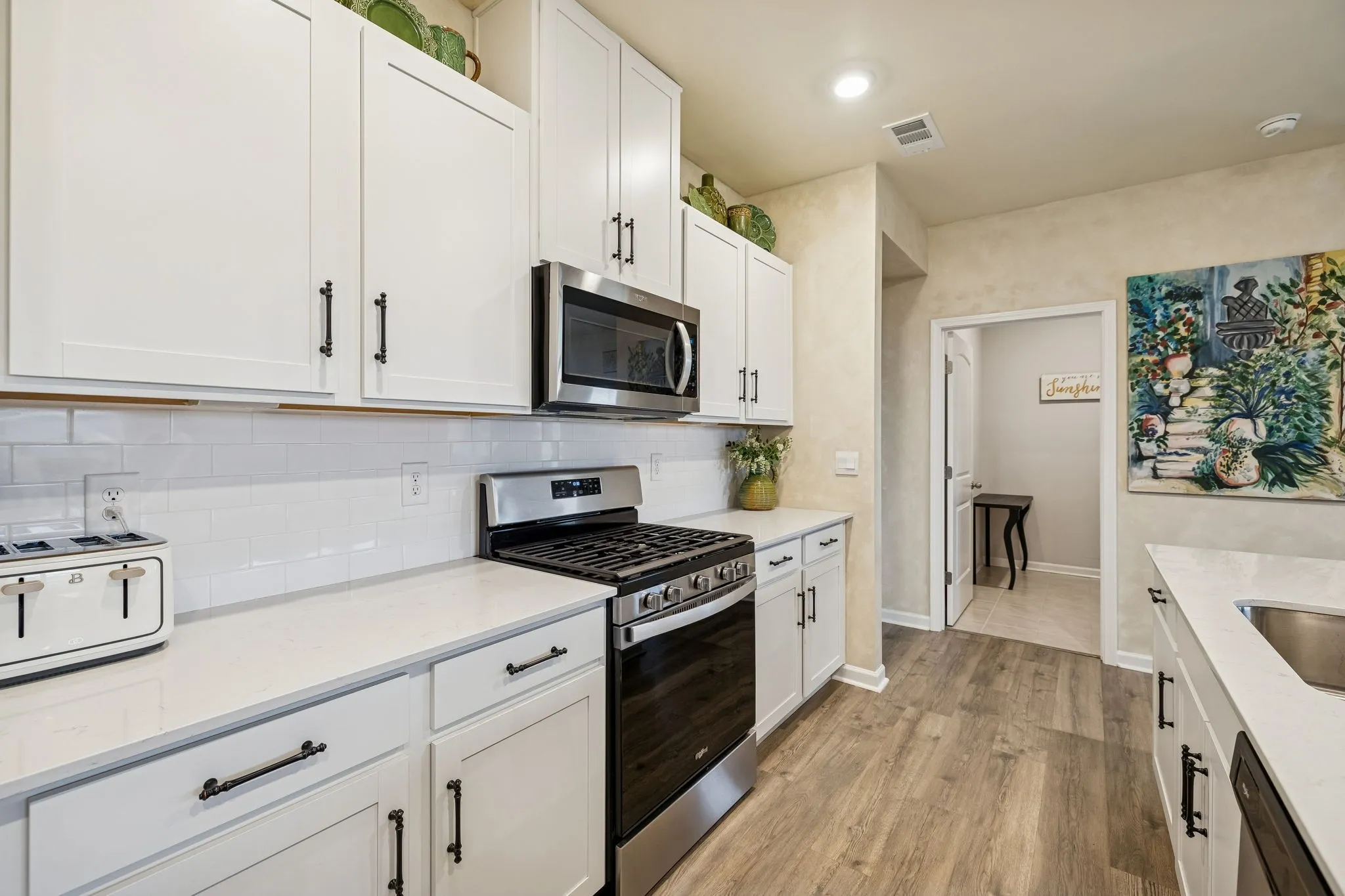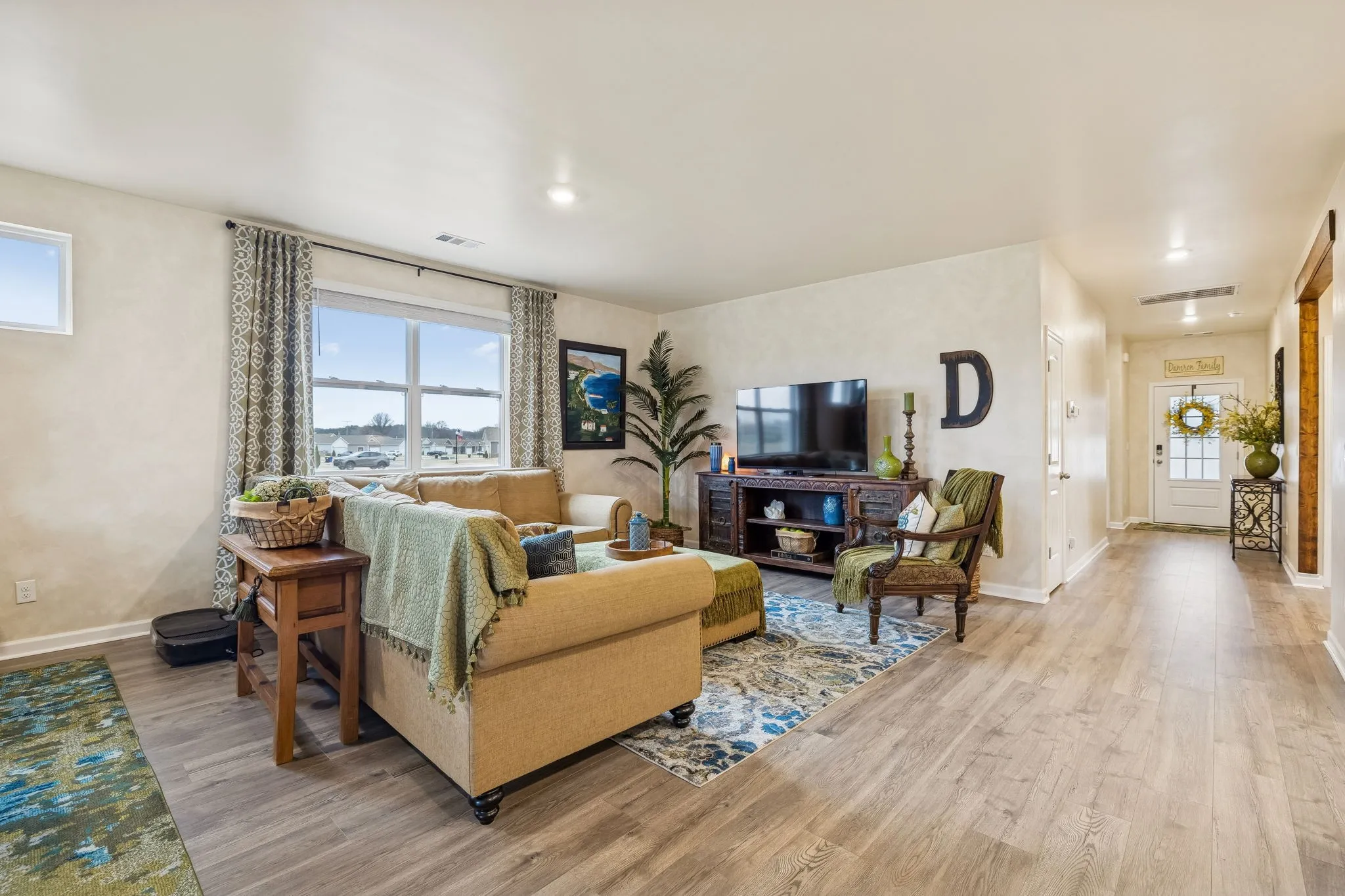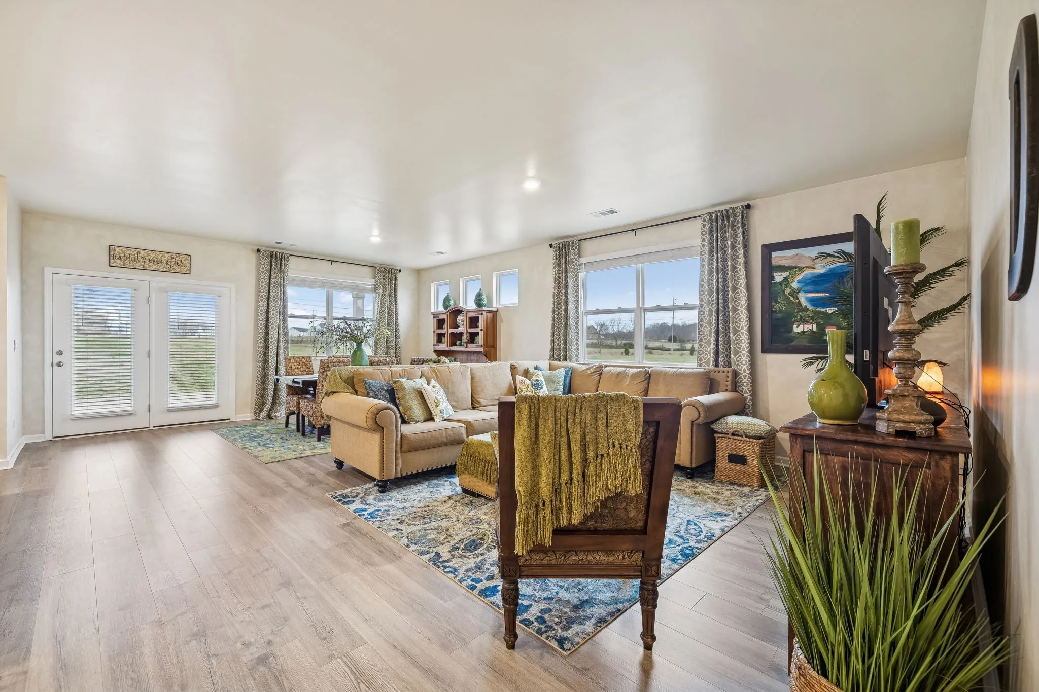 Experience better than new with the perfect blend of modern luxury & permanent tranquility in this sun-drenched home, featuring high-end finishes & an incredible park-like setting. The heart of the home is an expansive Great Room with enough space to seamlessly combine living, dining, and kitchen areas. The entryway & Great Room feature sophisticated Italian plaster-like paint, giving the home a unique, designer feel. This home is move-in ready with recently painted walls & ceilings, complemented by durable, laminate flooring. Architectural character is found throughout, including stained wood casing over hallway openings and a beautiful stairway half-wall. The kitchen is a chef’s dream, stylishly appointed with beautiful white Quartz countertops, all-white cabinets with oil-bronzed pulls, & an under-mount stainless steel sink. A roomy walk-in pantry provides excellent organization for all your culinary needs. The Primary Suite serves as a true retreat, offering enough space for a private sitting area. It features massive “his and hers” walk-in closets & a bathroom with a separate toilet for added privacy. Upstairs, a huge loft provides a versatile second living space, it could be a 4th bedroom w/closet & unique walk-through access to a large attic storage area. The backyard is a private sanctuary designed for relaxation. Elegant French doors lead you to a beautiful park-like atmosphere. Enjoy peaceful, permanent scenery with views of a berm & stunning all 4 seasons from both your front & back windows that will never be built on. Additionally, you can relax on either the front or back covered porches regardless of the weather. Storage is a standout feature of this home, including three separate hallway closets—one of which is a dedicated walk-in storage space—plus a walk-in pantry & extensive upstairs storage BONUS-For those who love community amenities, the neighborhood pool & clubhouse is right across the street!