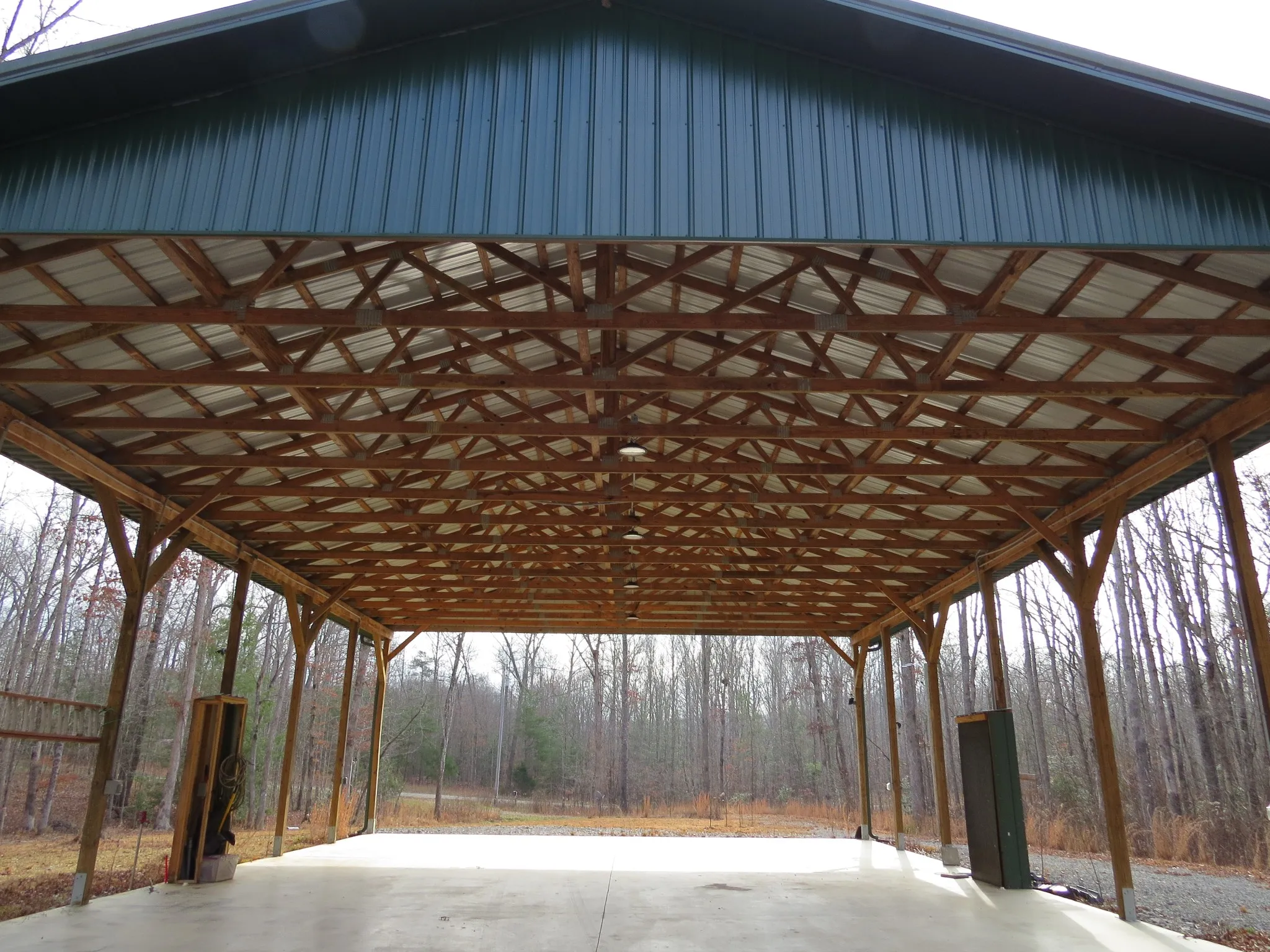 The property provides easy drive through access for any size RV or trailers, and full hookups for up to 3 RVs. Owner has selectively cleared and prepared the property, creating a nicely leveled lot with plenty of remaining wooded acreage for additional enjoyment. Concrete floor with LED lighting, 60×40 pavilion with 16’ walls provides covered parking for 2 RV’s. Separate 50 & 30 amp hookups on each side, county water and RV septic access 120v outlets throughout building for easy outdoor access. Third RV site located near 2nd driveway entrance also with full services.