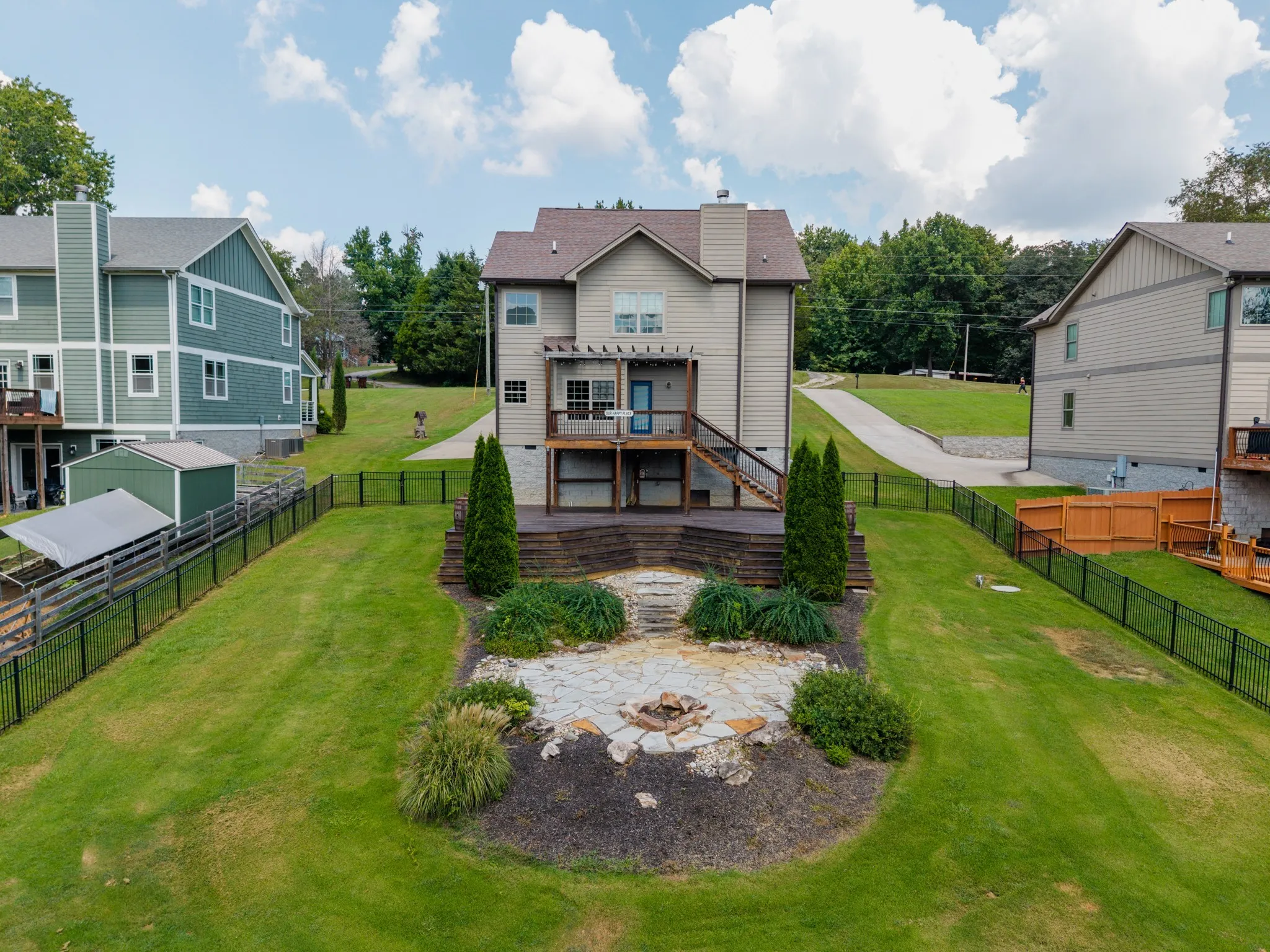 Out back, enjoy a fully fenced yard and three distinct outdoor living spaces: an upper deck for dining, a spacious lower deck for entertaining, and a flagstone patio with a built-in fire pit. The shared dock is just a short walk away and includes water, electricity, and your own 17×32’ private slip with space for a jet ski pad.