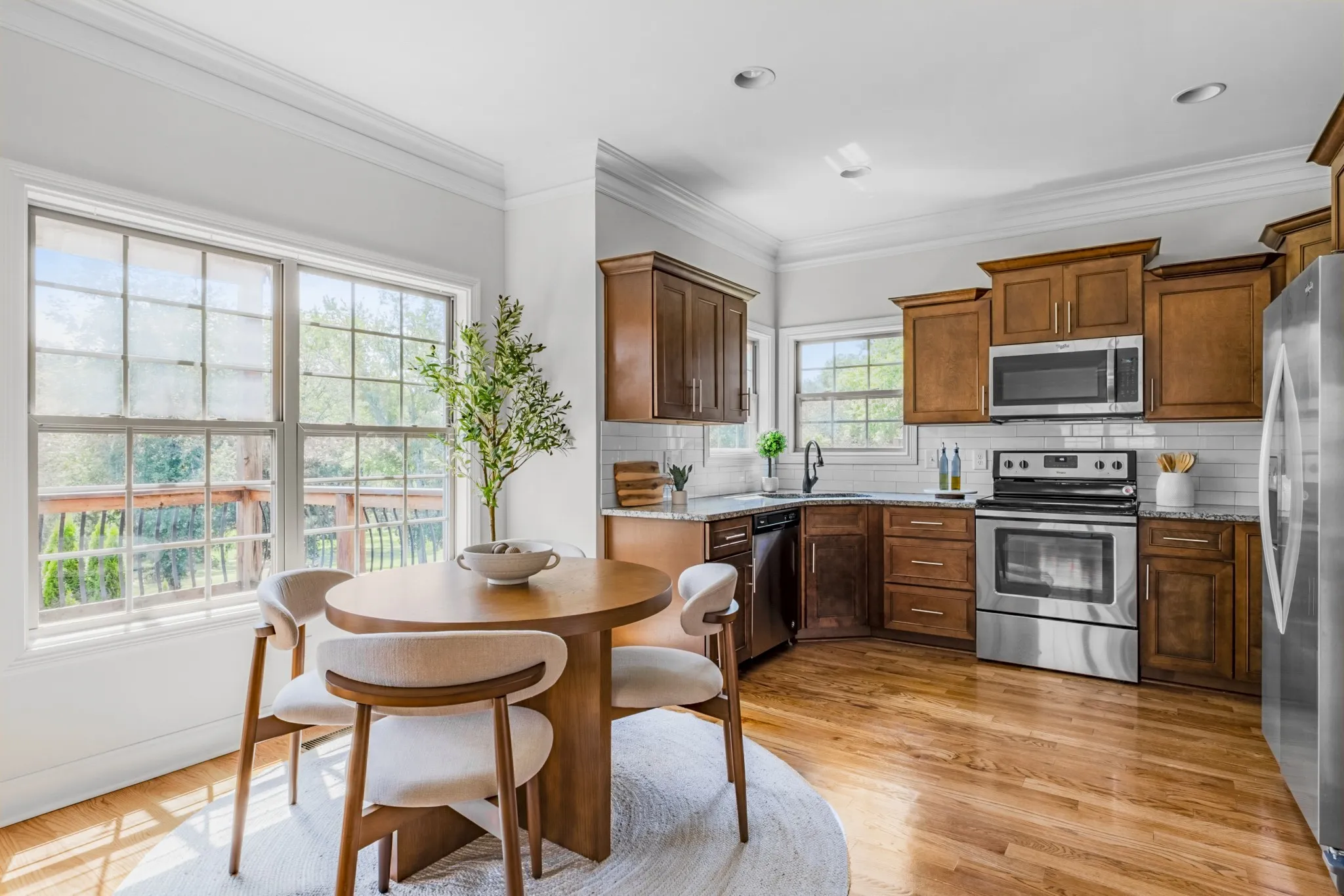 The main level features real hardwood floors, tall ceilings, and large windows that bring in tons of natural light. The kitchen includes a casual eat-in nook and a formal dining room, perfect for everyday living or hosting. A dedicated office near the front of the home offers privacy for remote work or creative projects. The main living room flows easily onto the upper deck, making outdoor entertaining a breeze.