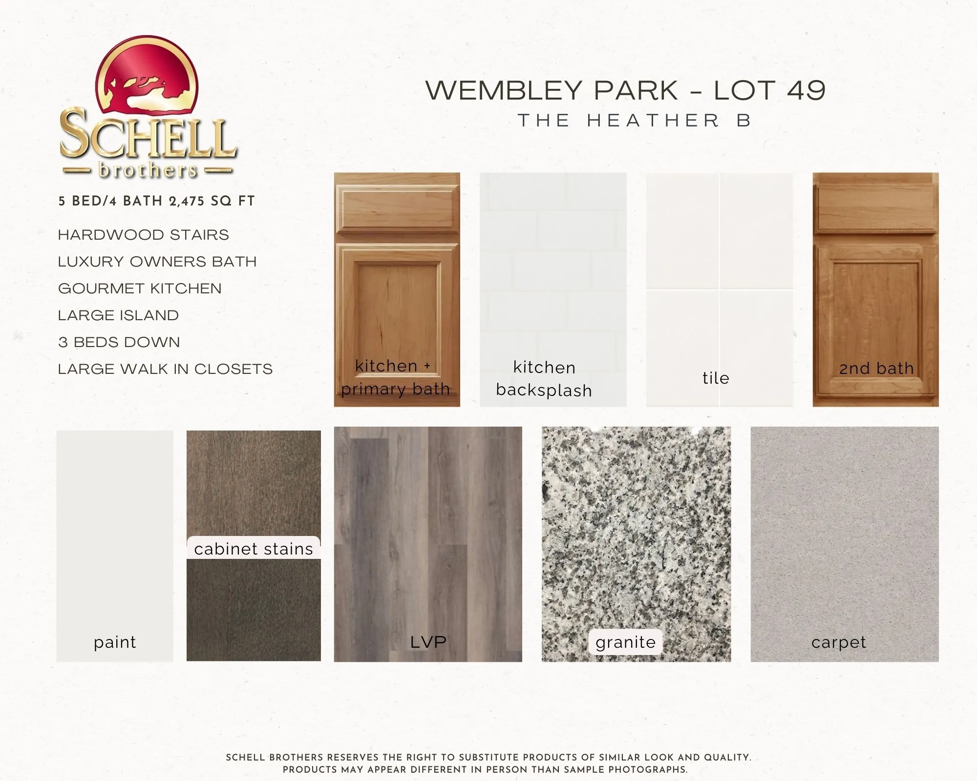 Welcome to the Heather floorplan by Schell Brothers in Wembley Park. This open floorplan features a spacious great room and dining room, a Gourmet kitchen, with an oversized island, cooktop, wall oven, all GE appliances – and refrigerator included! This home has an Owners suite downstairs, with a tray ceiling, double owners walk in closets, and a luxury owner’s en-suite bathroom – featuring a large walk-in shower, linen closet and double sink vanity. Laundry, a powder bath and a mudroom, and 2 more bedrooms on the main level make this floorplan extremely versatile for any family.