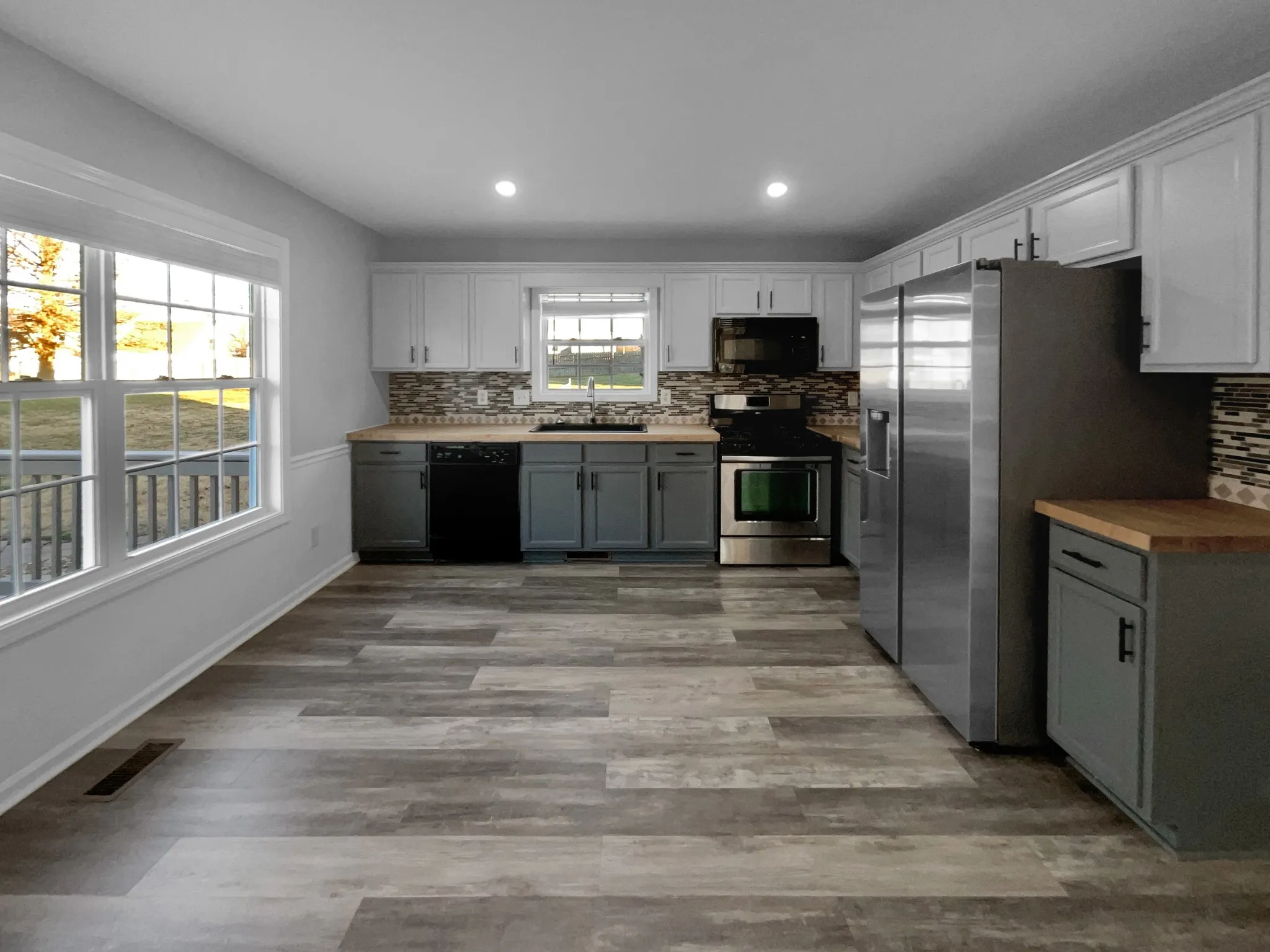 The large eat-in kitchen includes a full appliance package and eye-catching backsplash.