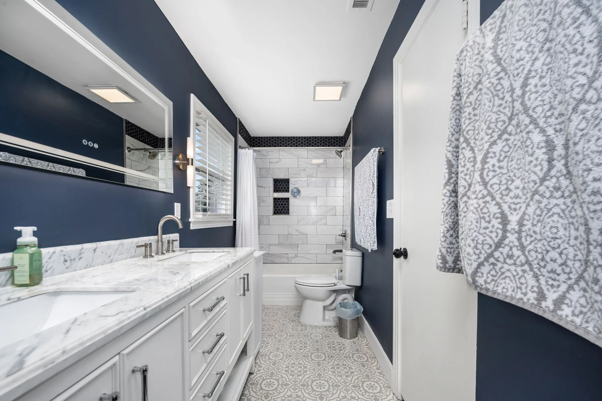 Primary Bath: New Tiled Shower/Bath Combo, Double Vanity & Tile Floor